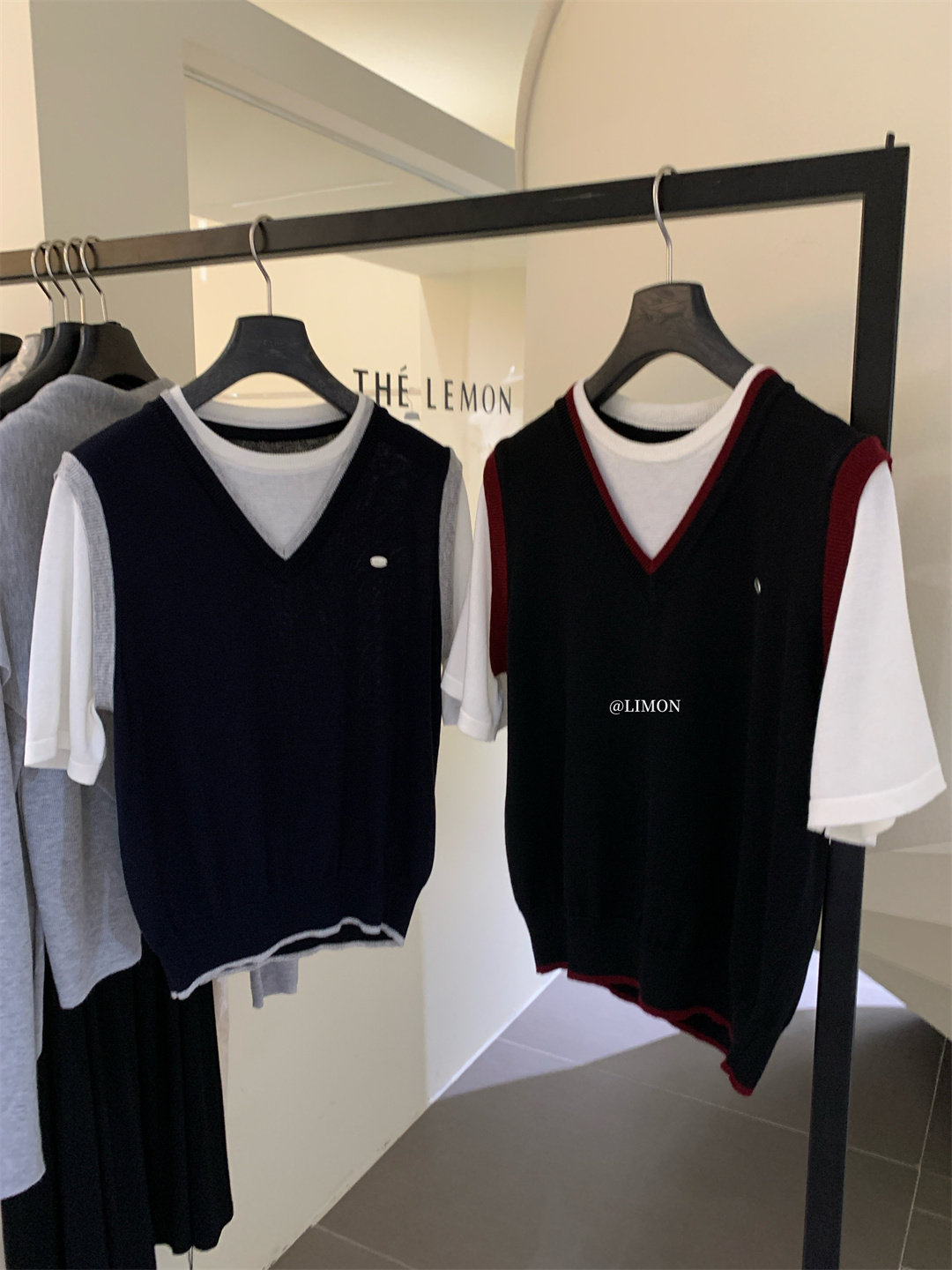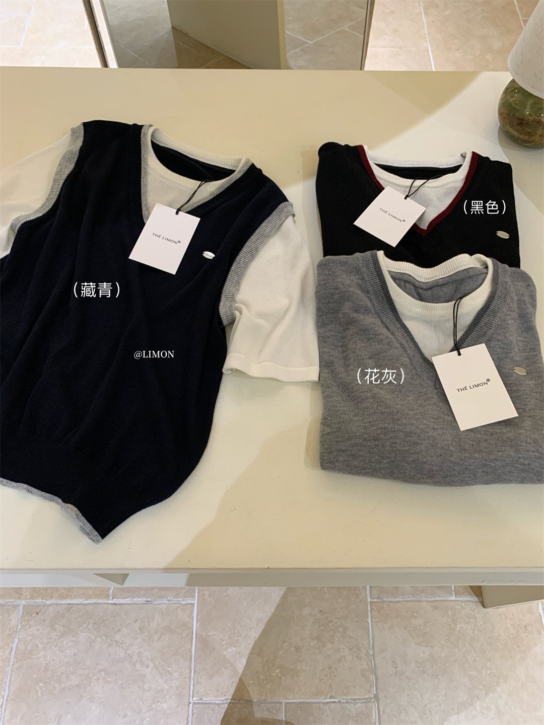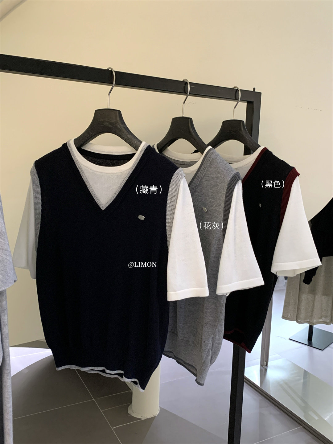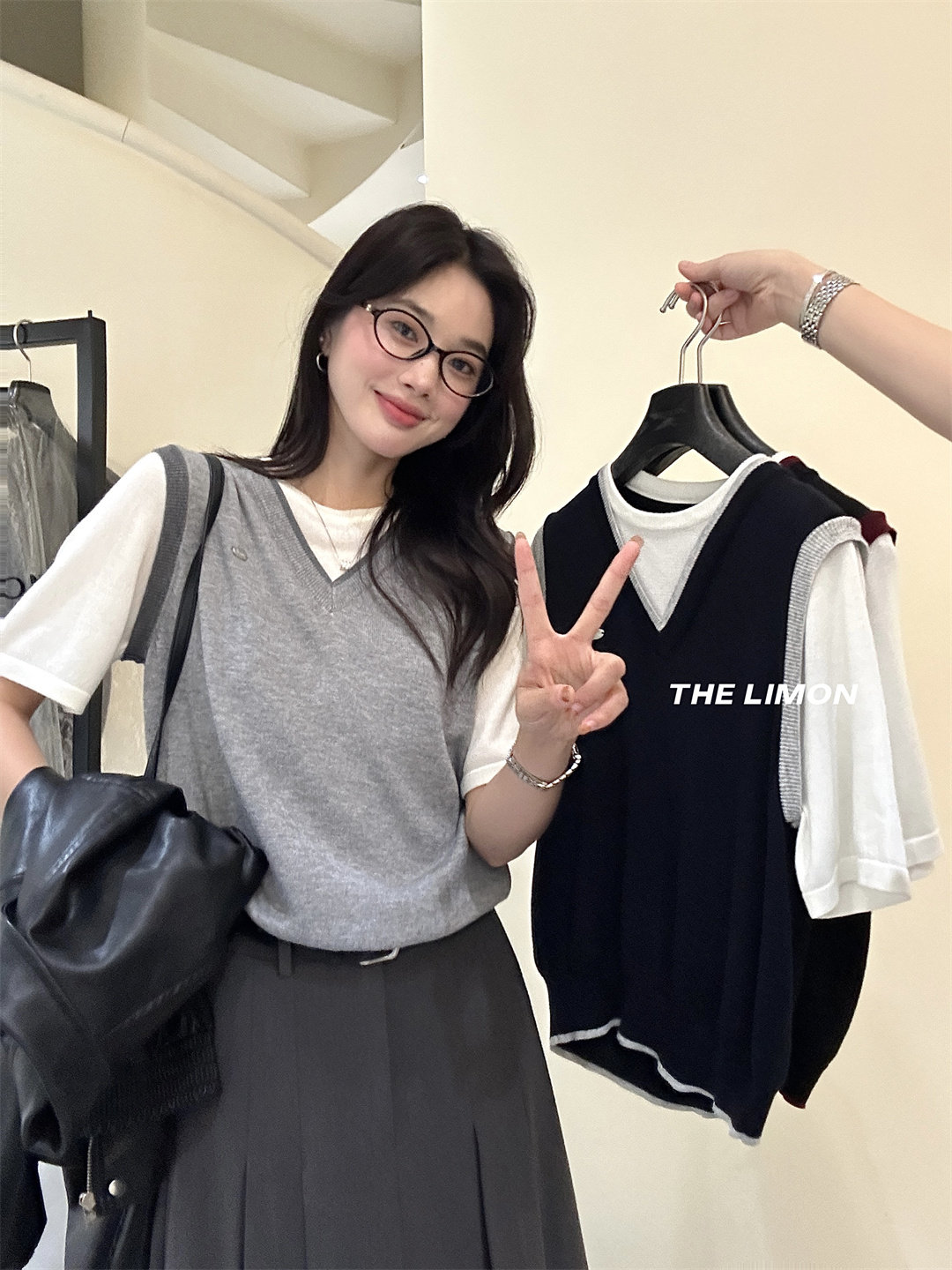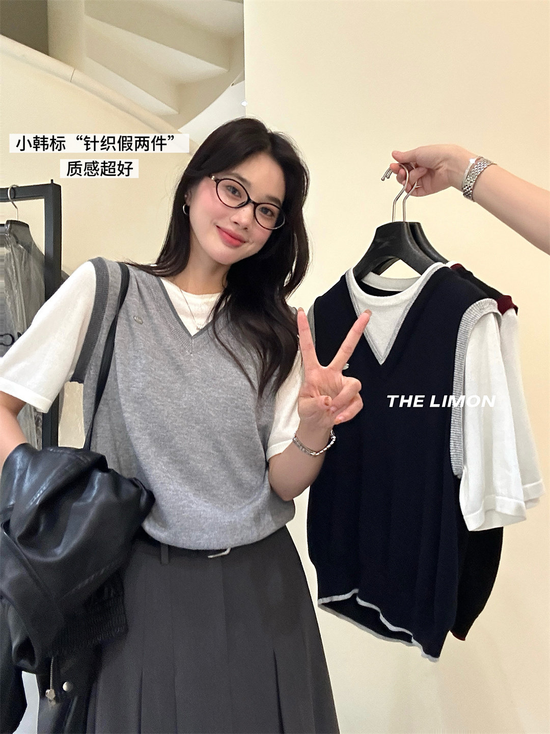 Designed with Contrasting Colors, a Fake Two-Piece Knitted Vest with Short-Sleeved T-Shirt for Women, Suitable for Spring and Autumn, as an Inner Layer or Base Layer, with a Preppy Style