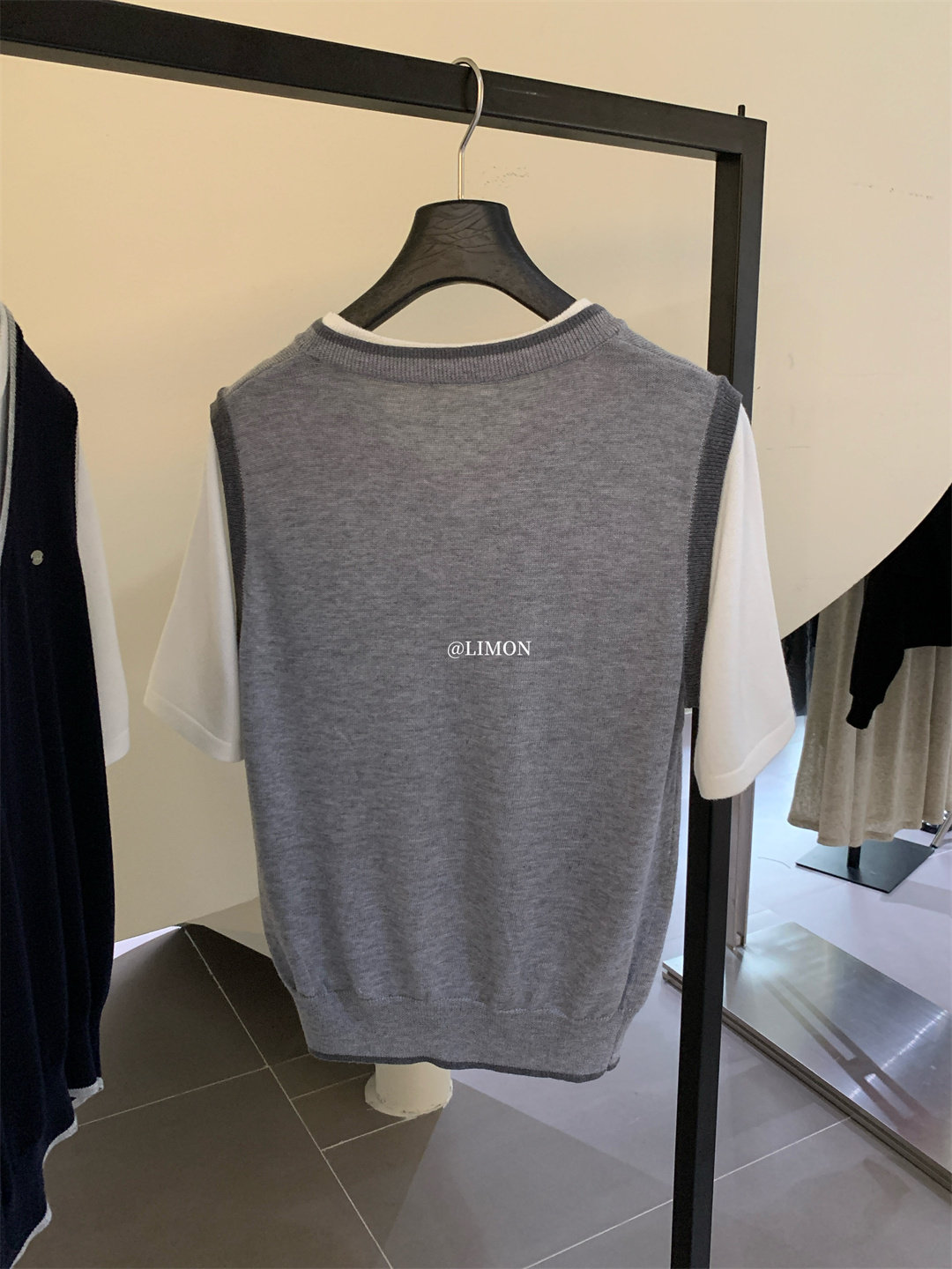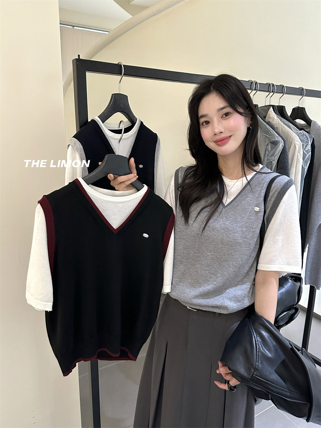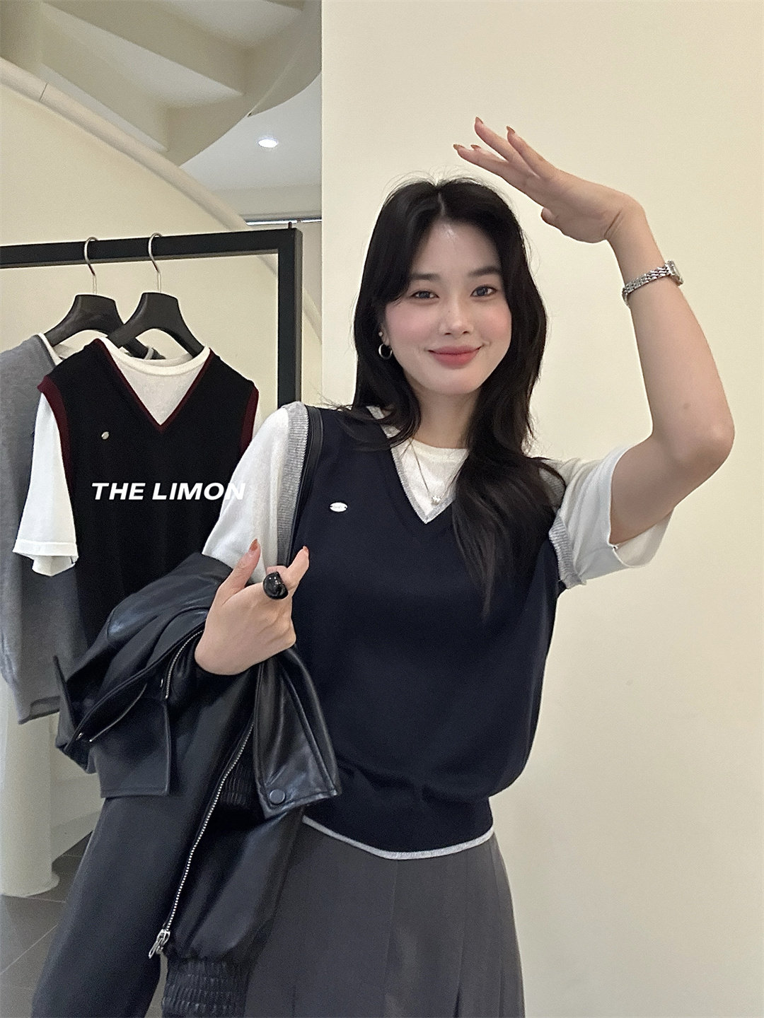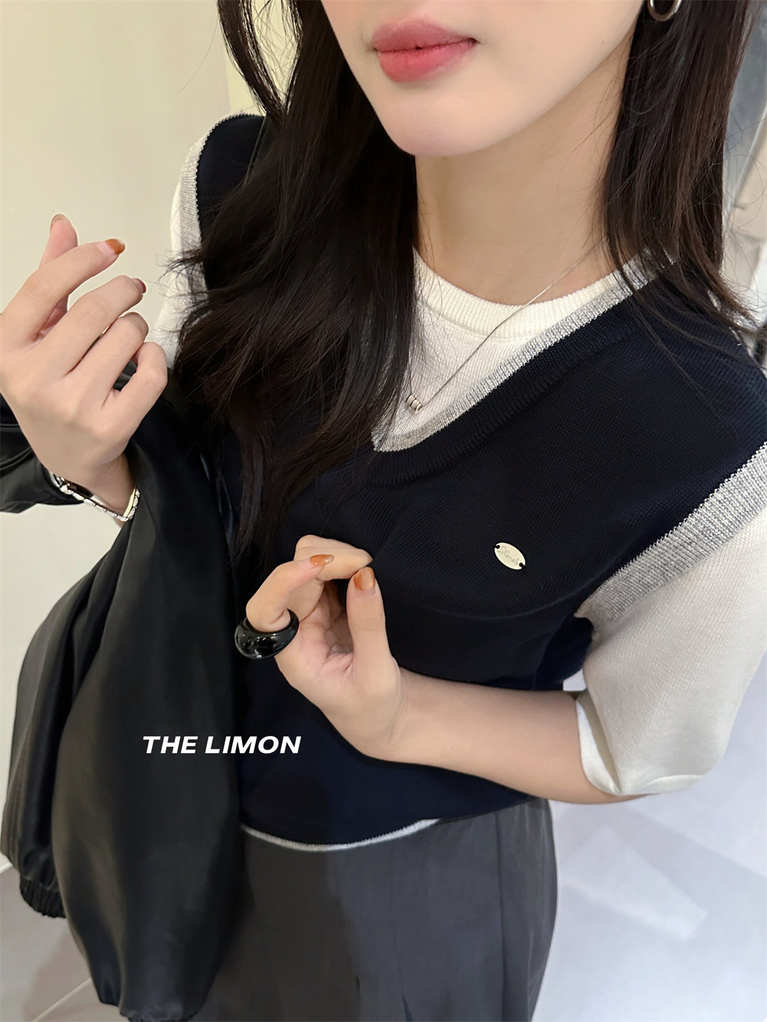 Designed with Contrasting Colors, a Fake Two-Piece Knitted Vest with Short-Sleeved T-Shirt for Women, Suitable for Spring and Autumn, as an Inner Layer or Base Layer, with a Preppy Style