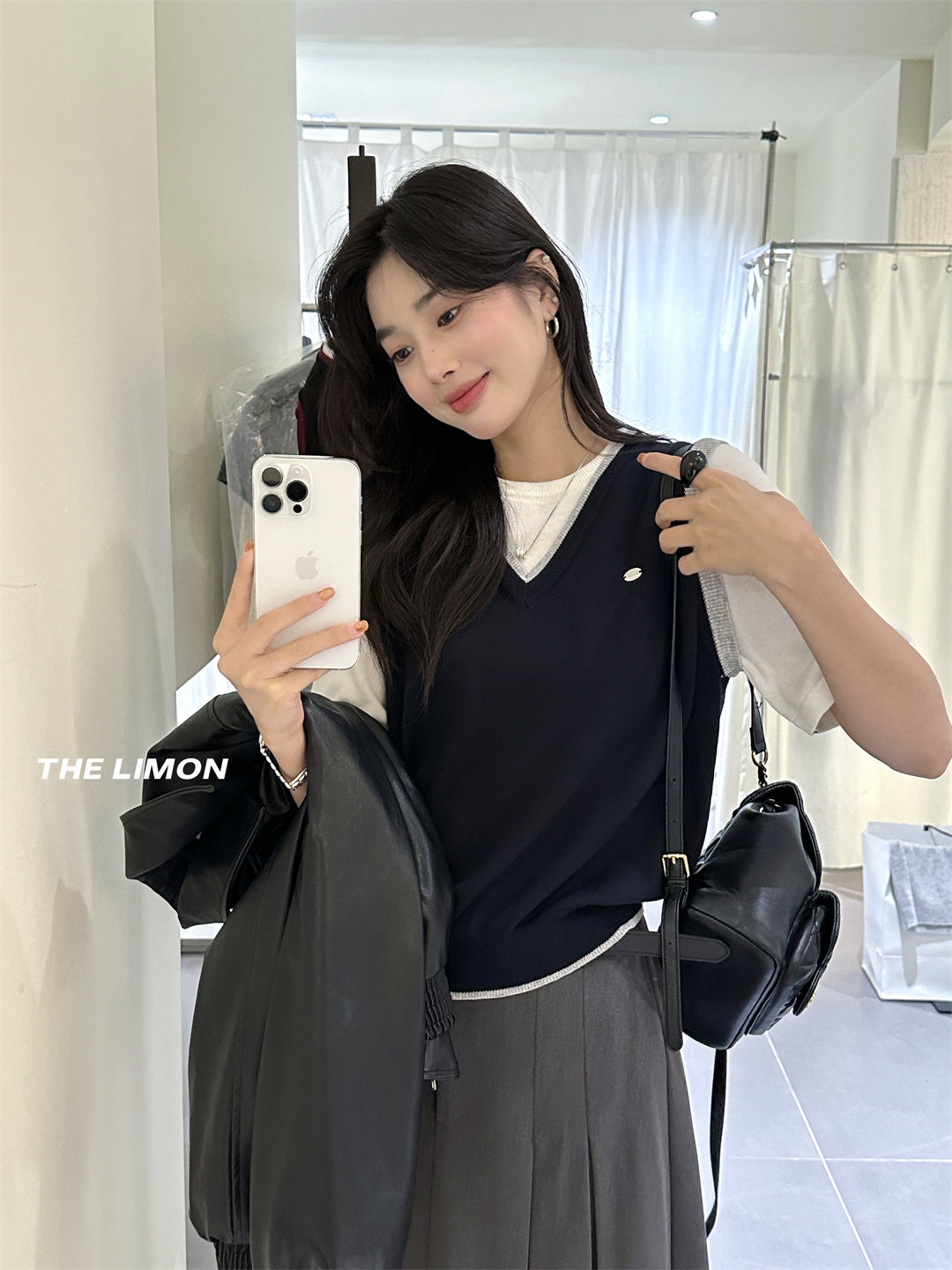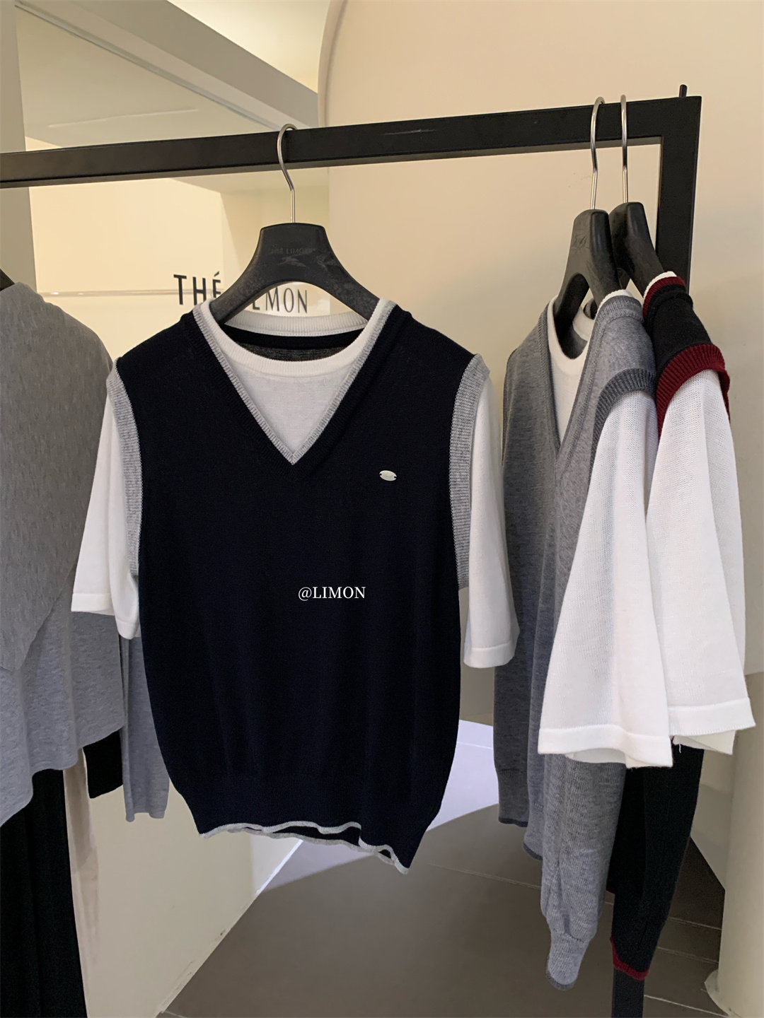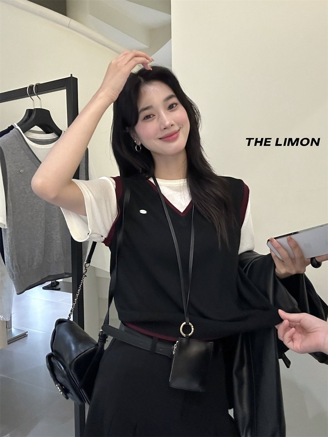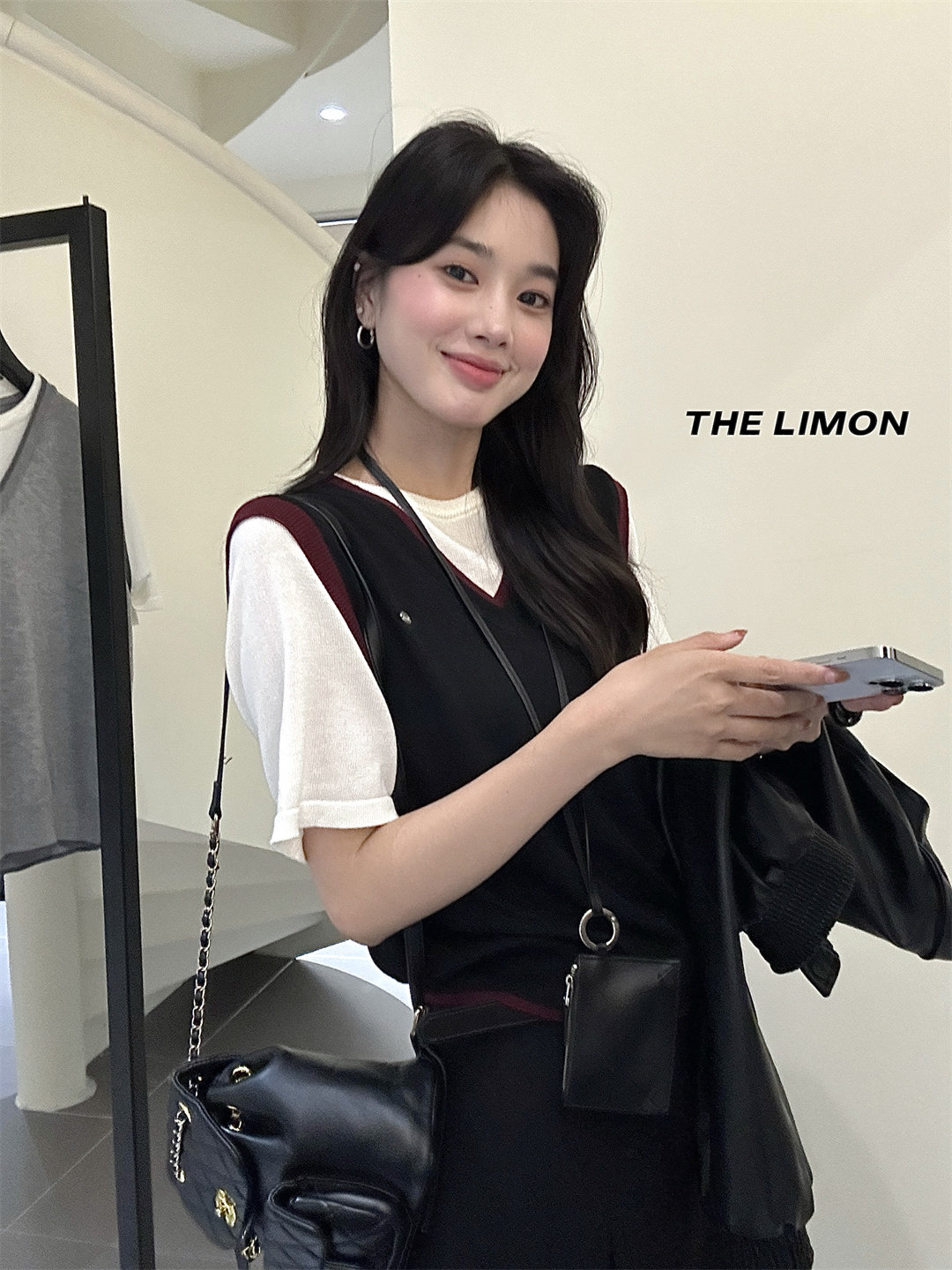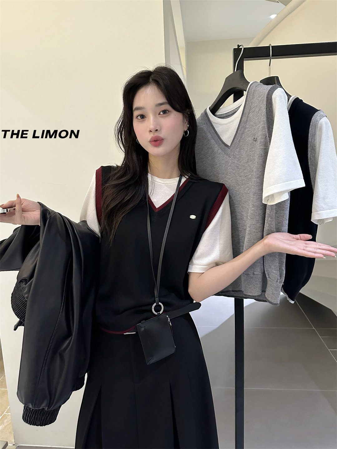 Designed with Contrasting Colors, a Fake Two-Piece Knitted Vest with Short-Sleeved T-Shirt for Women, Suitable for Spring and Autumn, as an Inner Layer or Base Layer, with a Preppy Style