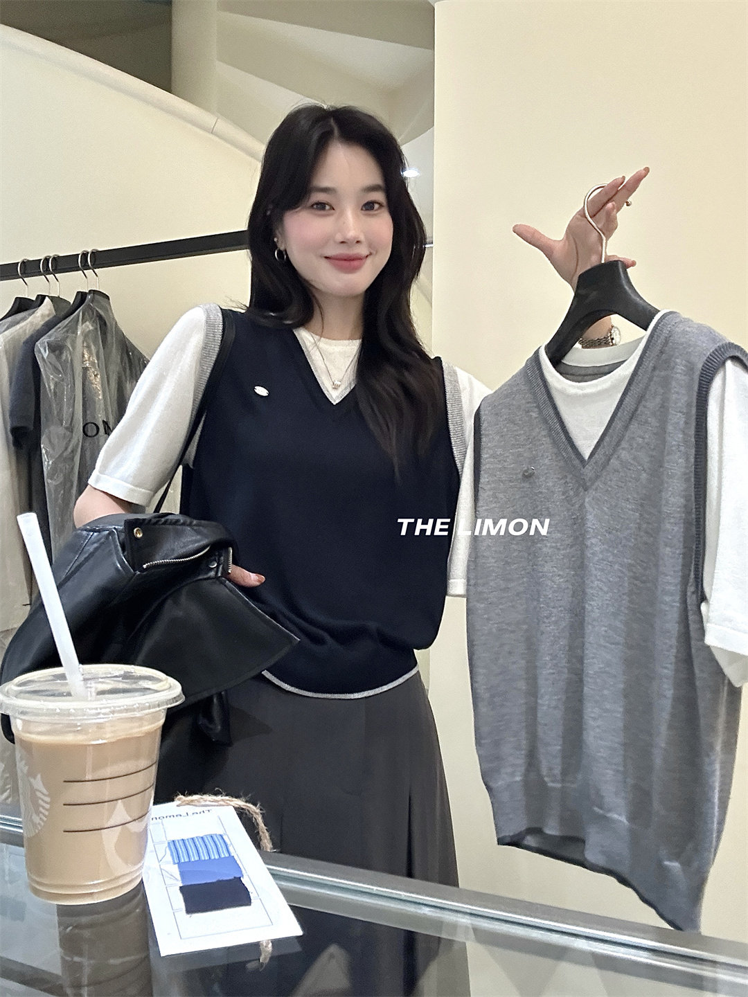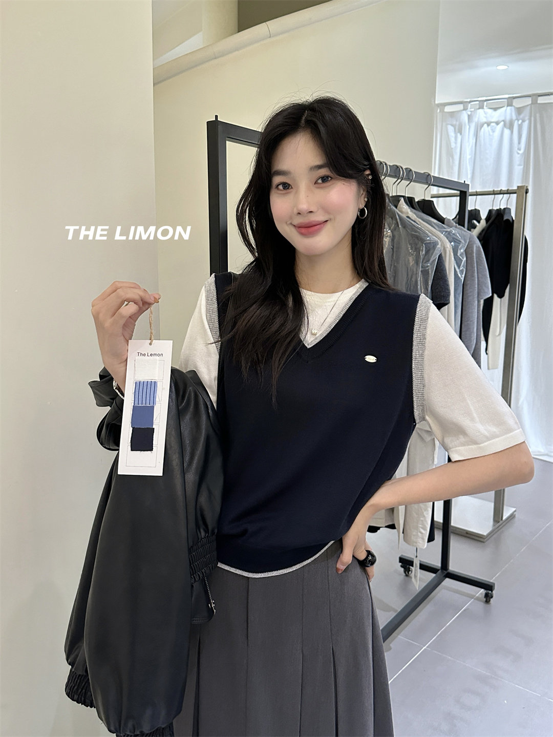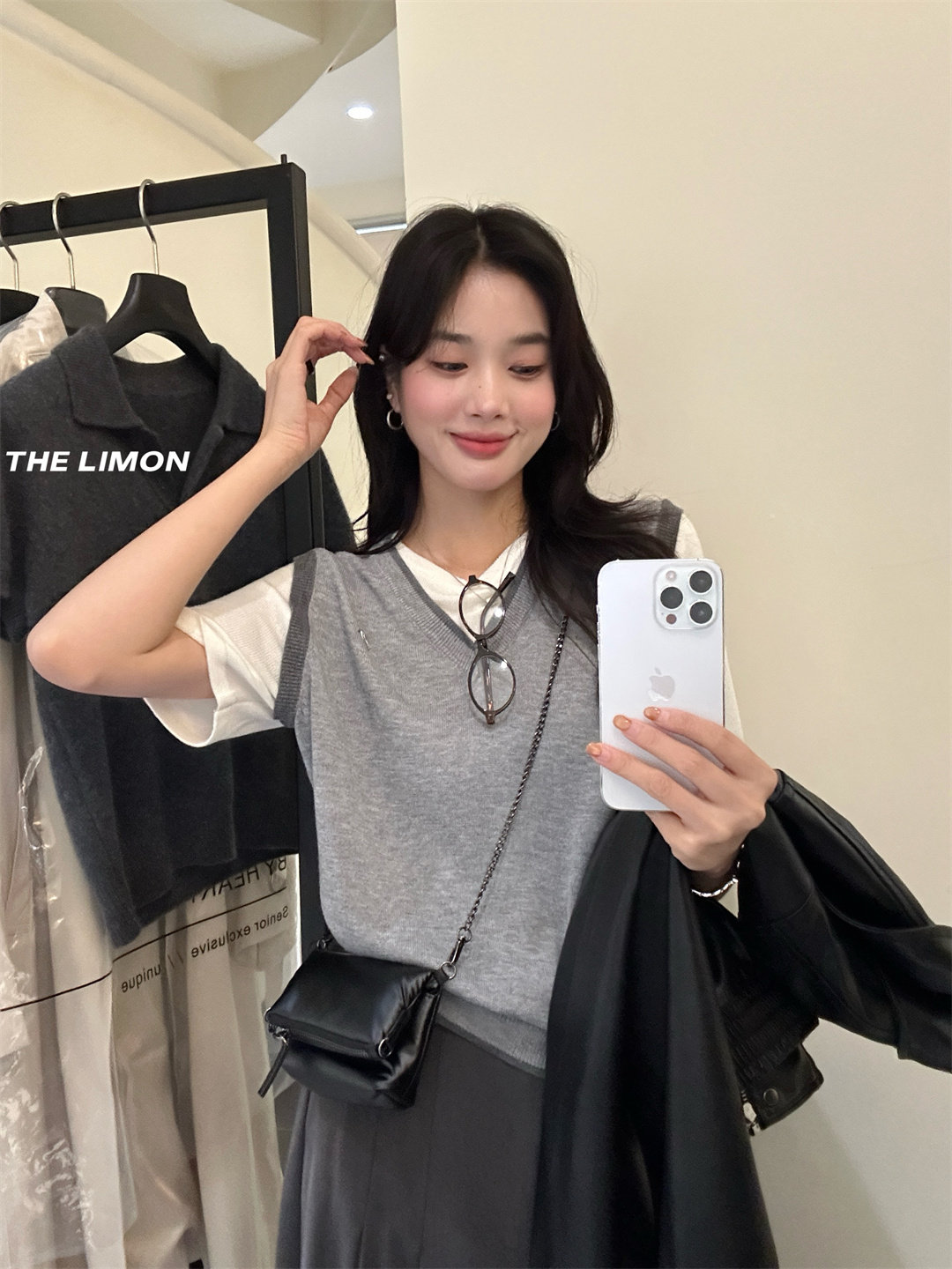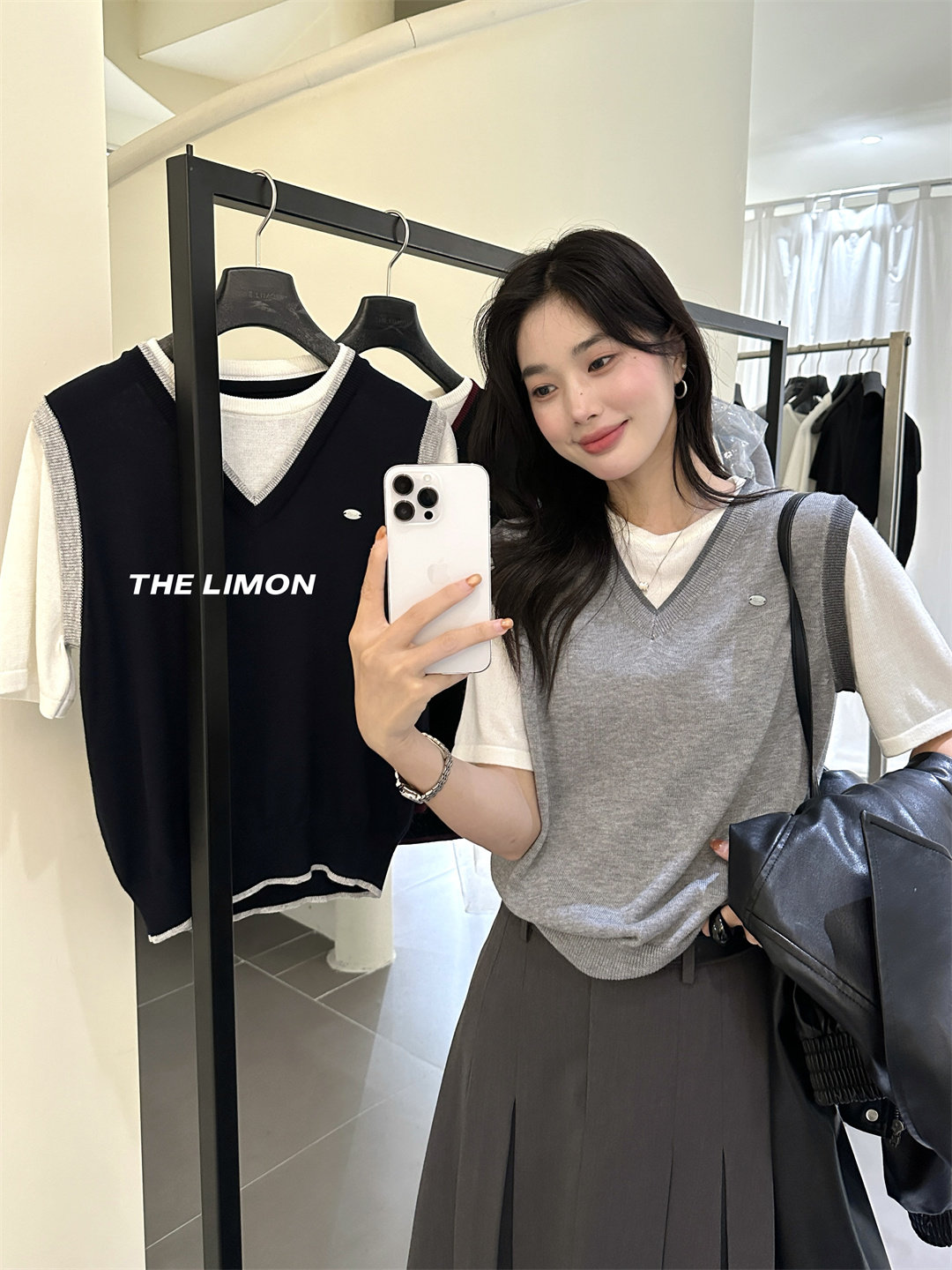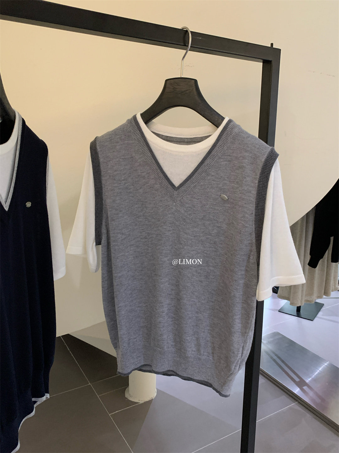 Designed with Contrasting Colors, a Fake Two-Piece Knitted Vest with Short-Sleeved T-Shirt for Women, Suitable for Spring and Autumn, as an Inner Layer or Base Layer, with a Preppy Style