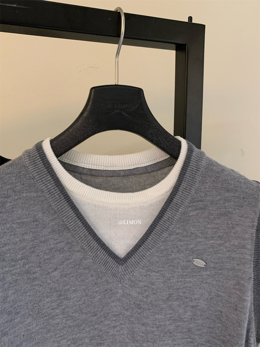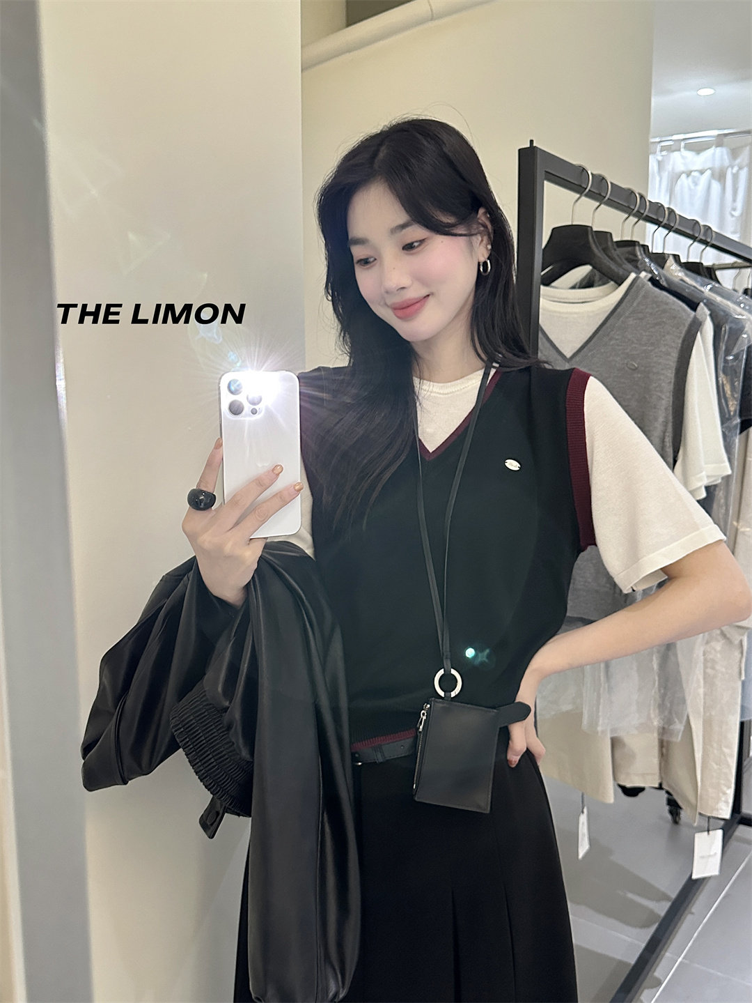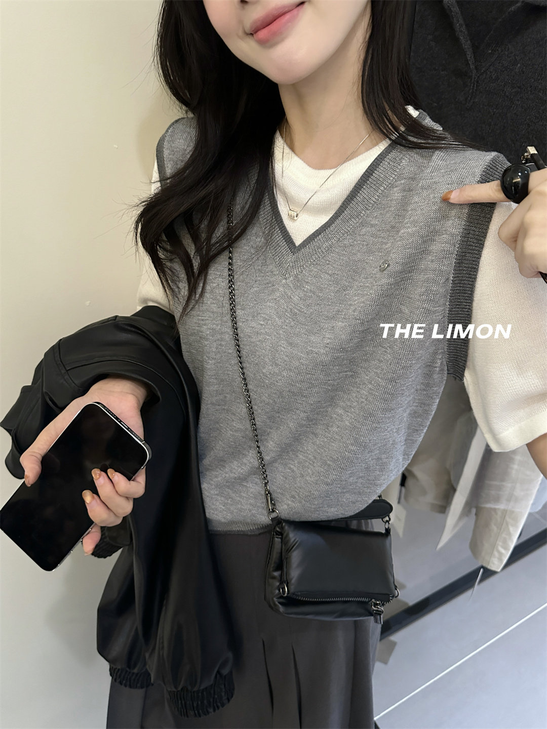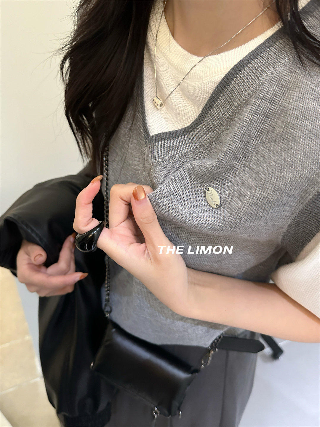 Designed with Contrasting Colors, a Fake Two-Piece Knitted Vest with Short-Sleeved T-Shirt for Women, Suitable for Spring and Autumn, as an Inner Layer or Base Layer, with a Preppy Style