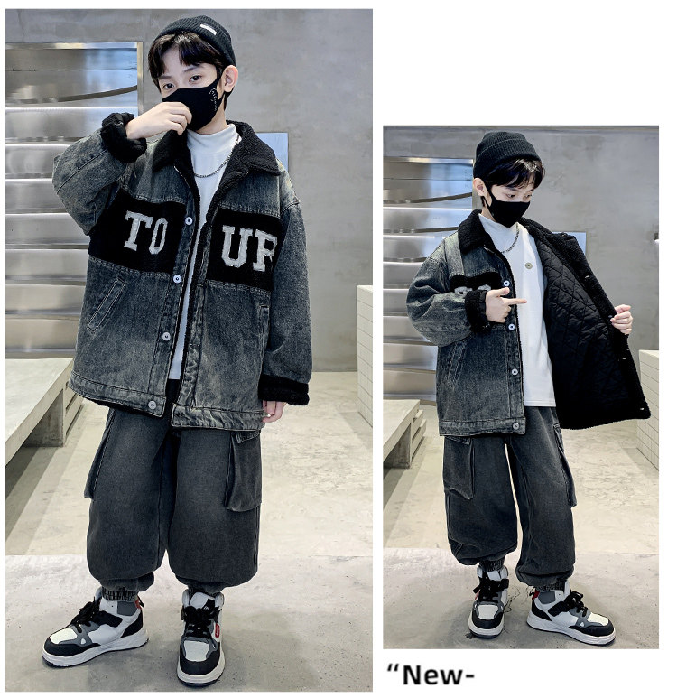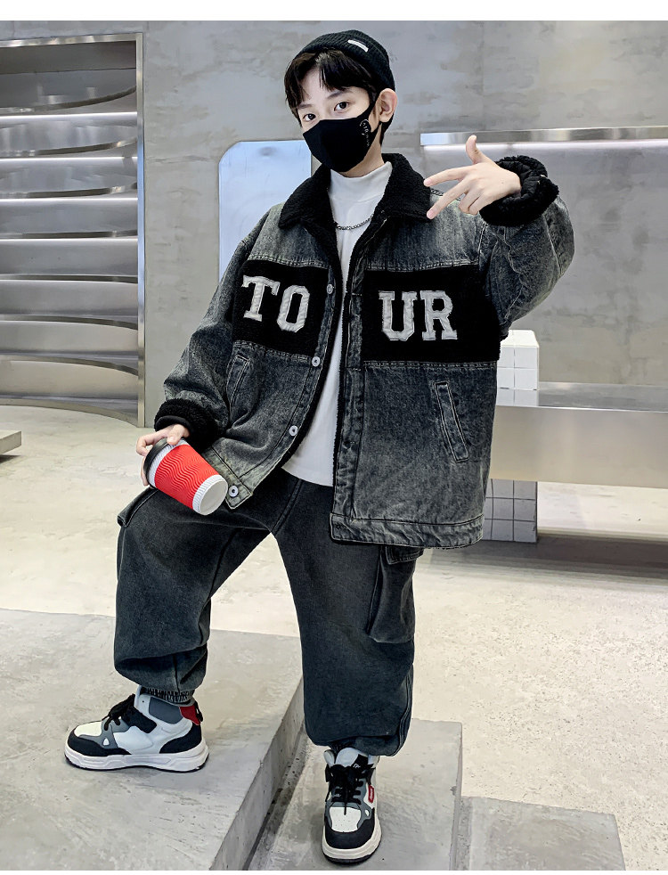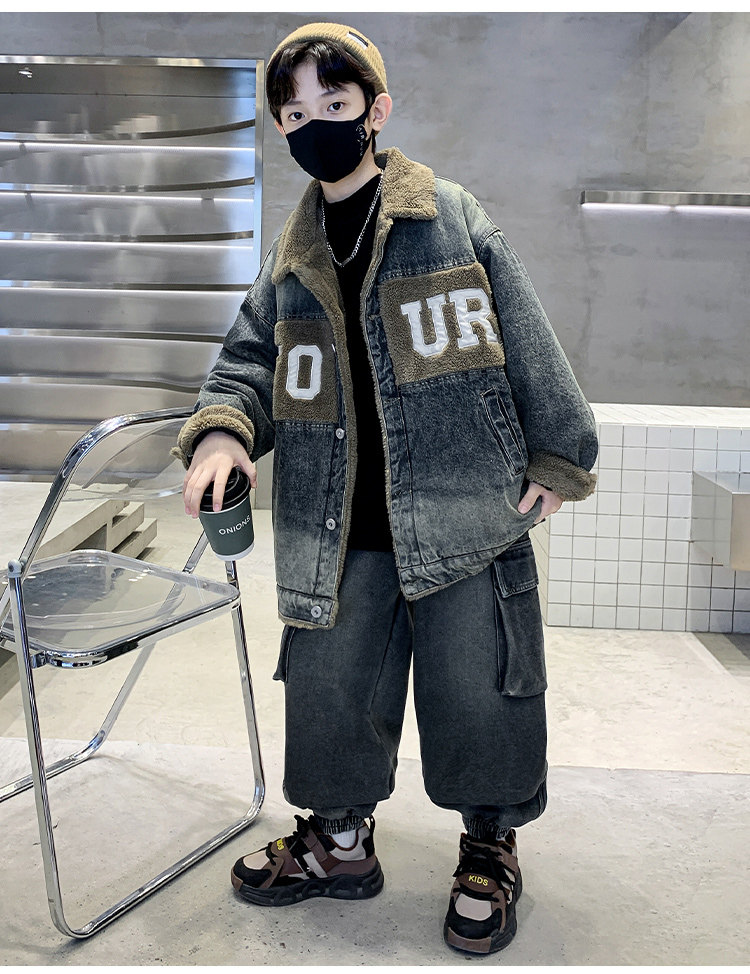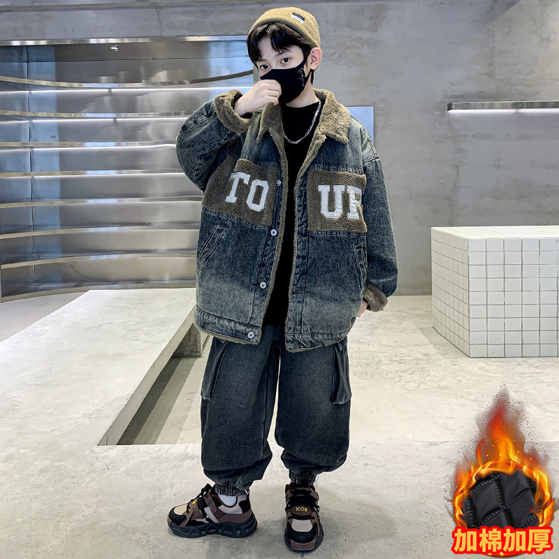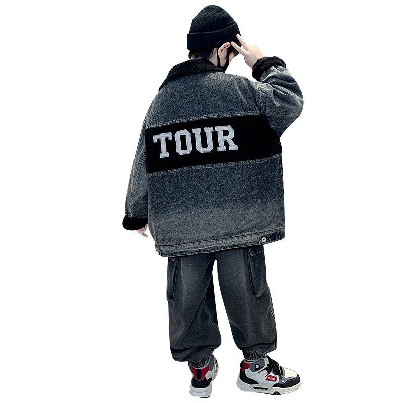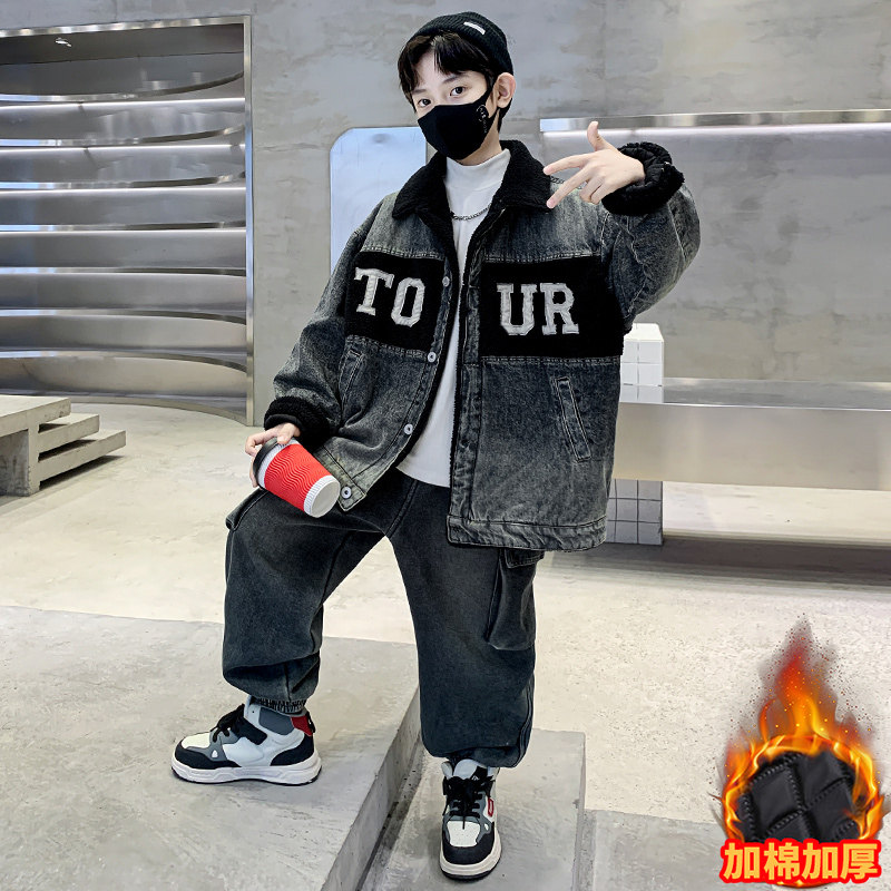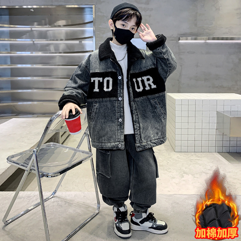 Boys' Winter Clothing Set 2025 New Style Boys' Padded Thickened Denim Jacket for Older Children Autumn and Winter Children's Clothing Trendy