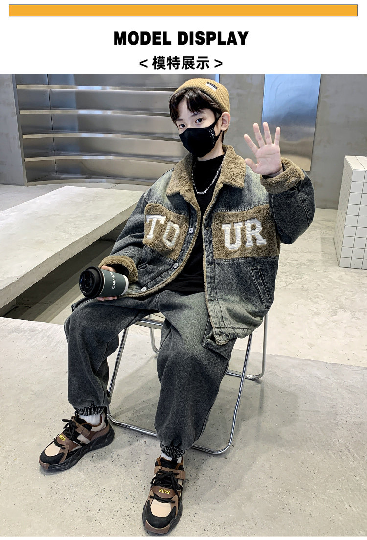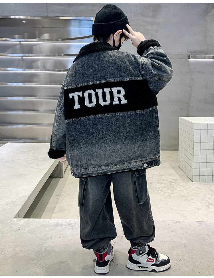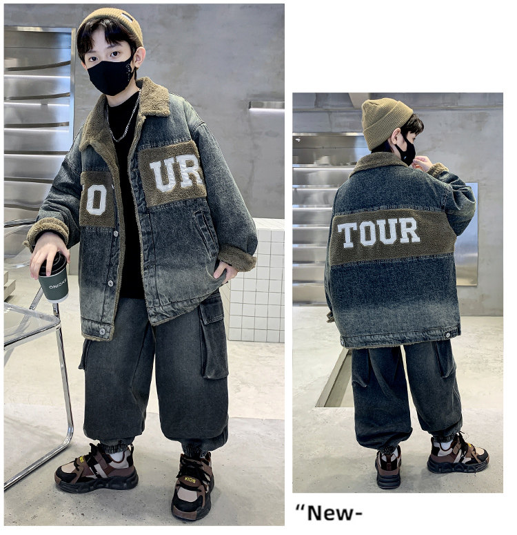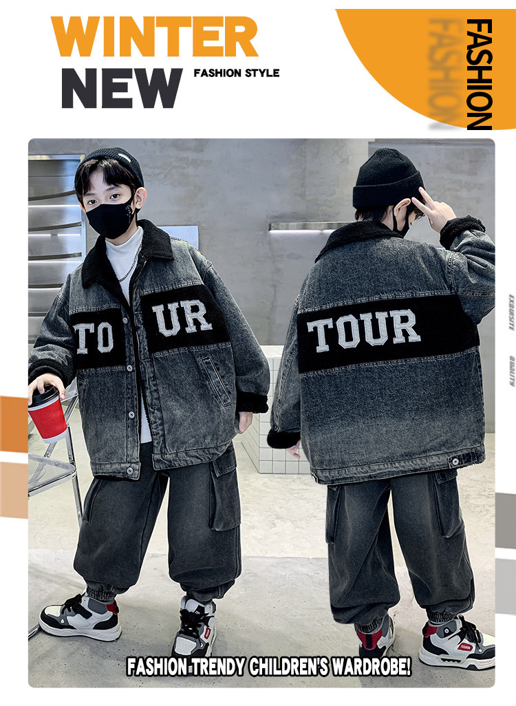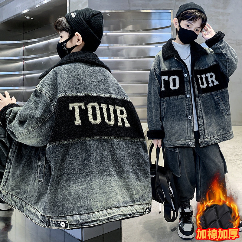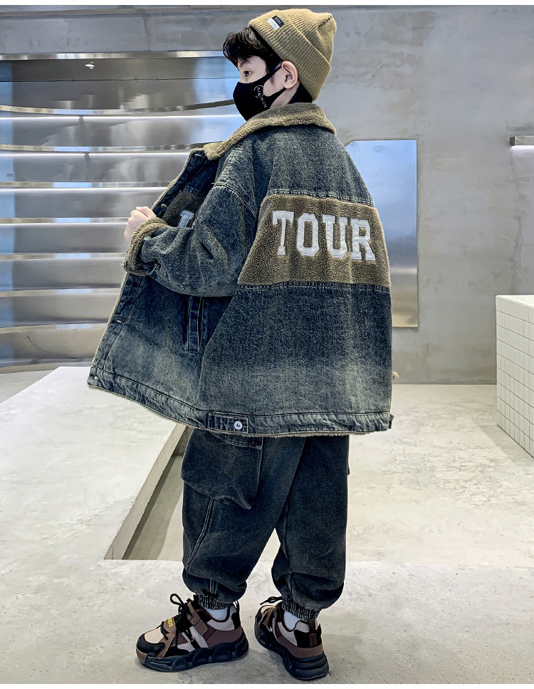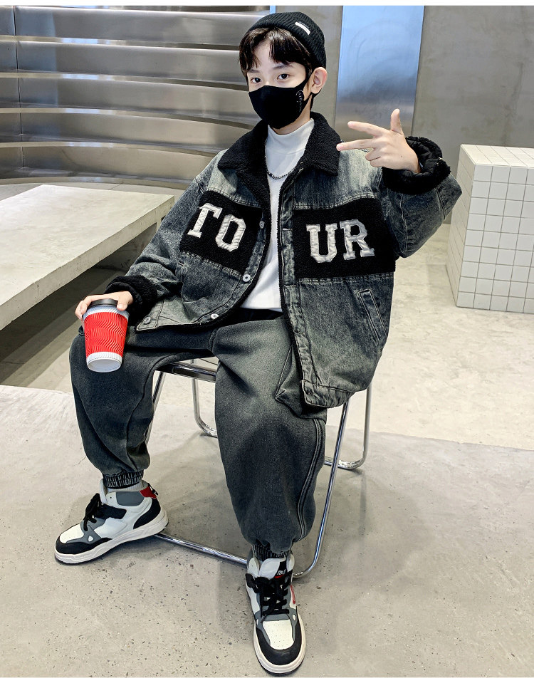Boys' Winter Clothing Set 2025 New Style Boys' Padded Thickened Denim Jacket for Older Children Autumn and Winter Children's Clothing Trendy