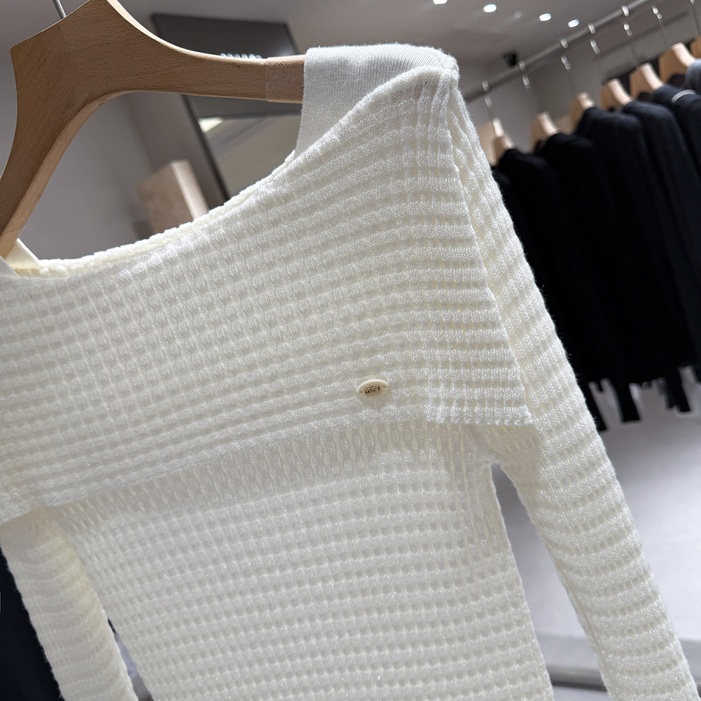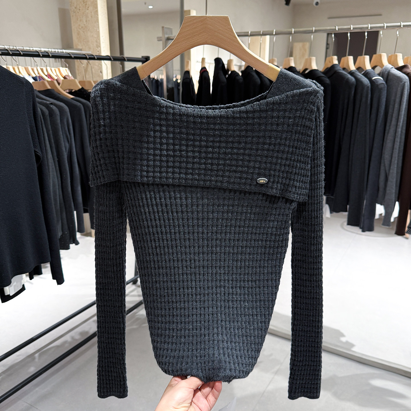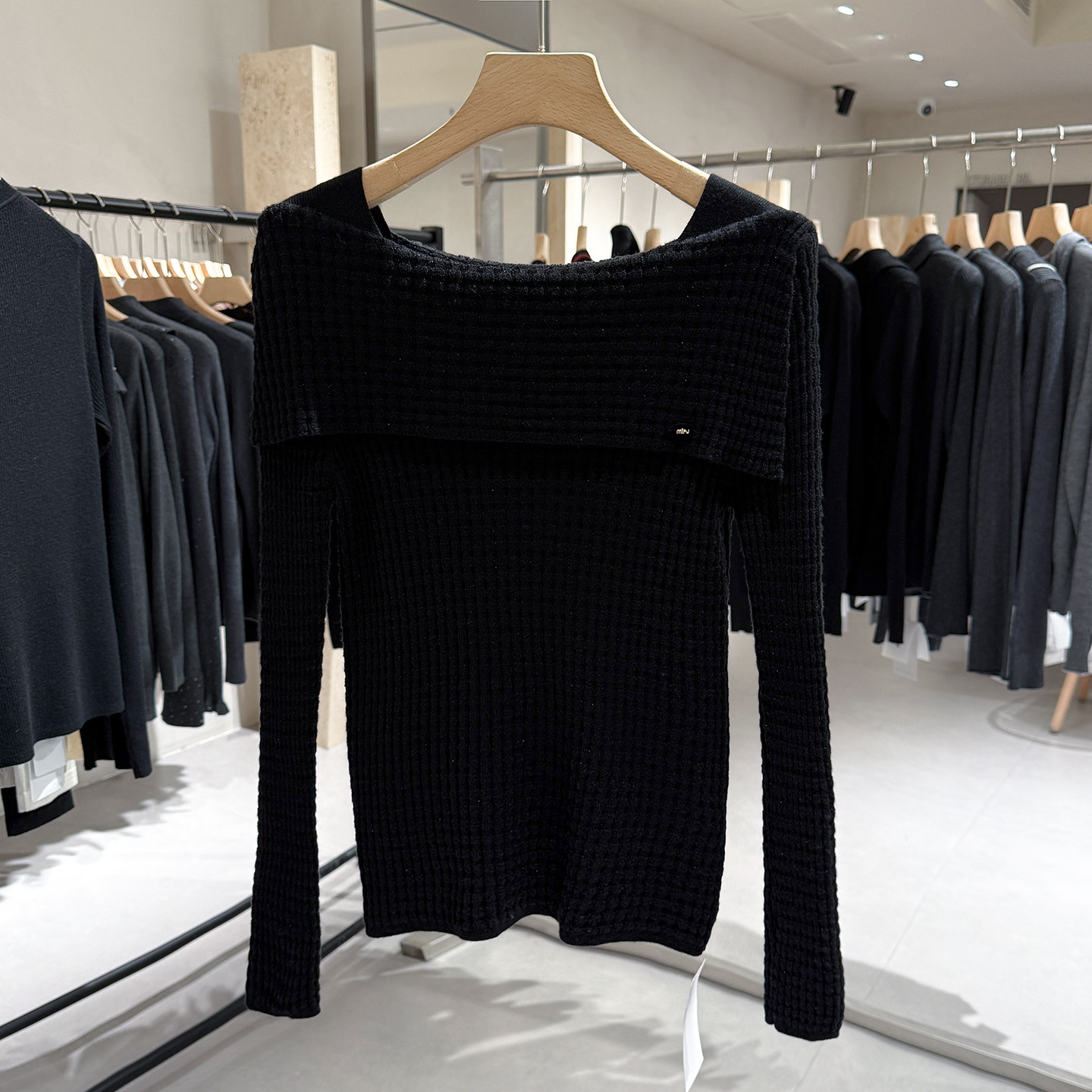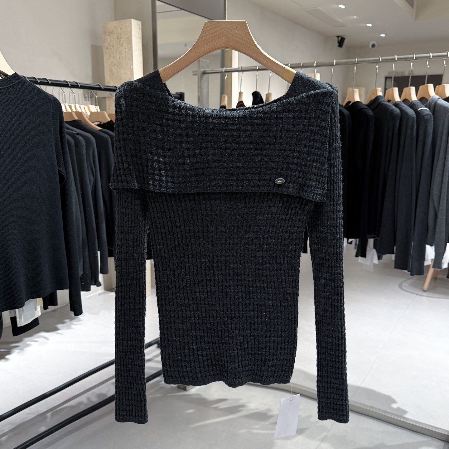 Wool sweater 2025 autumn new style letter logo flip lotus leaf one shoulder sweater top for women
