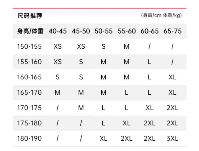 China (cm) 165 / 88-90 170 / 96-98 175 / 108-110 180 / 118-122 185 / 126-130
