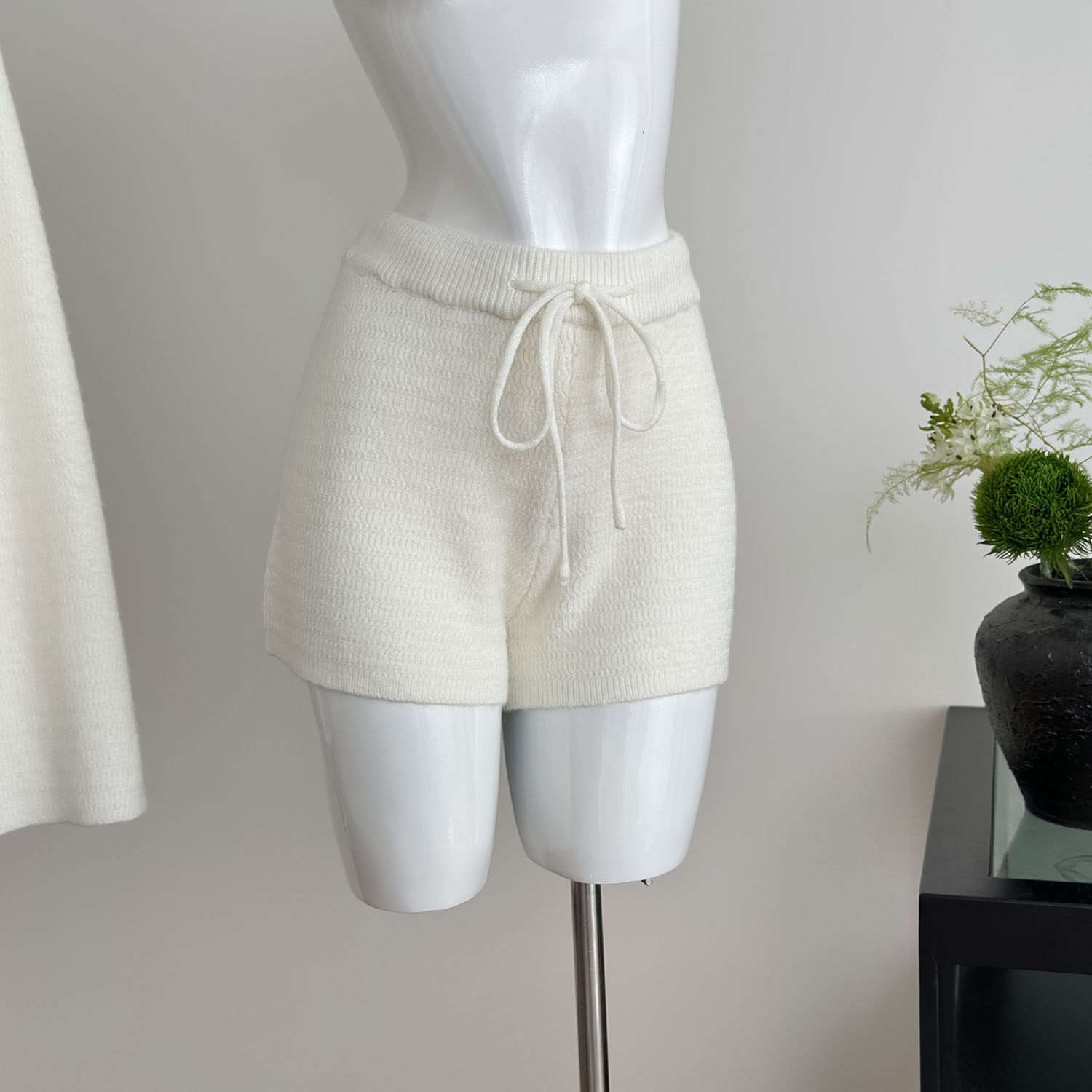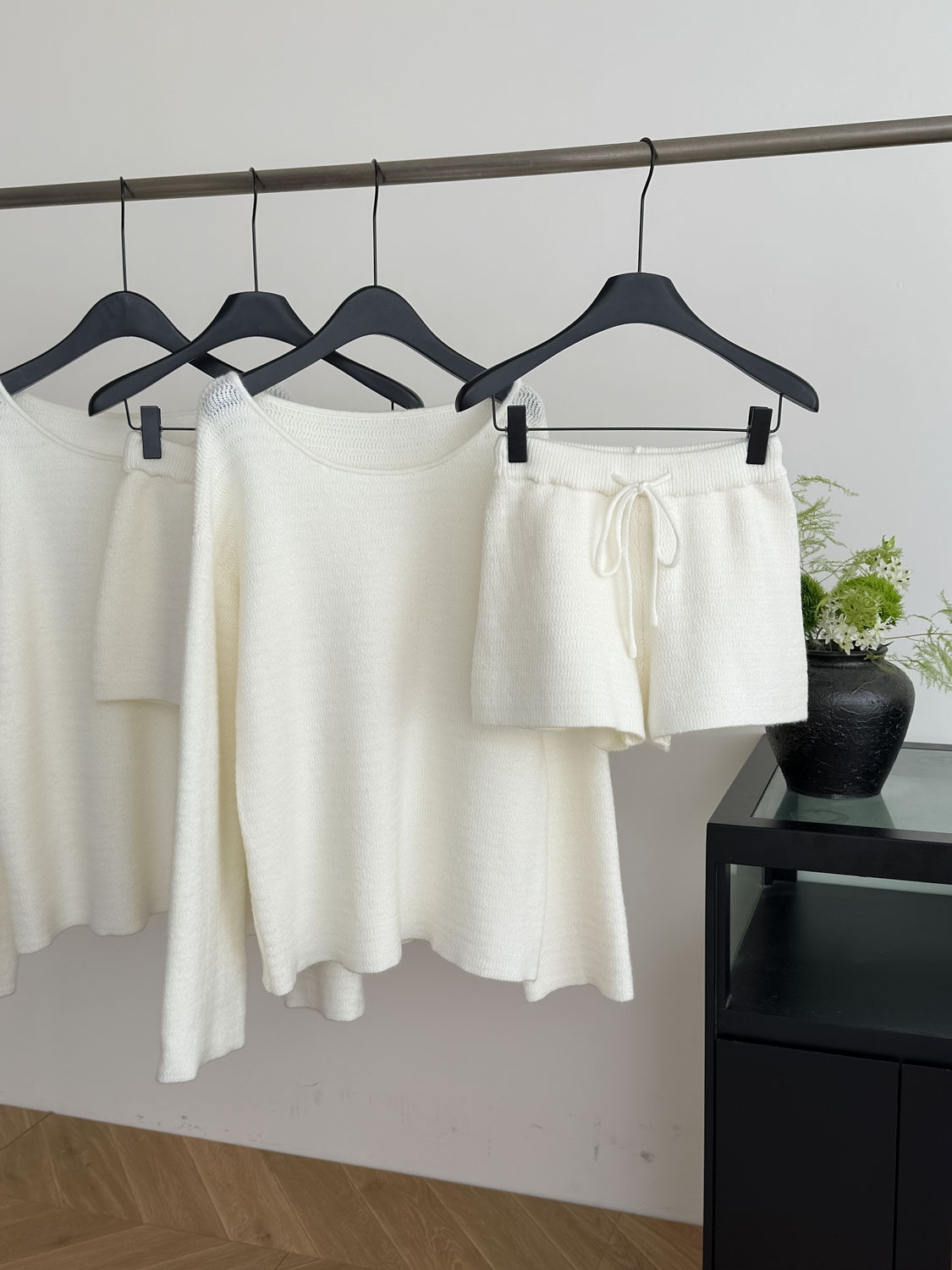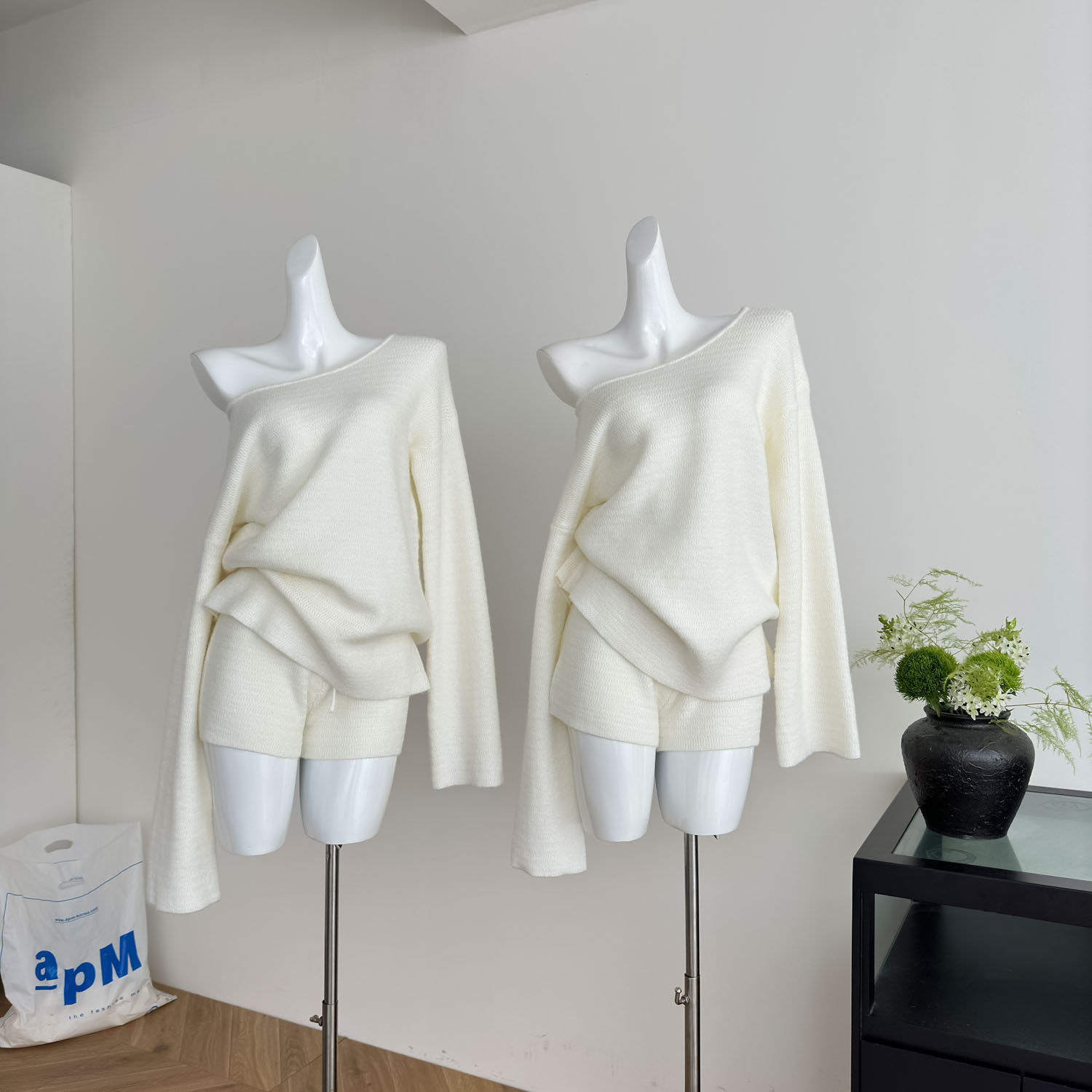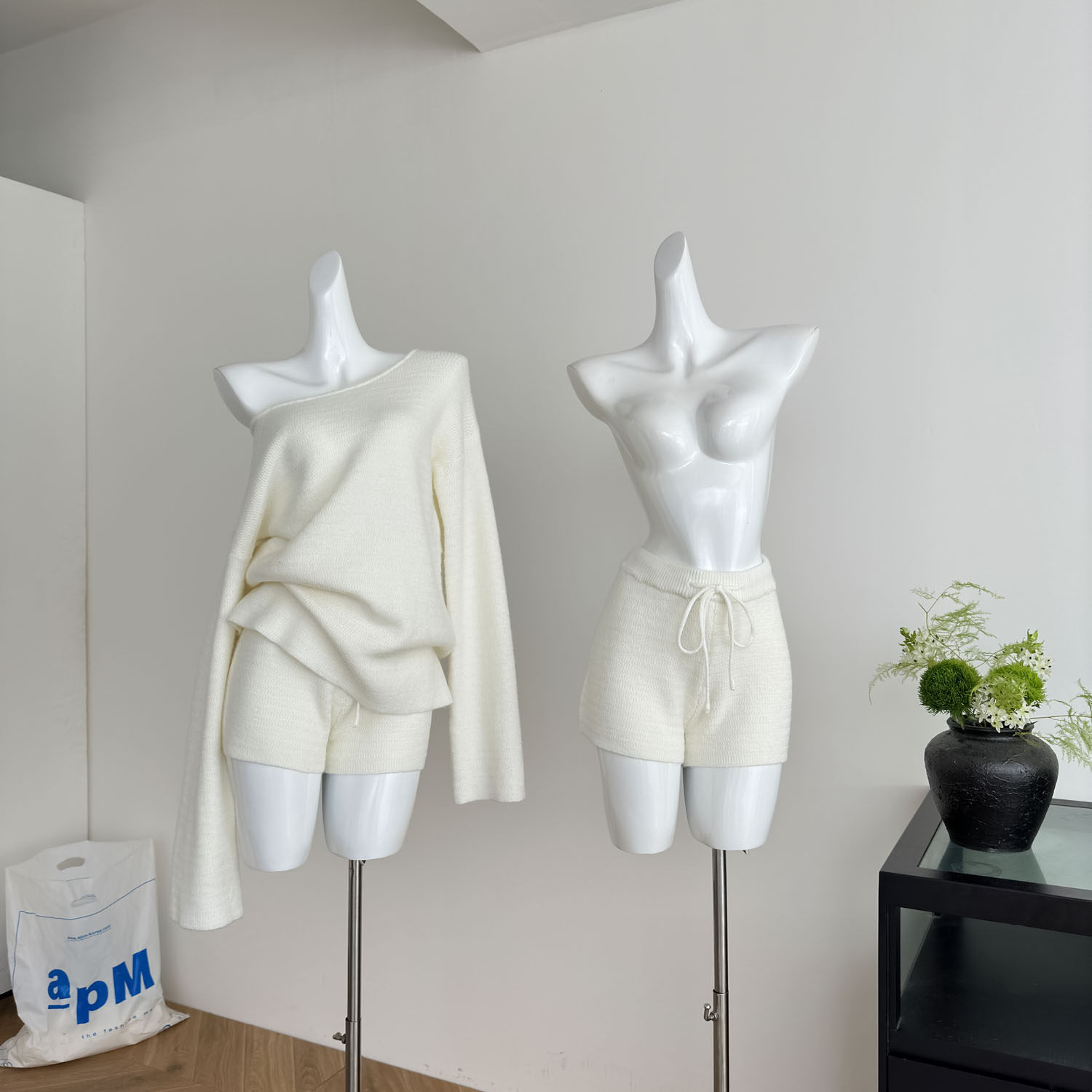 Lin Xi Xi Wavy Texture Autumn White Suit with Off-Shoulder Long-Sleeve Sweater Top and Tie-Up Straight Shorts