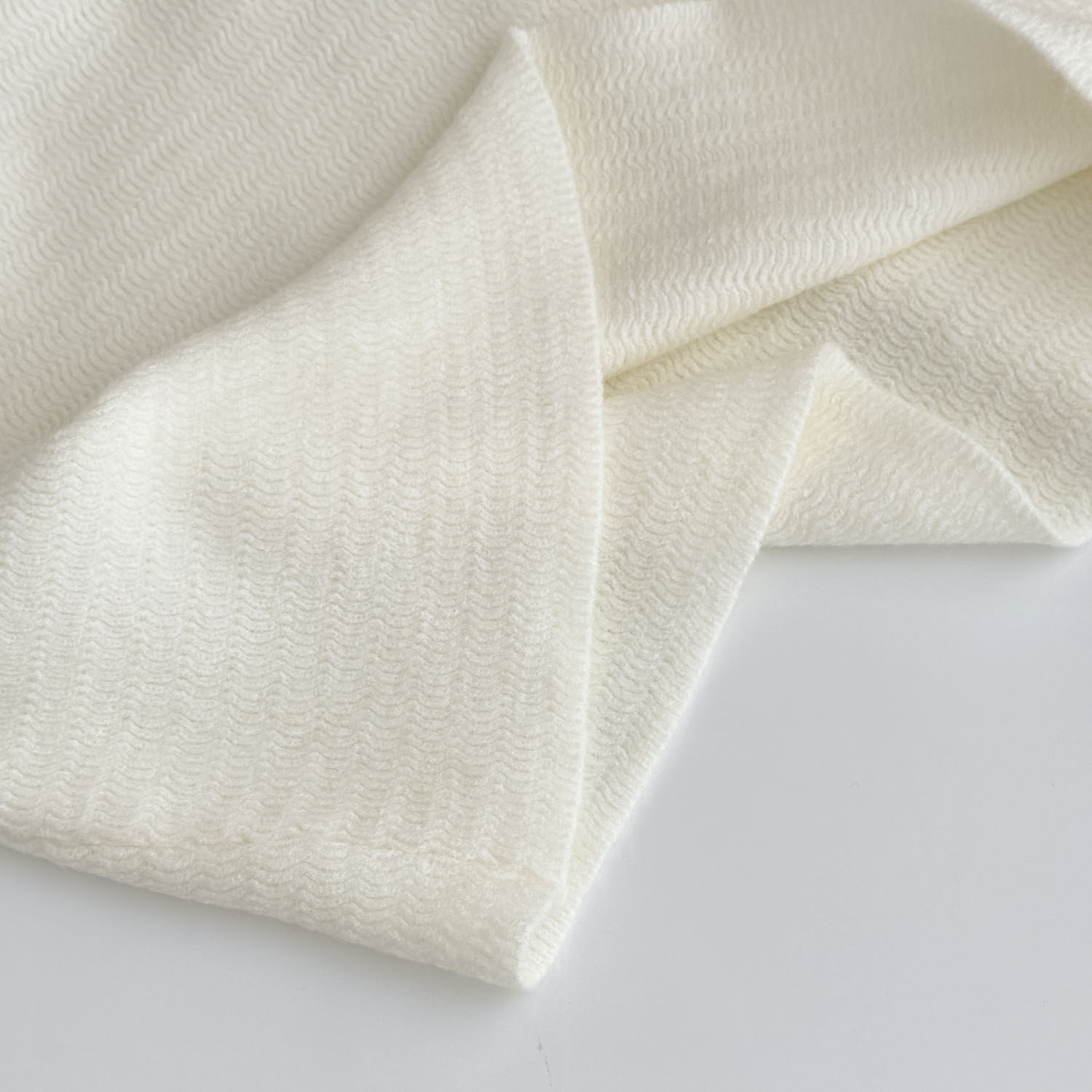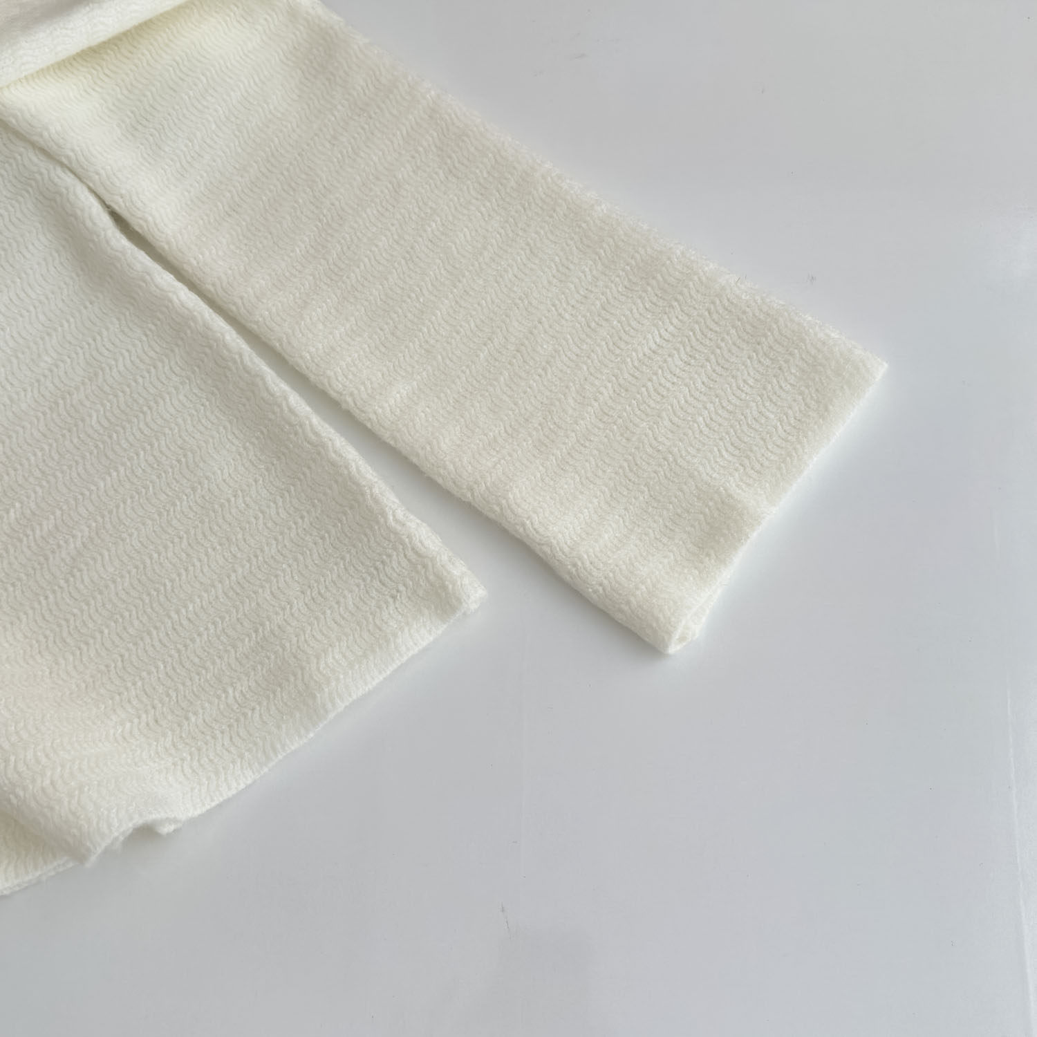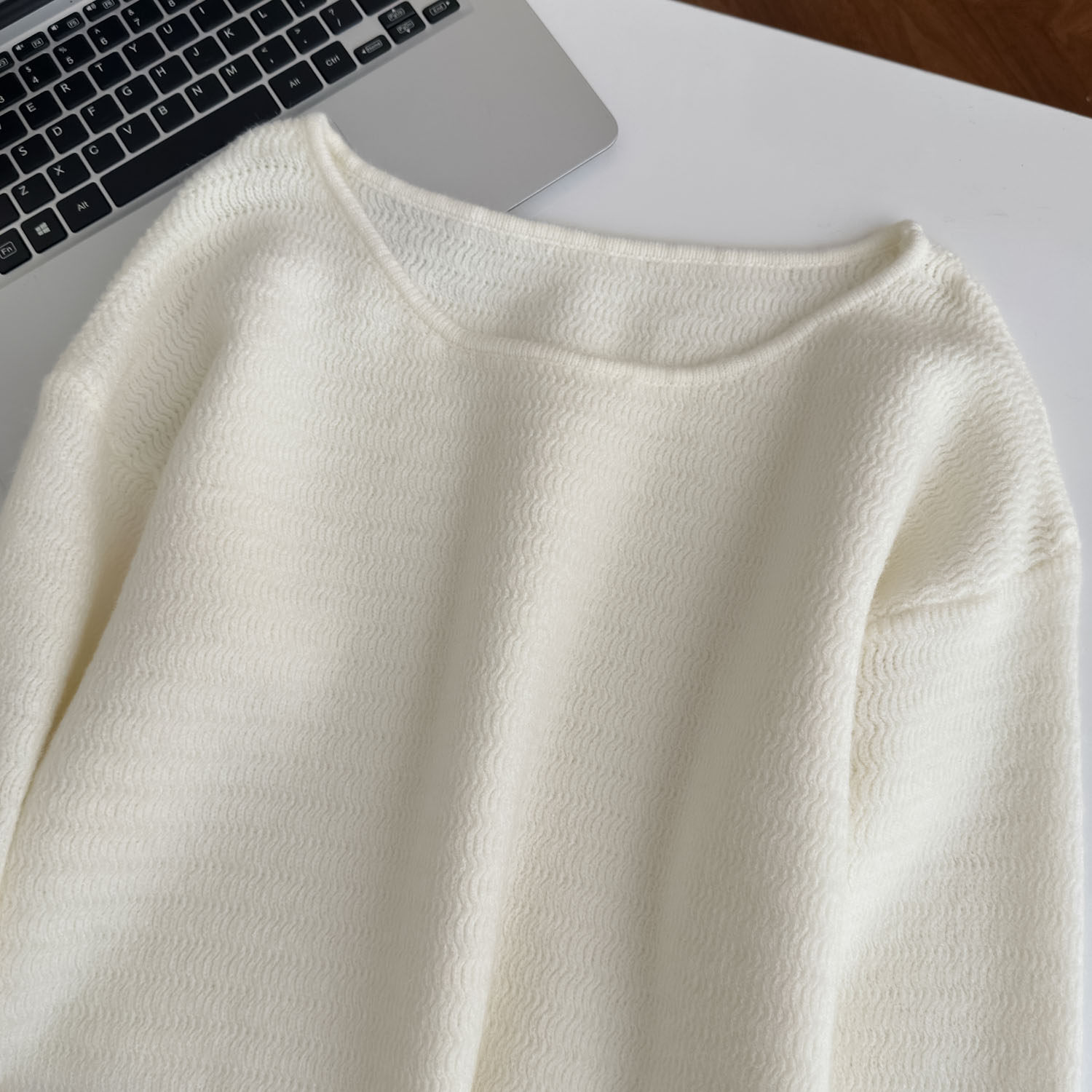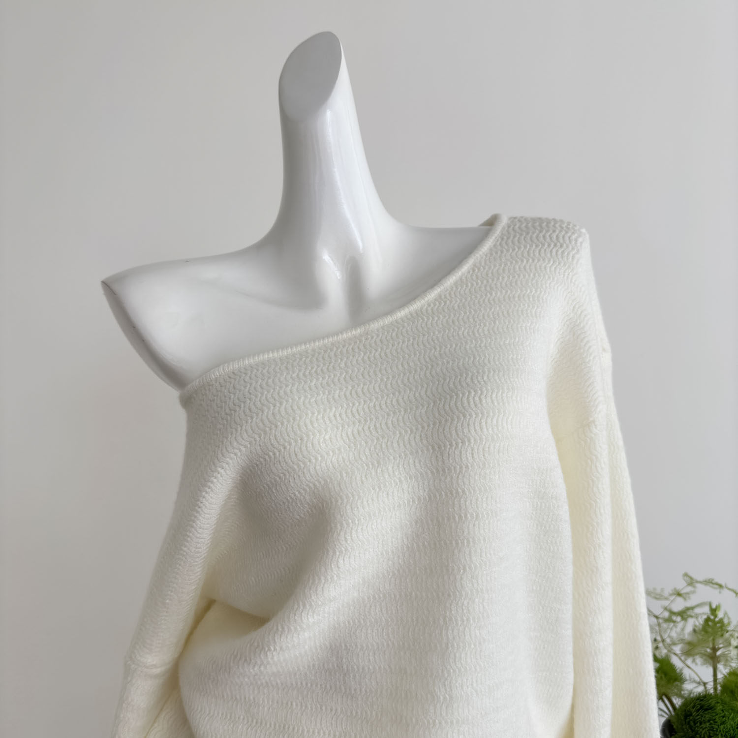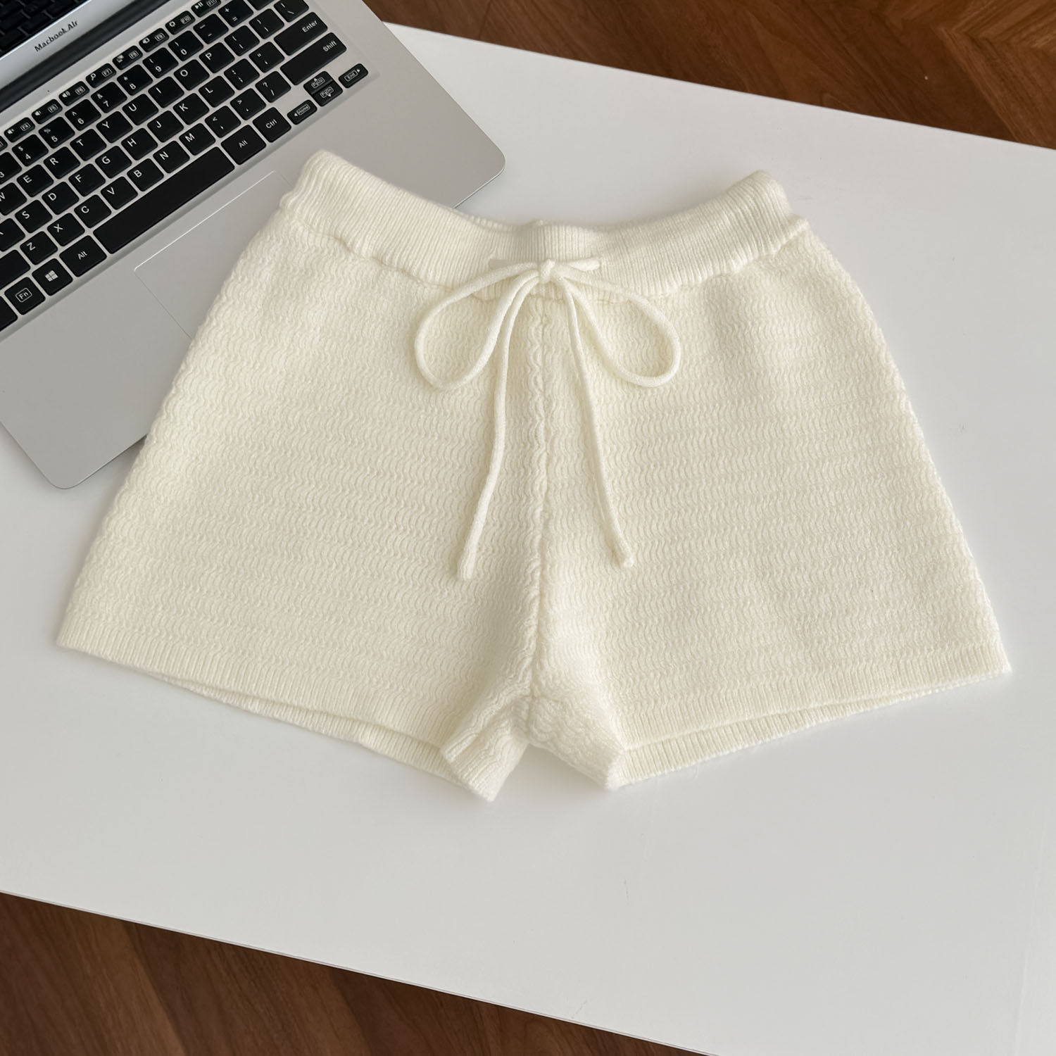 Lin Xi Xi Wavy Texture Autumn White Suit with Off-Shoulder Long-Sleeve Sweater Top and Tie-Up Straight Shorts