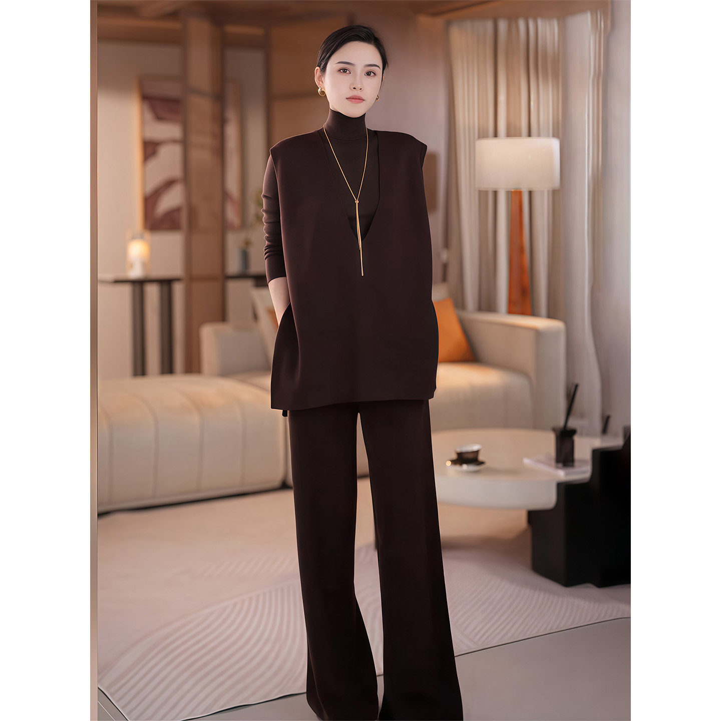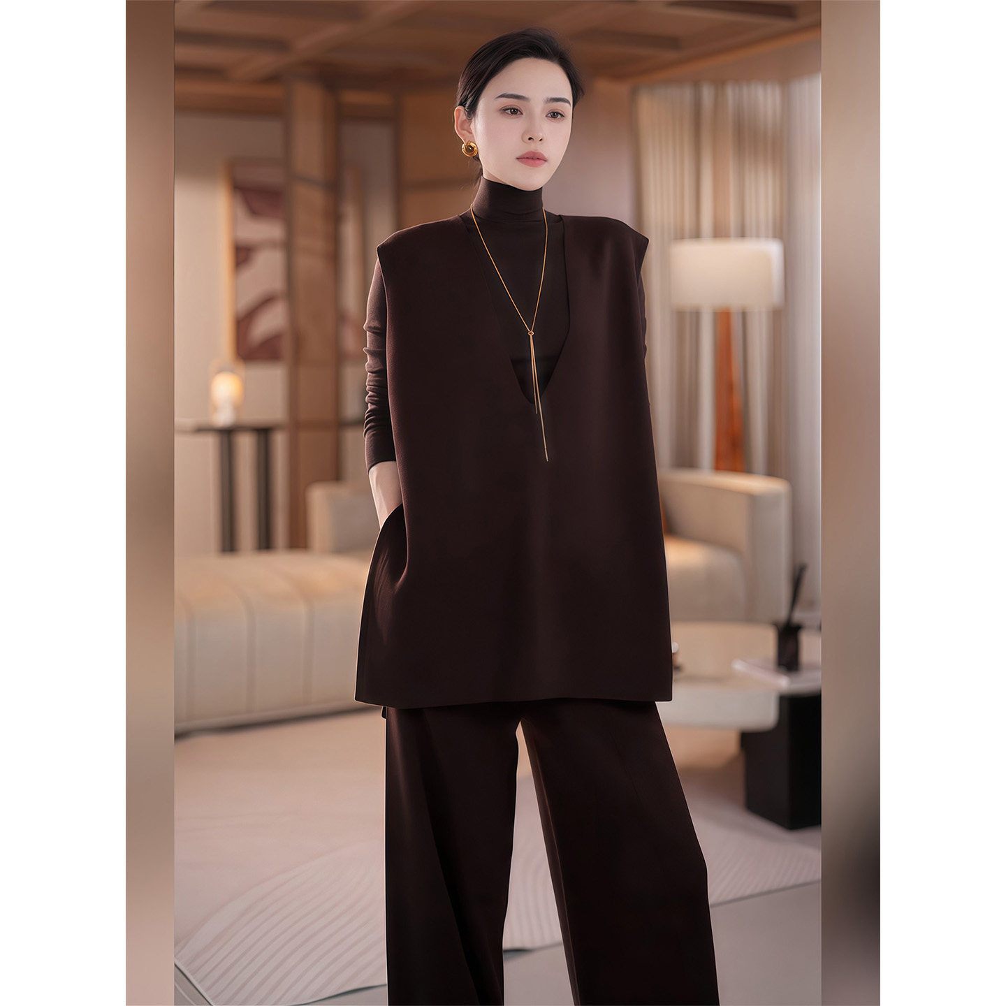 Minimalist style fashionable casual suit for women spring new retro coffee color temperament three-piece set with vest and wide-leg pants