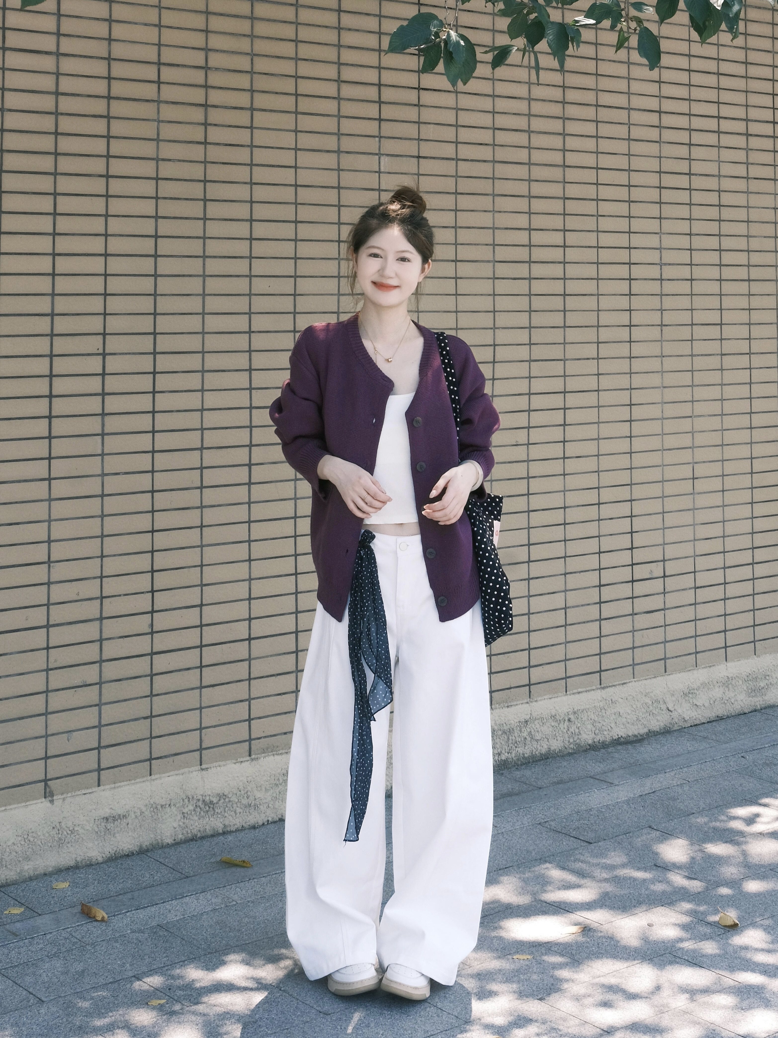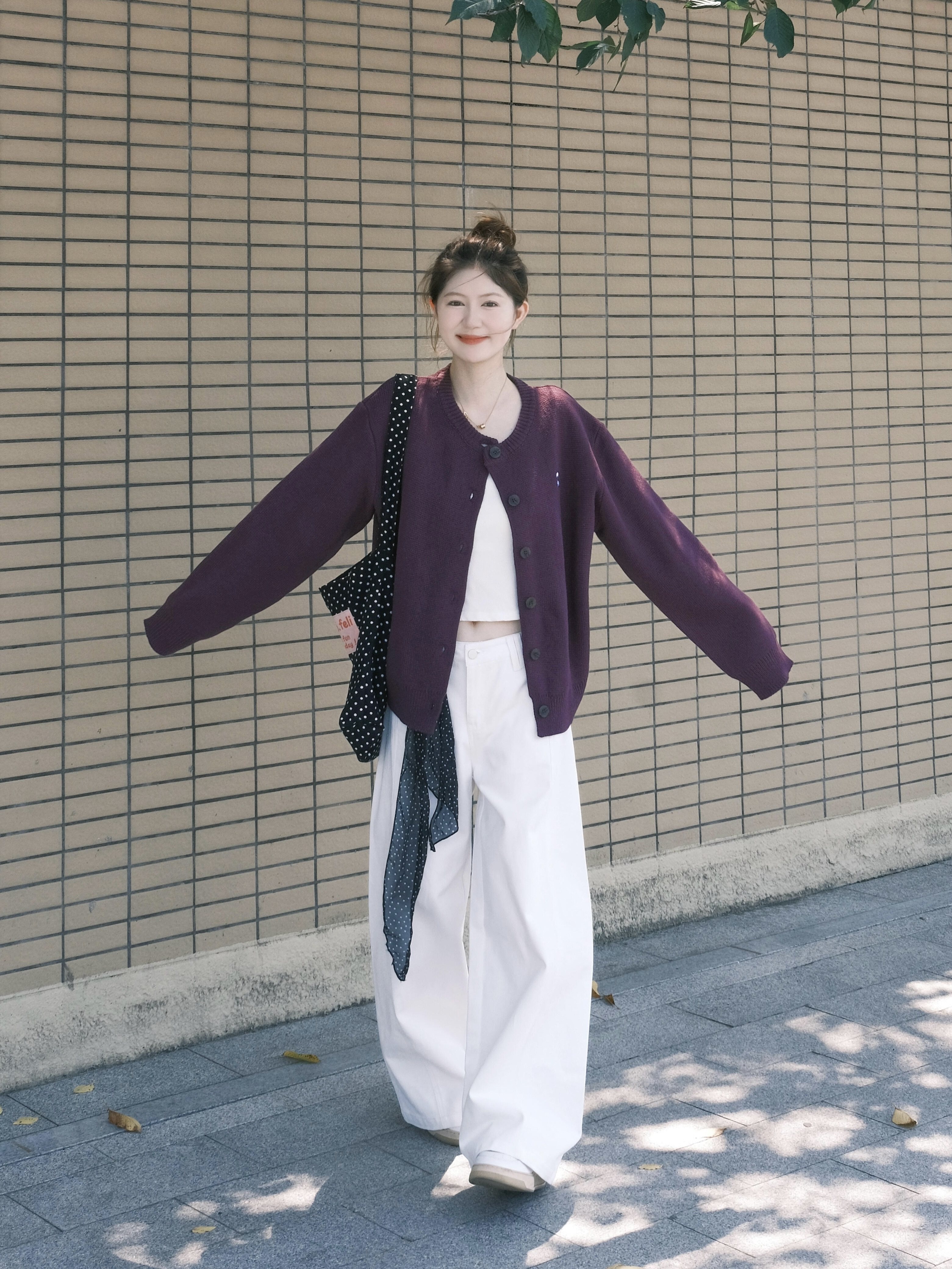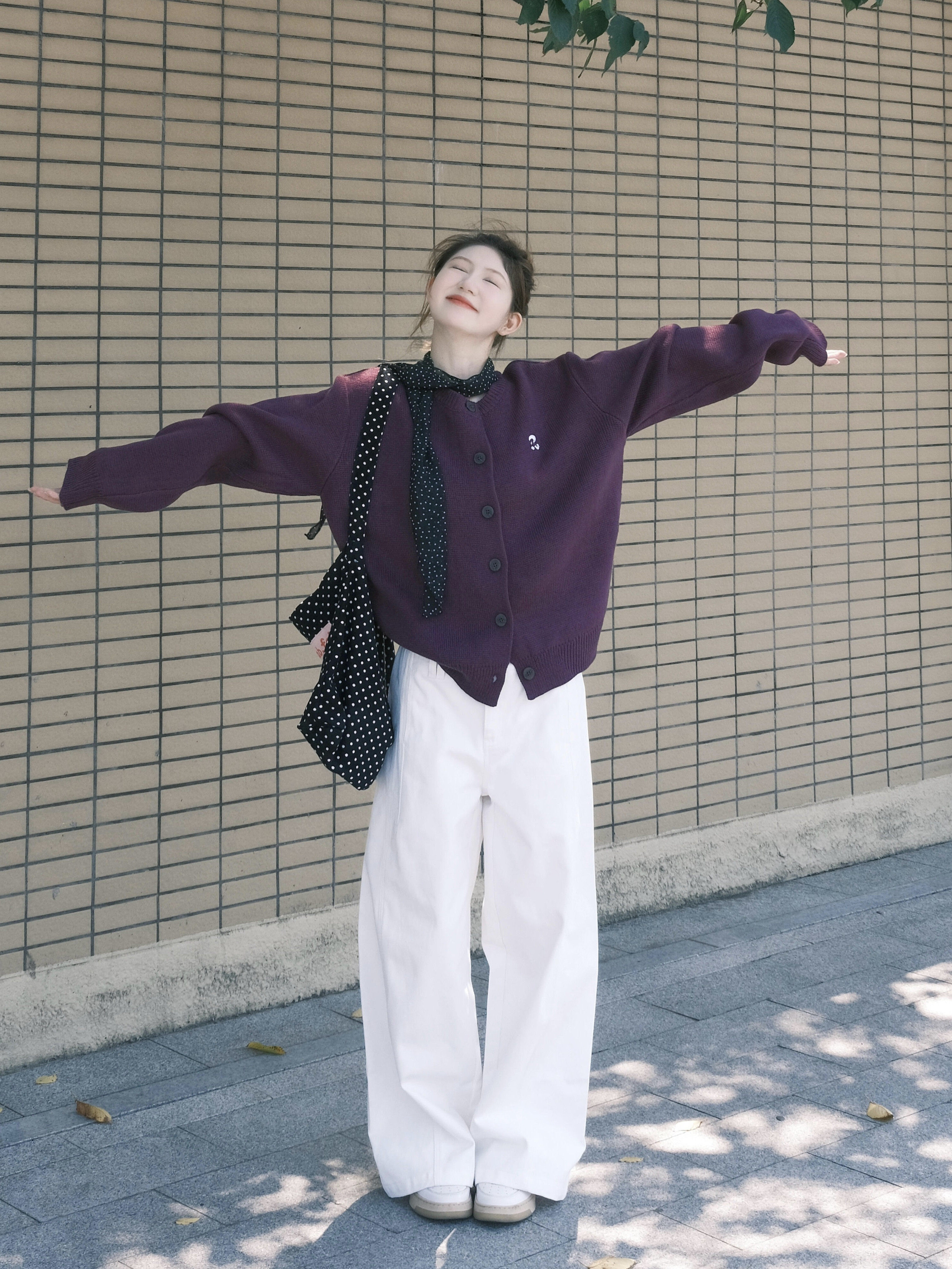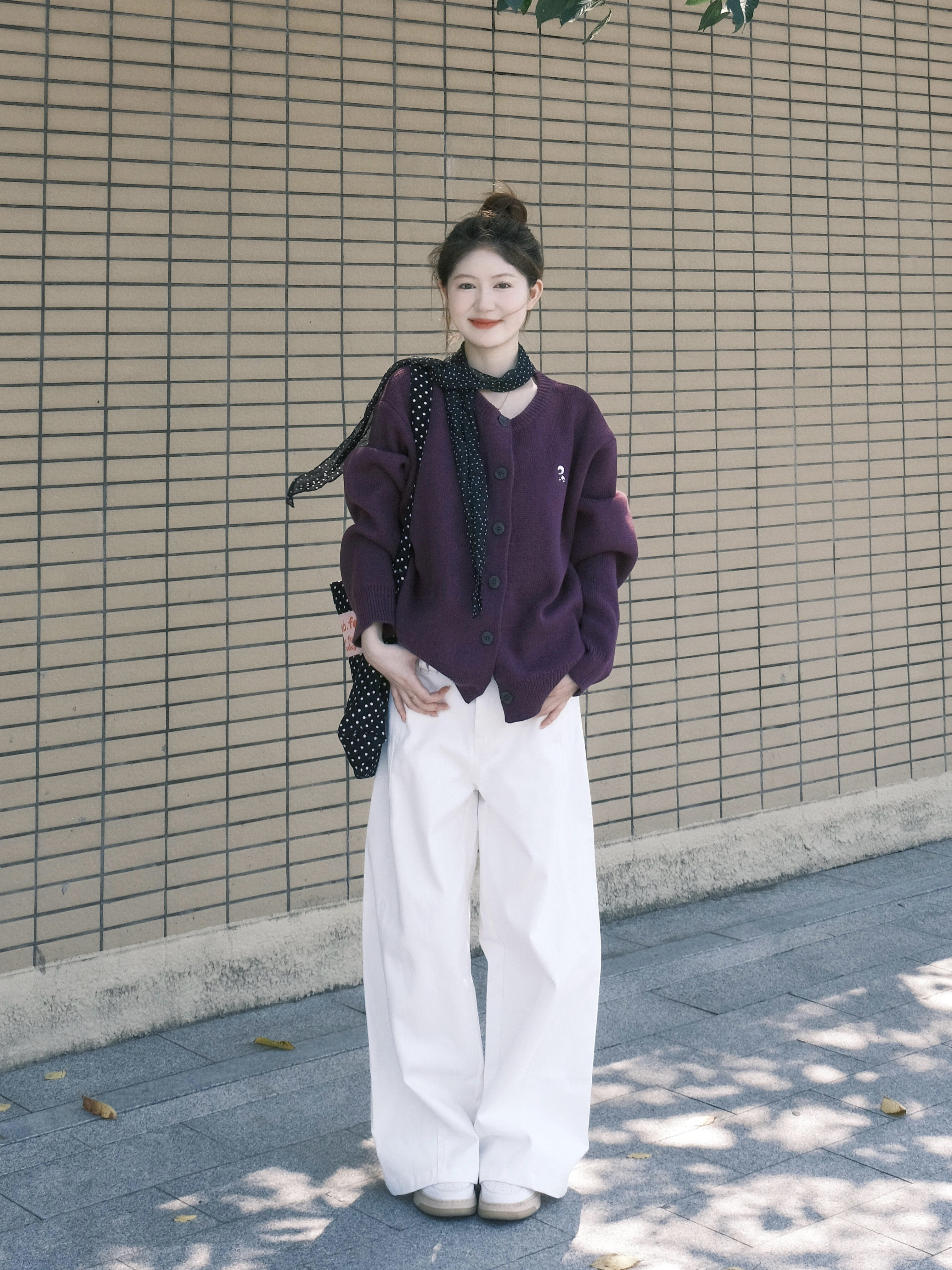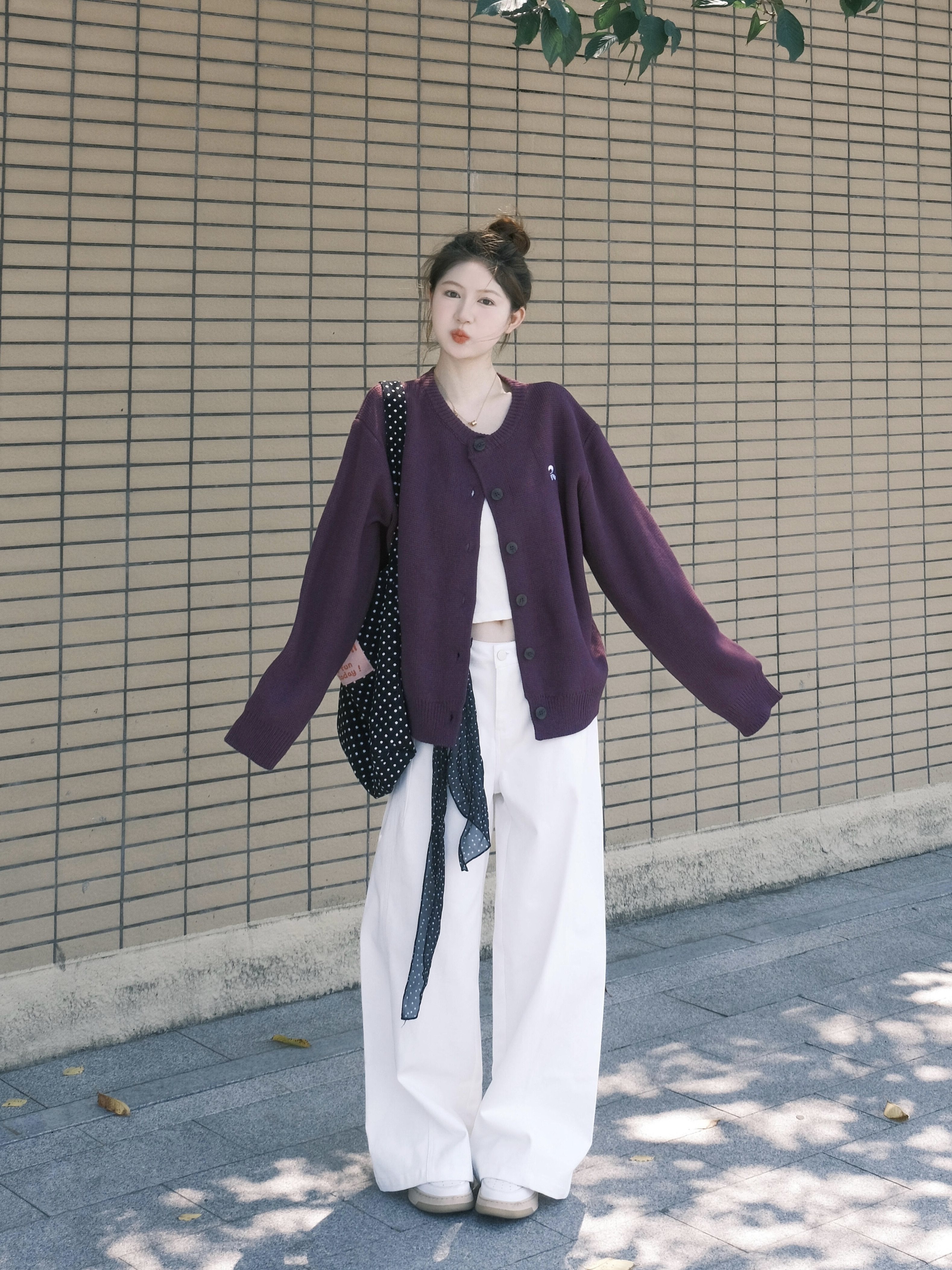 Super White and Purple Atmospheric Sweater Cardigan Jacket for Women, New Autumn Korean Style Casual Loose Knit Top