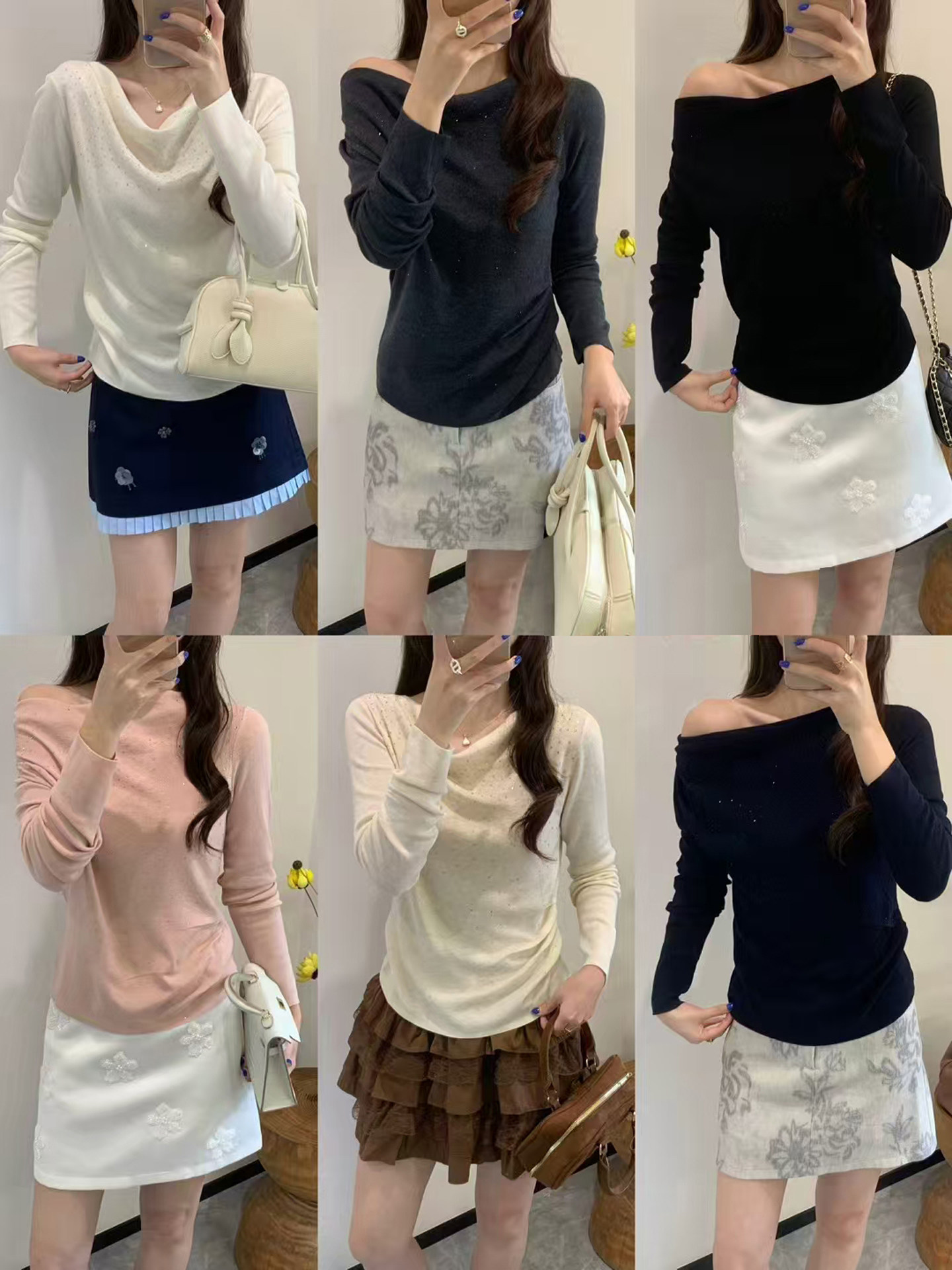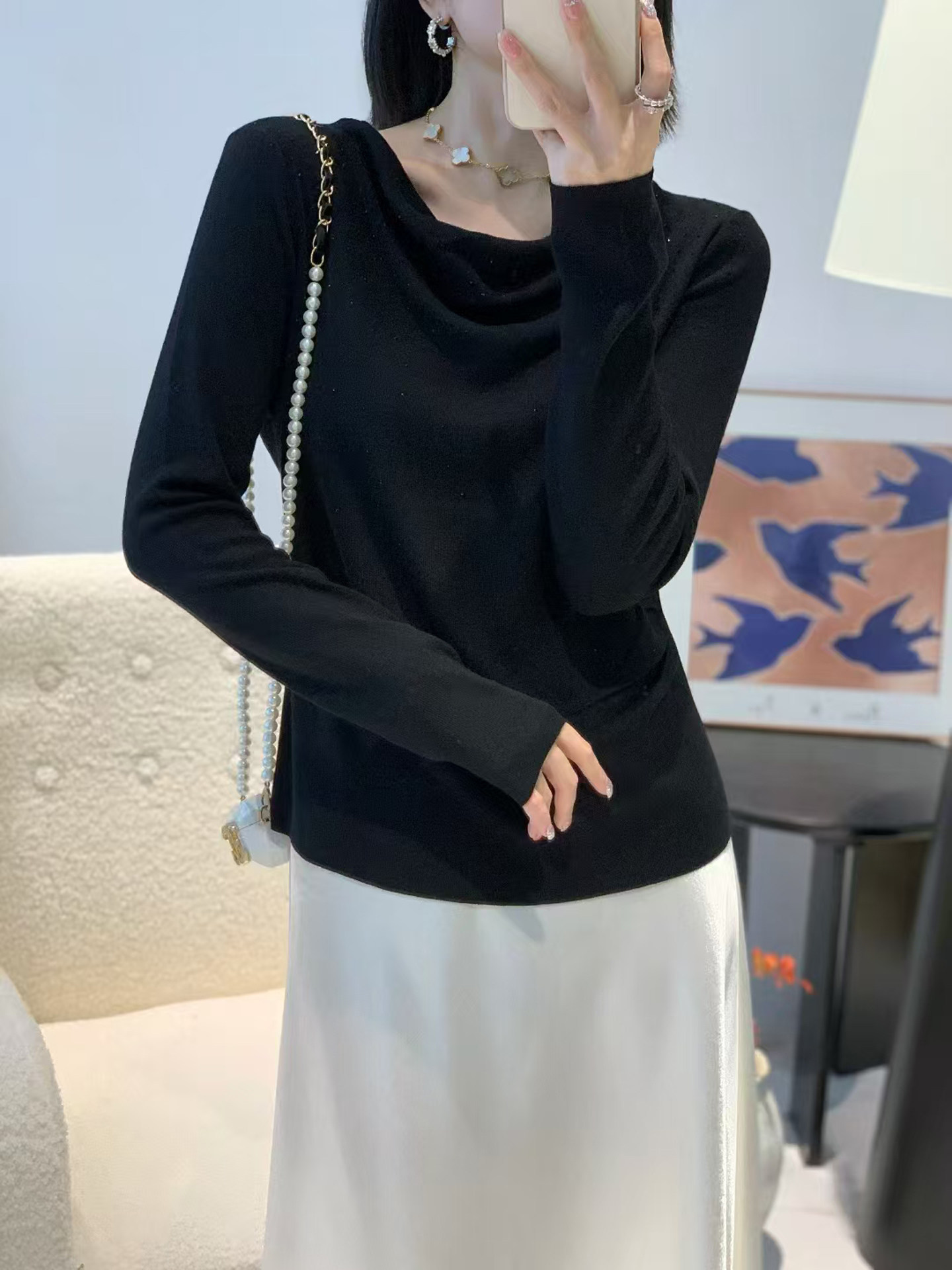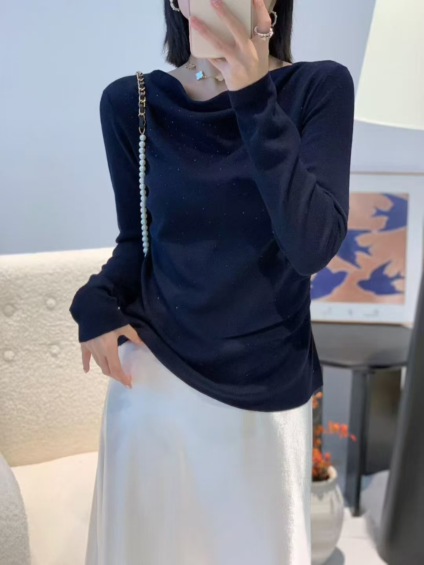 Light luxury one-shoulder top for women, beautiful swung collar pleated perm sweater, gentle temperament long-sleeved bottoming shirt
