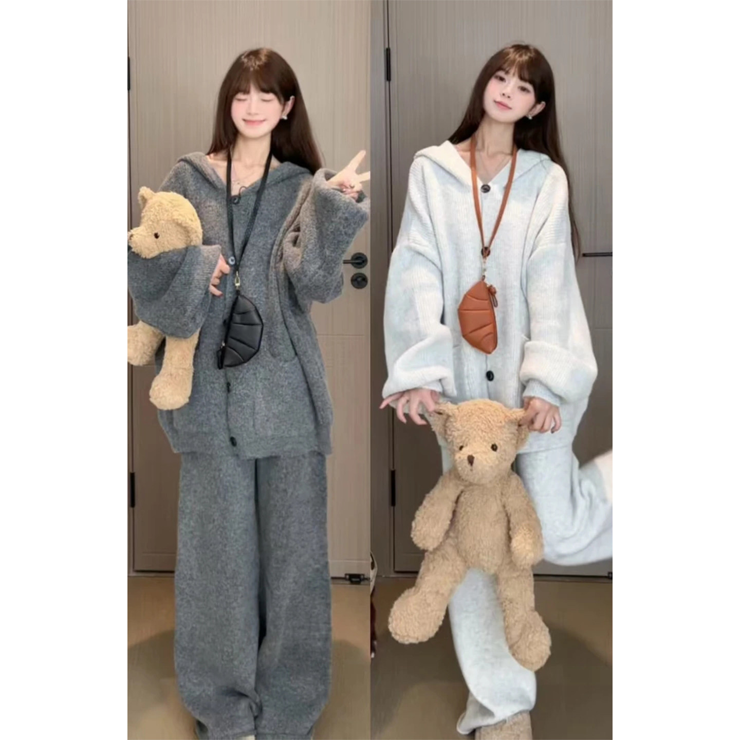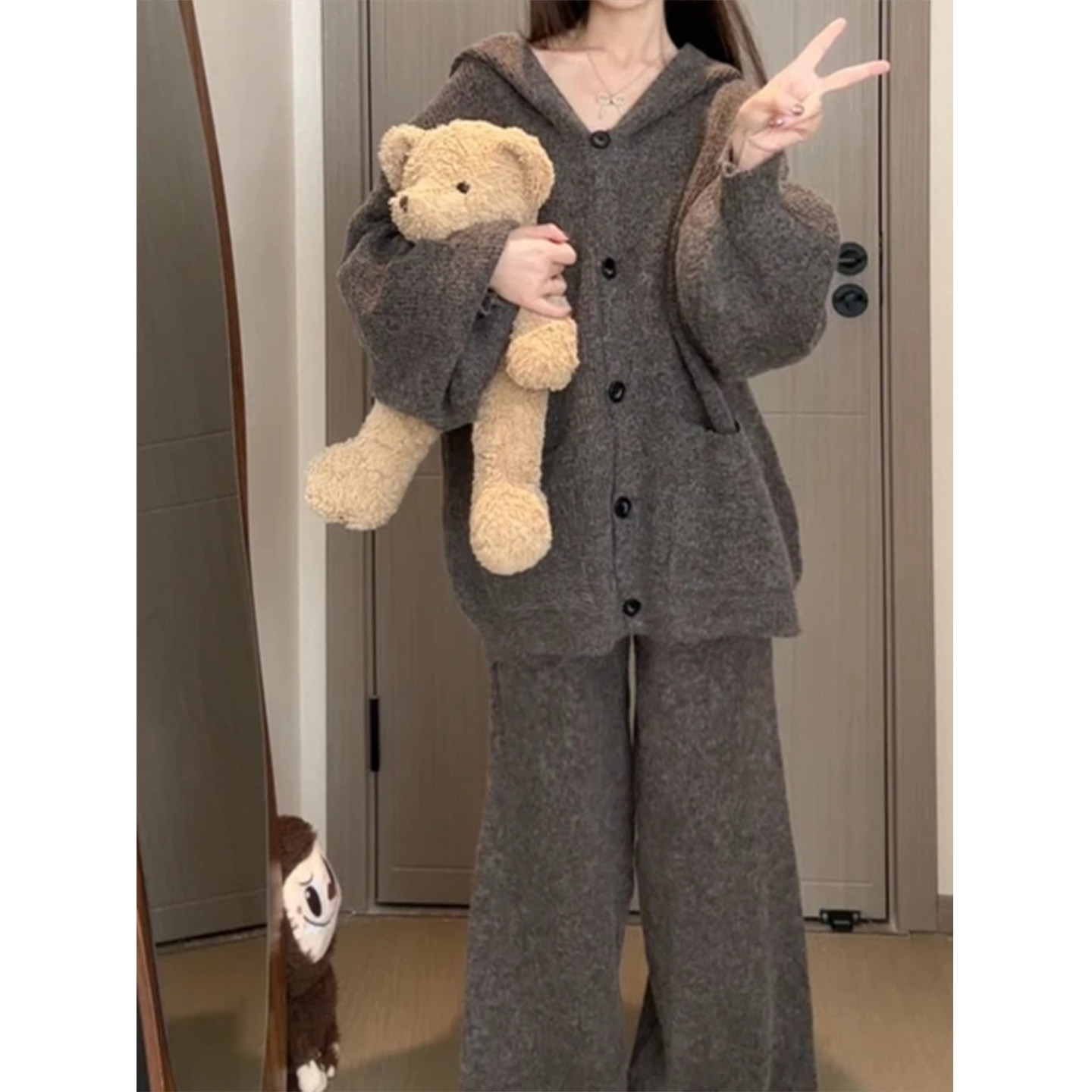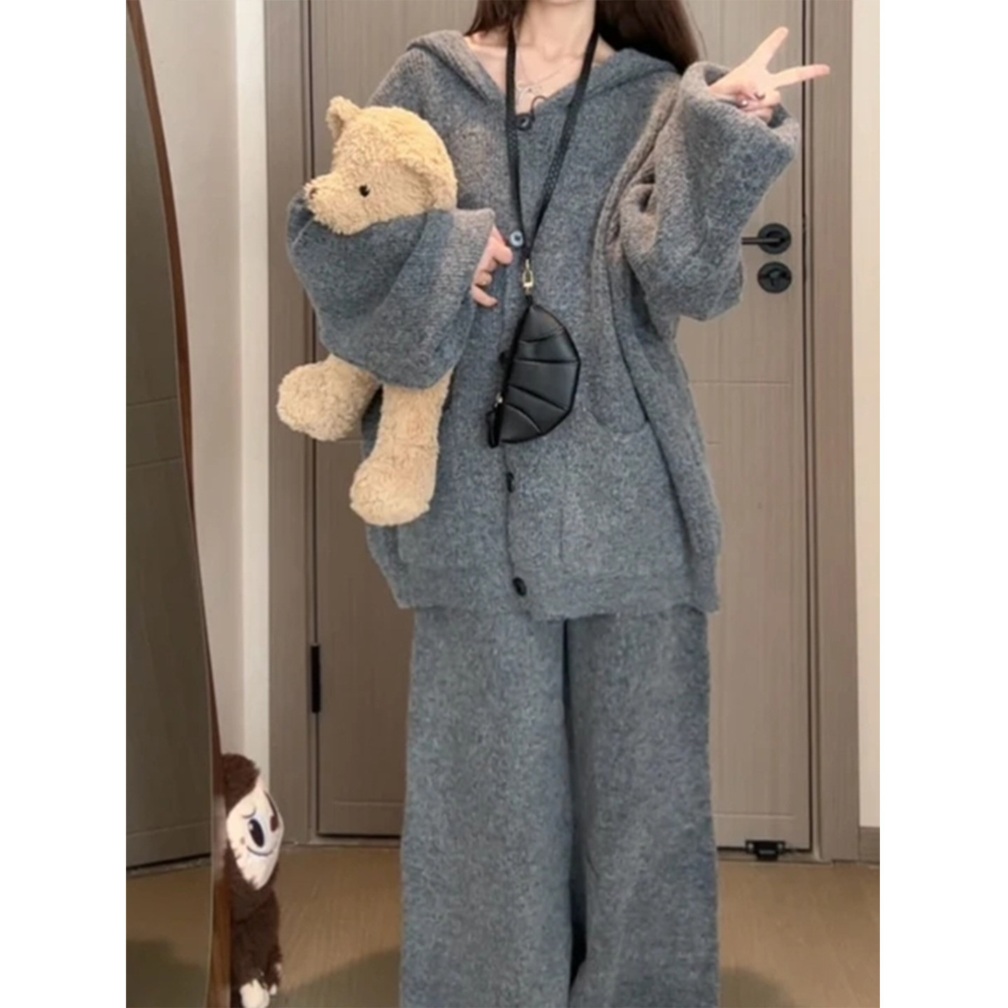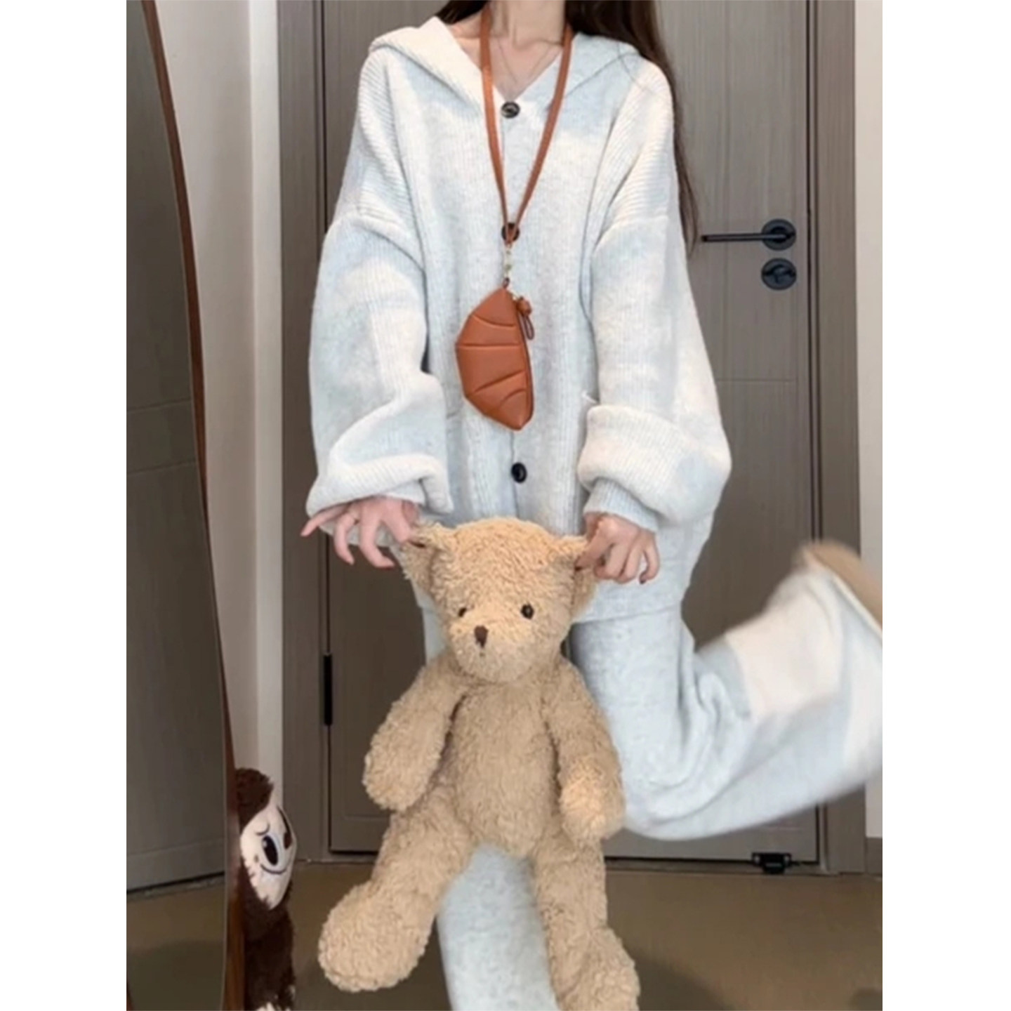 Retro Lazy Loose Hooded Long-Sleeved Knit Top High-Waisted Knit Casual Pants Women's Autumn New Casual Suit Trendy