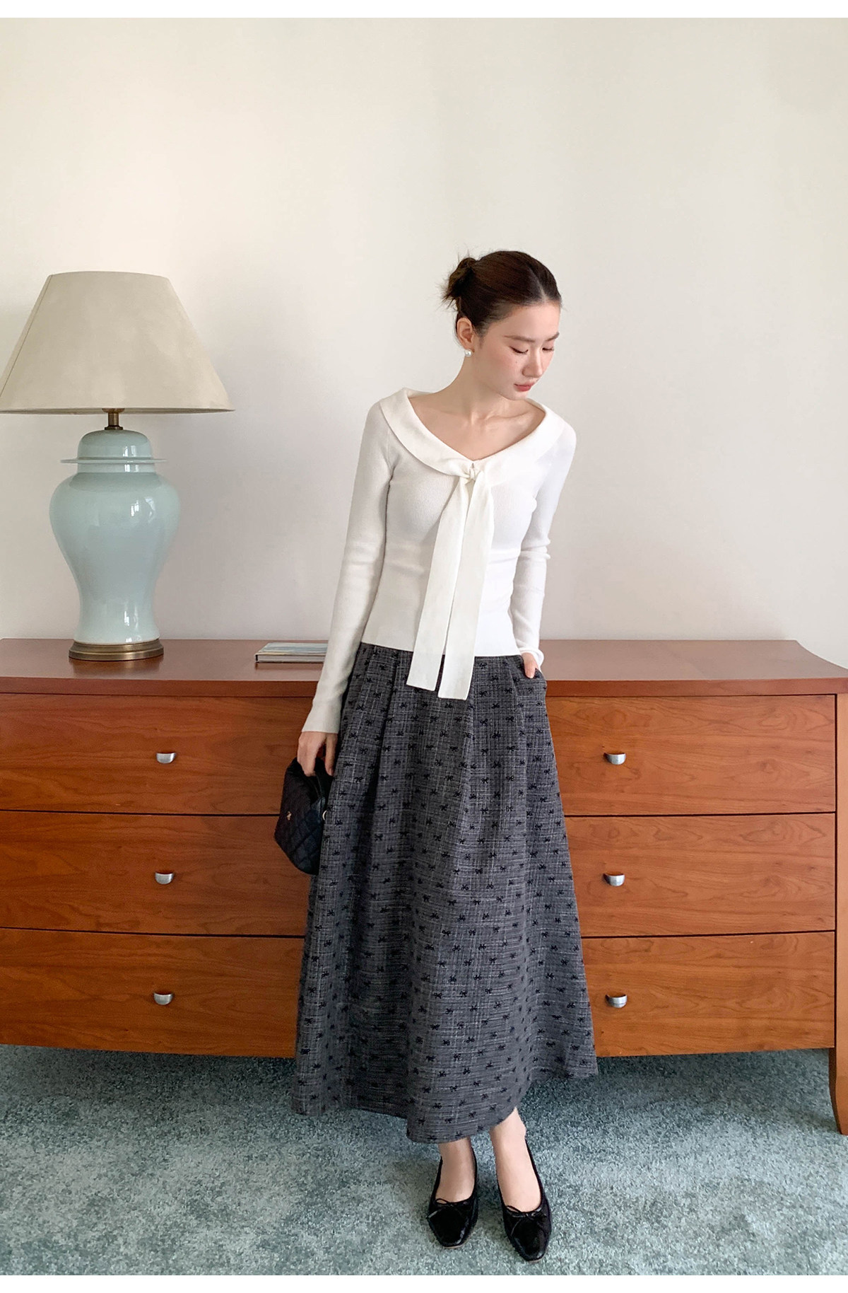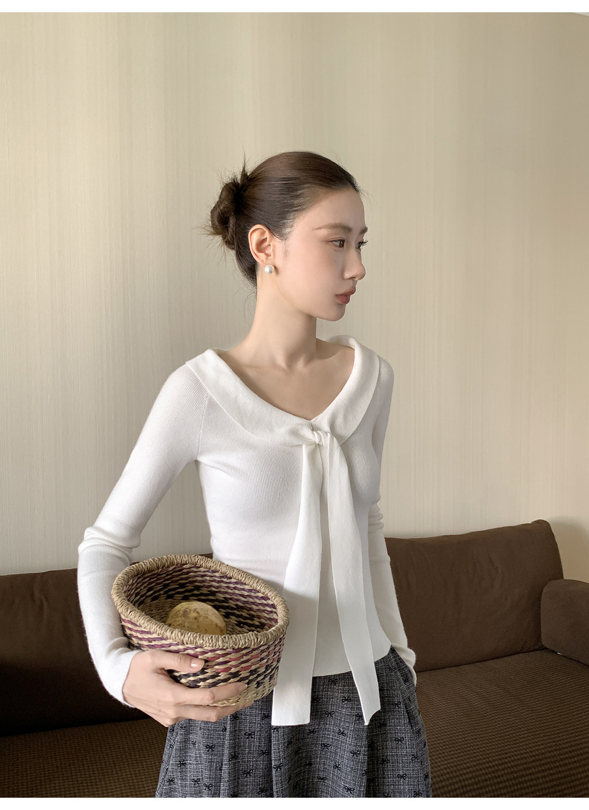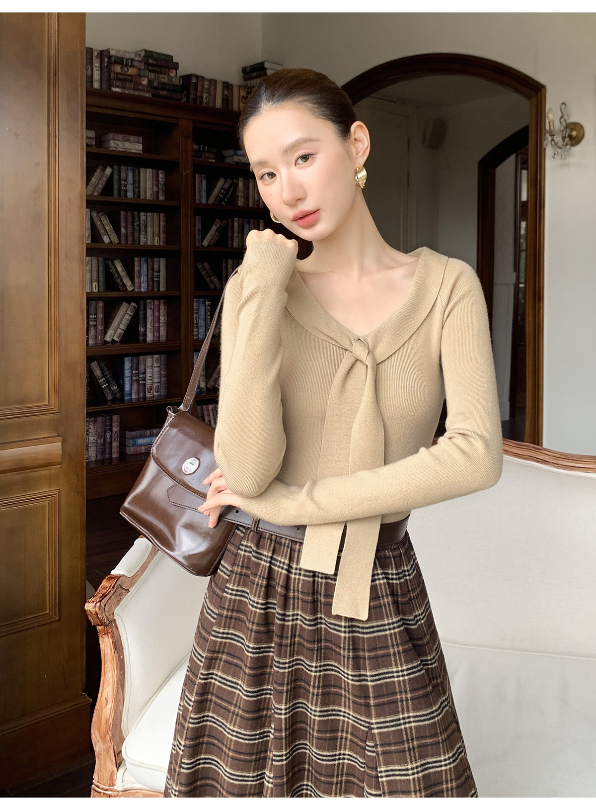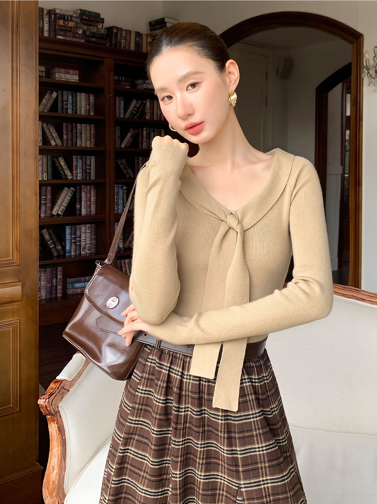 Xxning Lapel Ribbon Slim Knit Sweater for Women, Autumn and Winter, Slim Fit, Elegant, Slimming, Gentle, Commuting, Casual Top