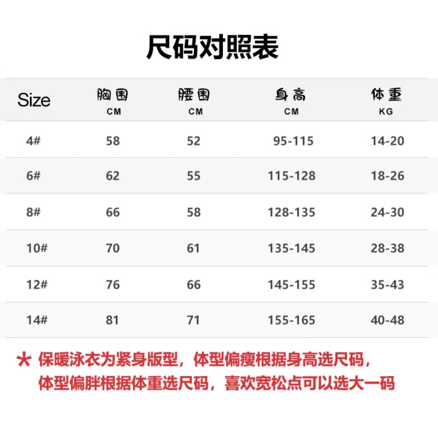 Size 4#(95-115cm/14-20kg),6#(115-128cm/18-26kg),8#(128-135cm/24-30kg),10#(135-145cm/28-38kg),12#(145-155cm/35-43kg),14#(155-165cm/40-48kg)