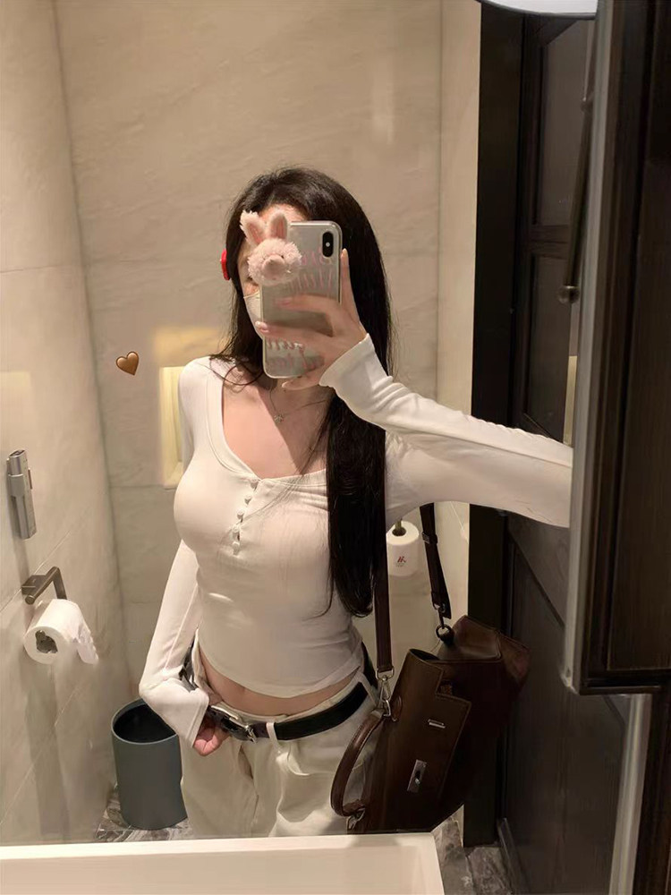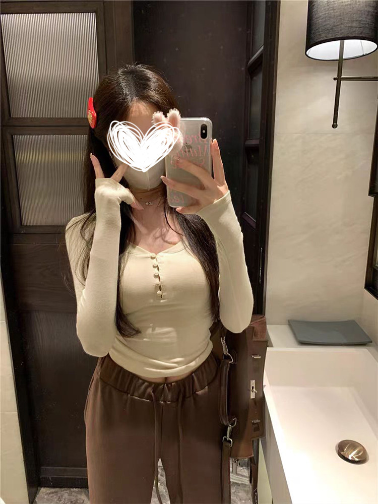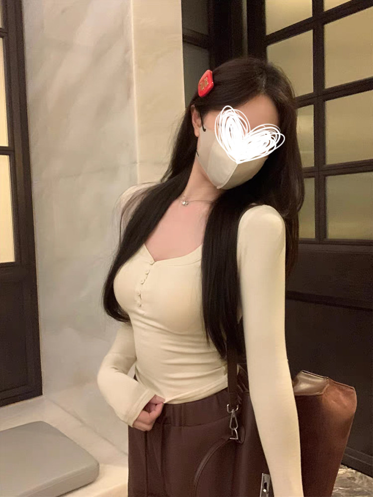 American Style Pure and Sexy Long-Sleeved Tight-Fitting T-Shirt for Women, Autumn and Winter Slimming Versatile Top ins Tea-Colored Slim-Fit Shirt