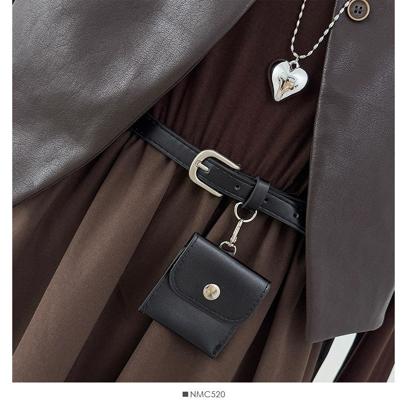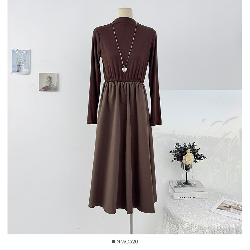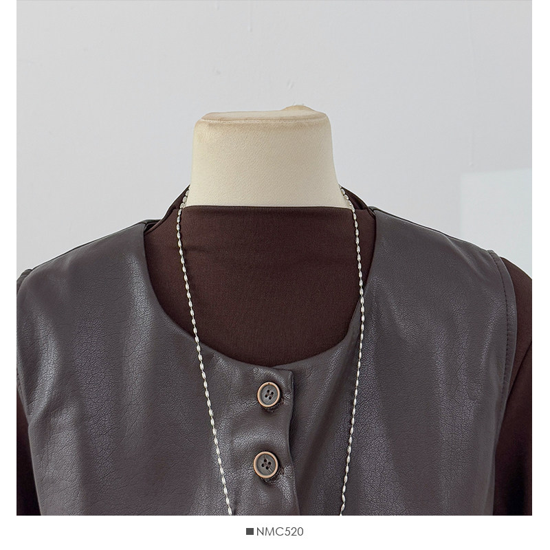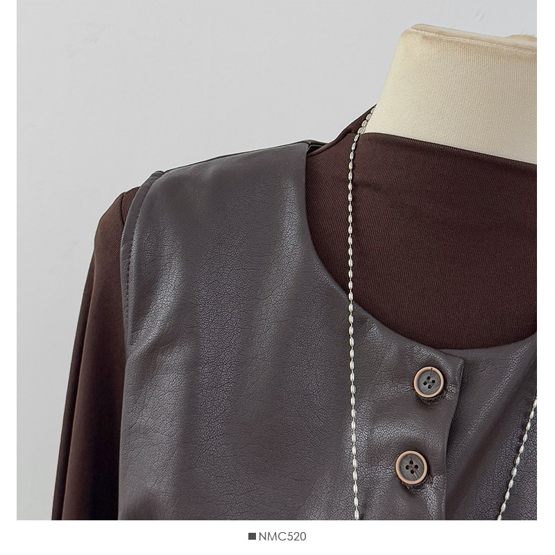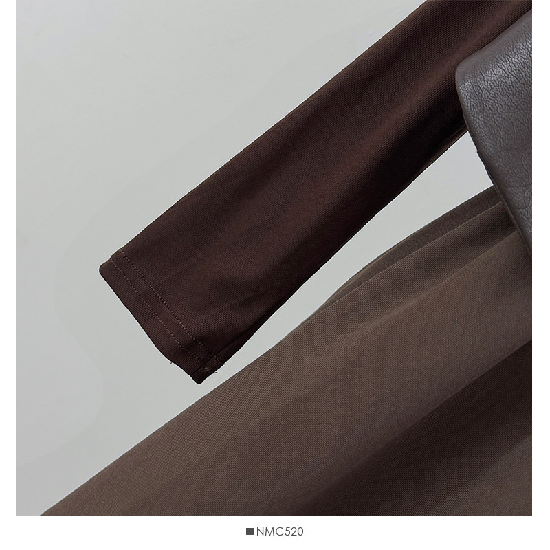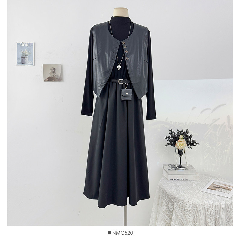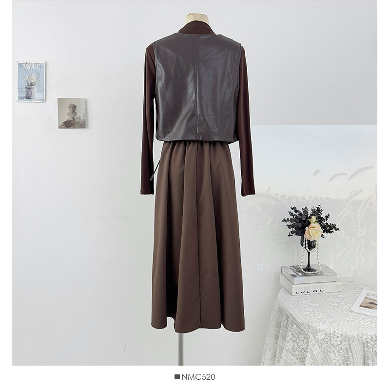 French retro half-high collar knitted splicing long-sleeved dress for women autumn layered PU leather vest two-piece set