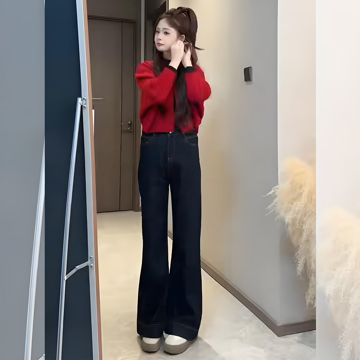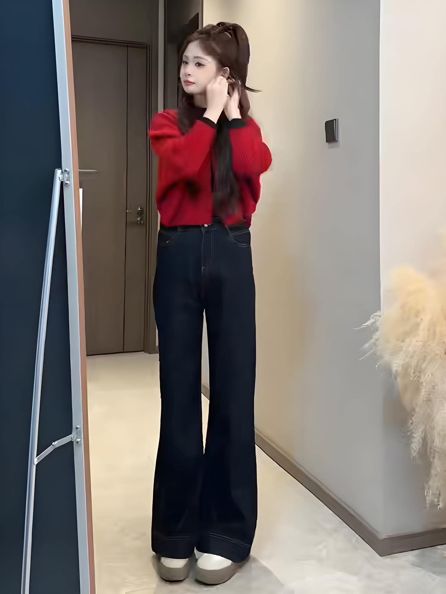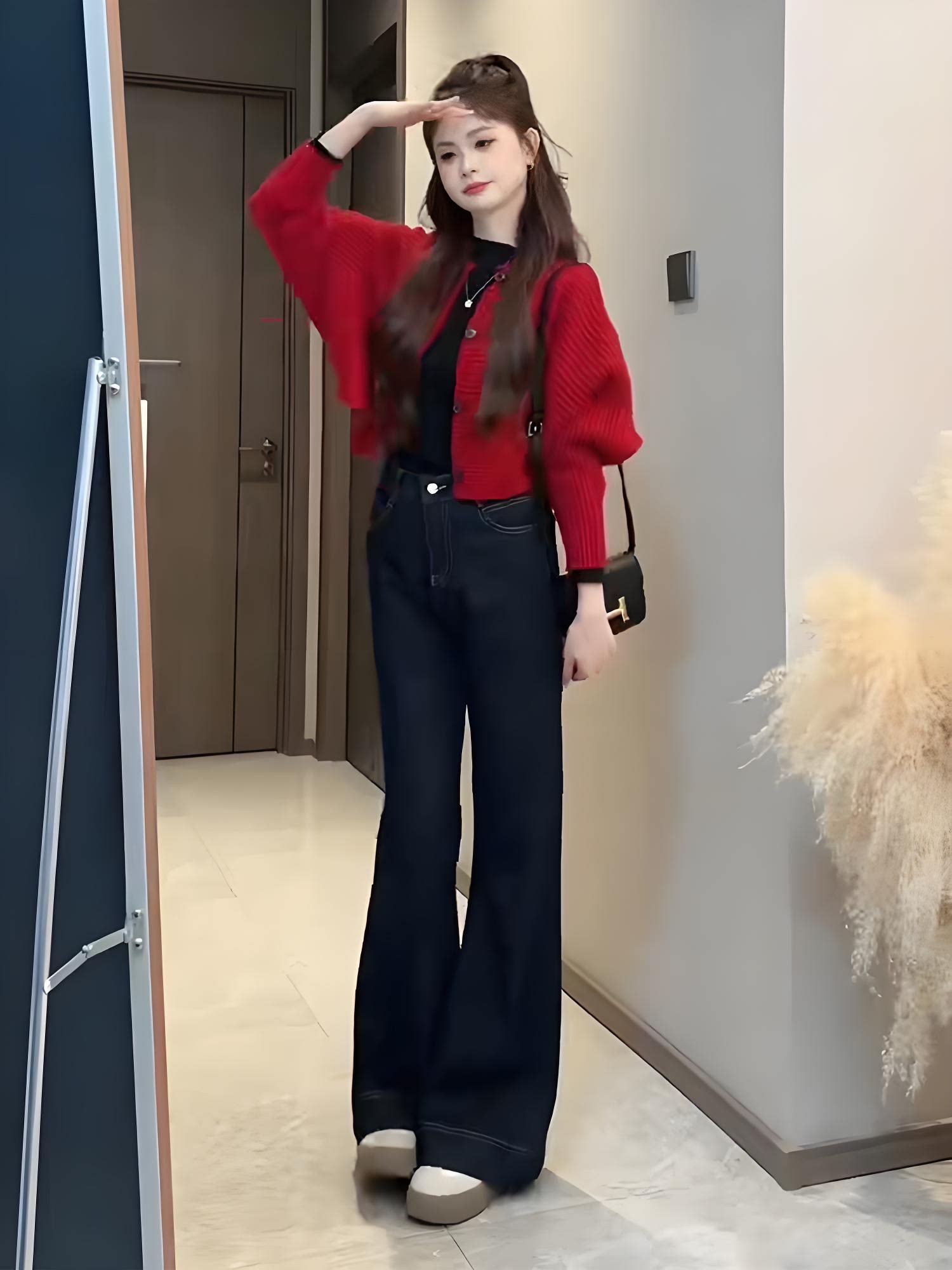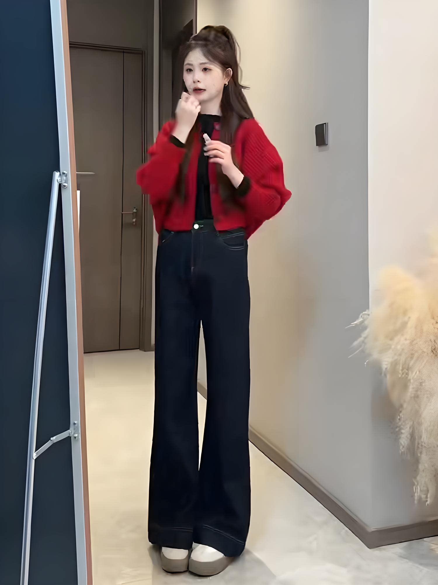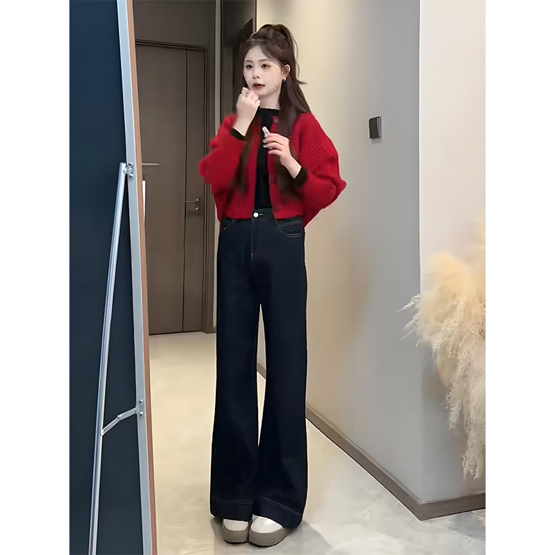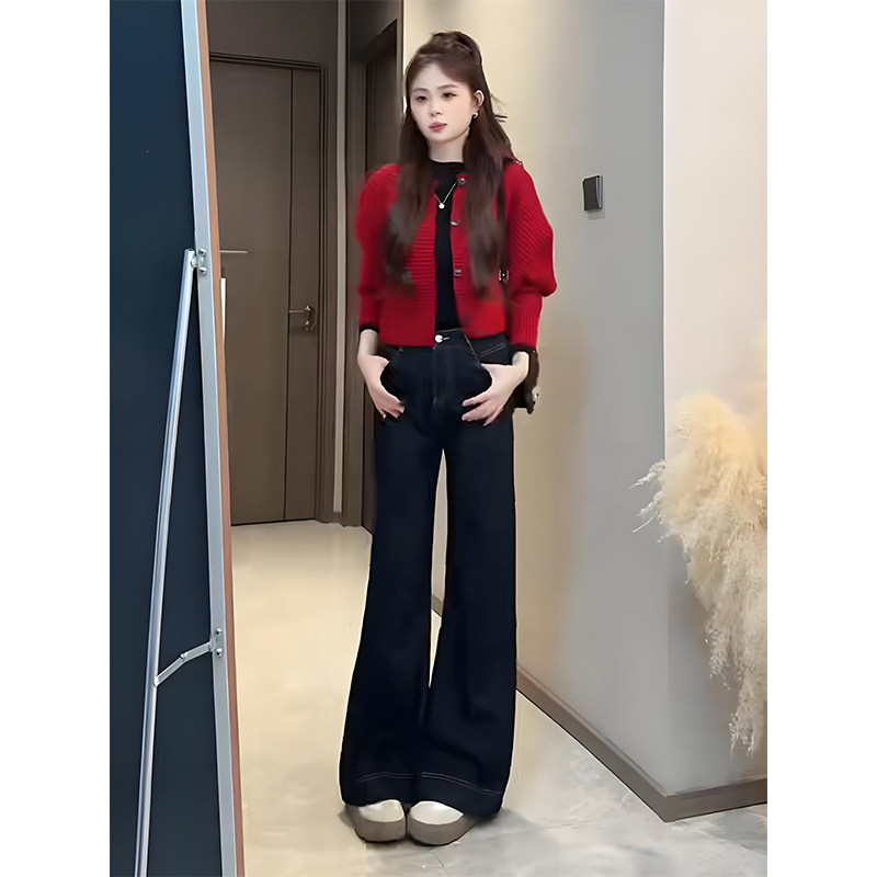 Sort by color Red knitted cardigan,dark blue jeans,Red knitted cardigan + dark blue jeans