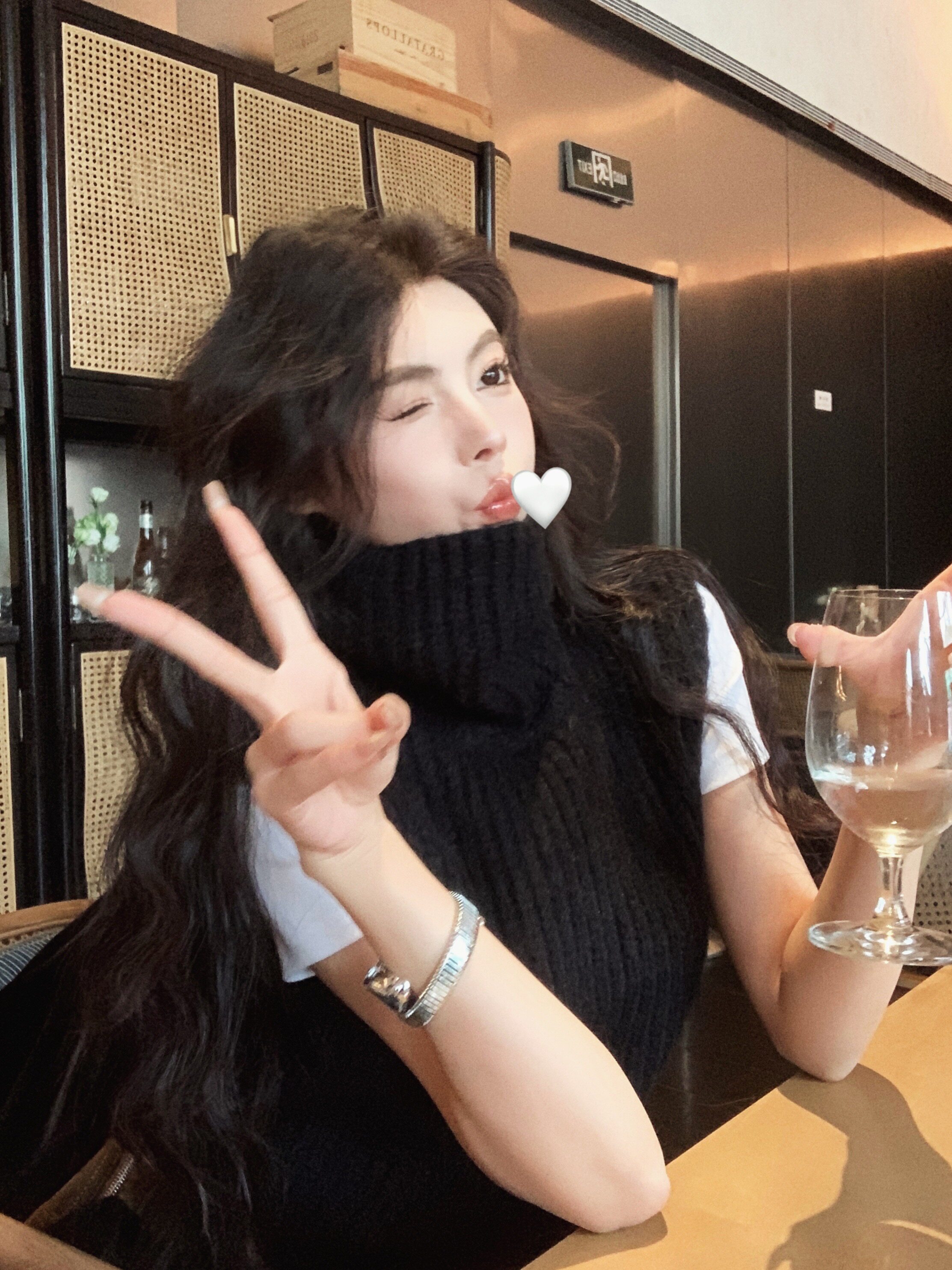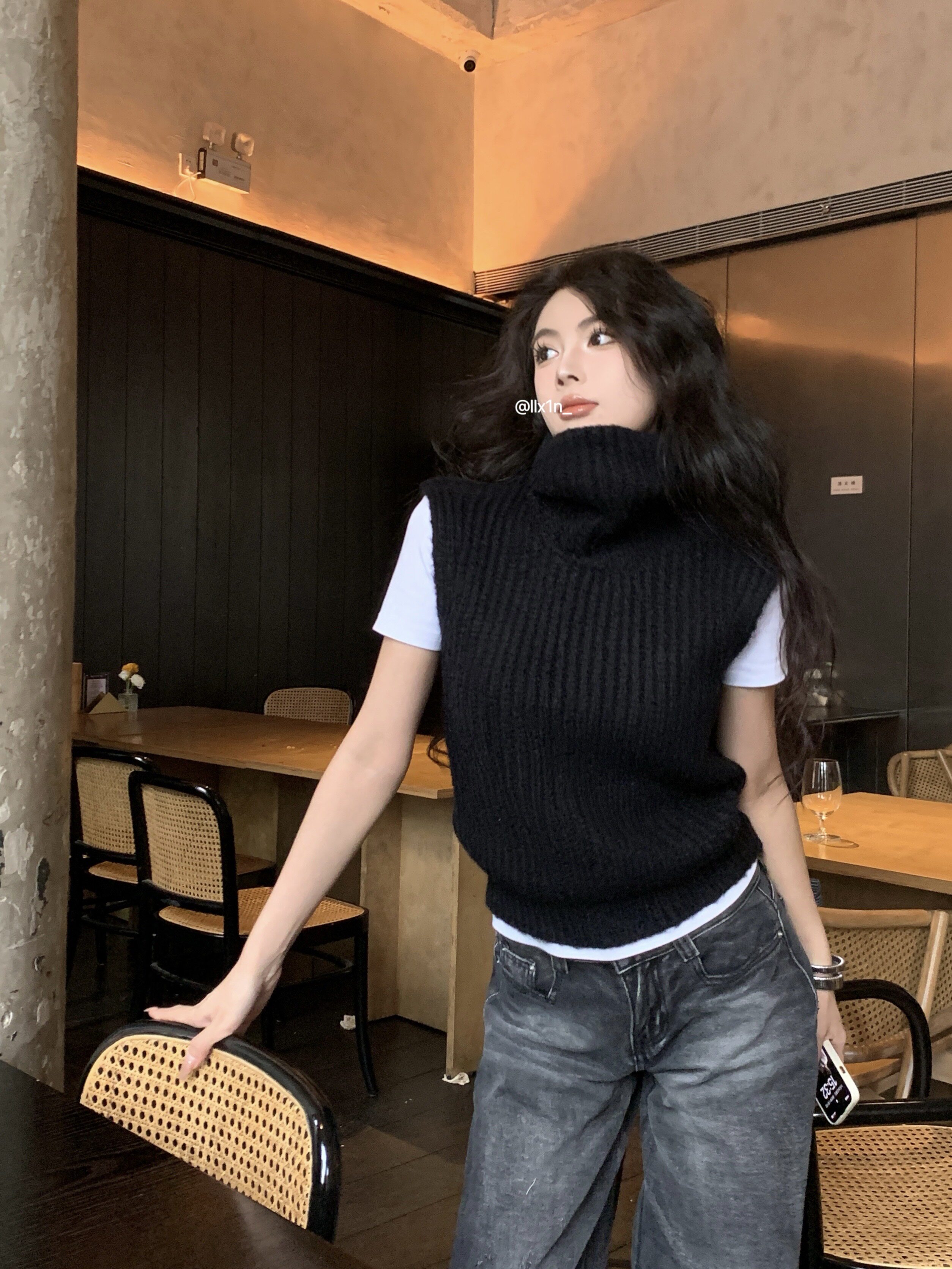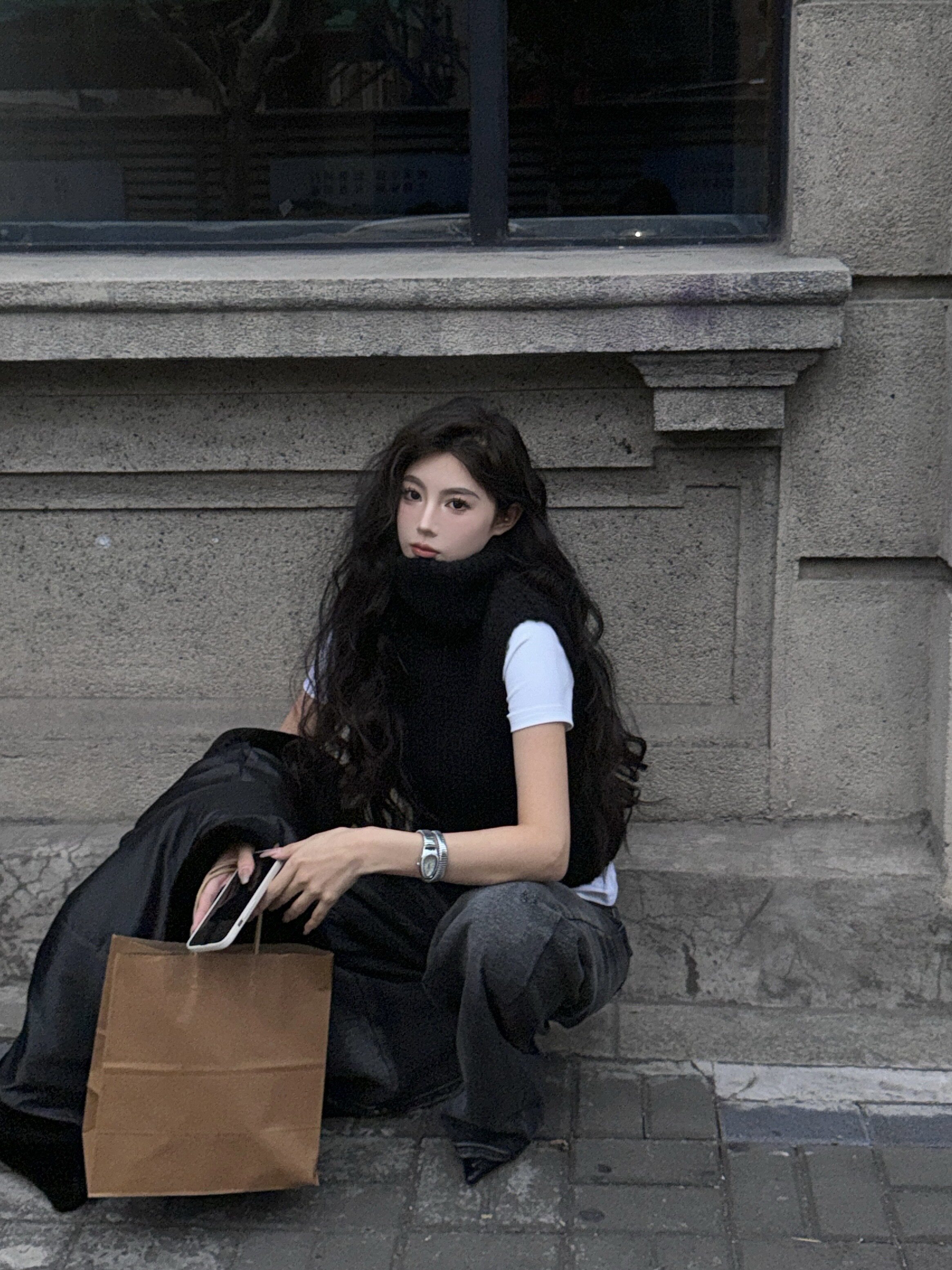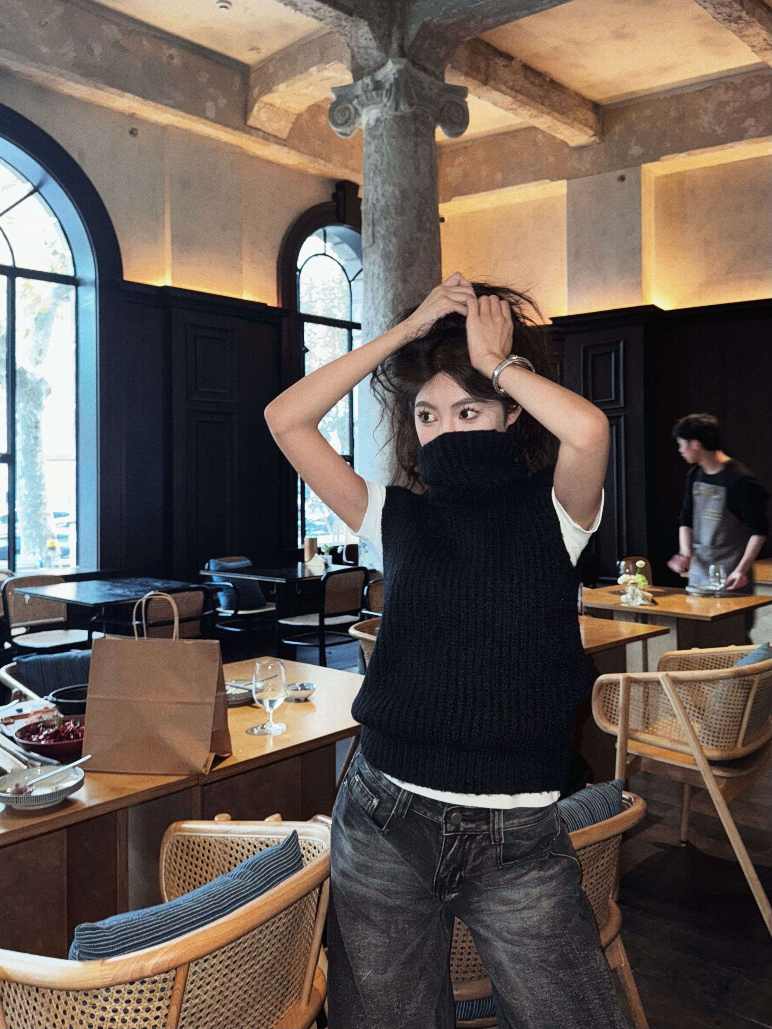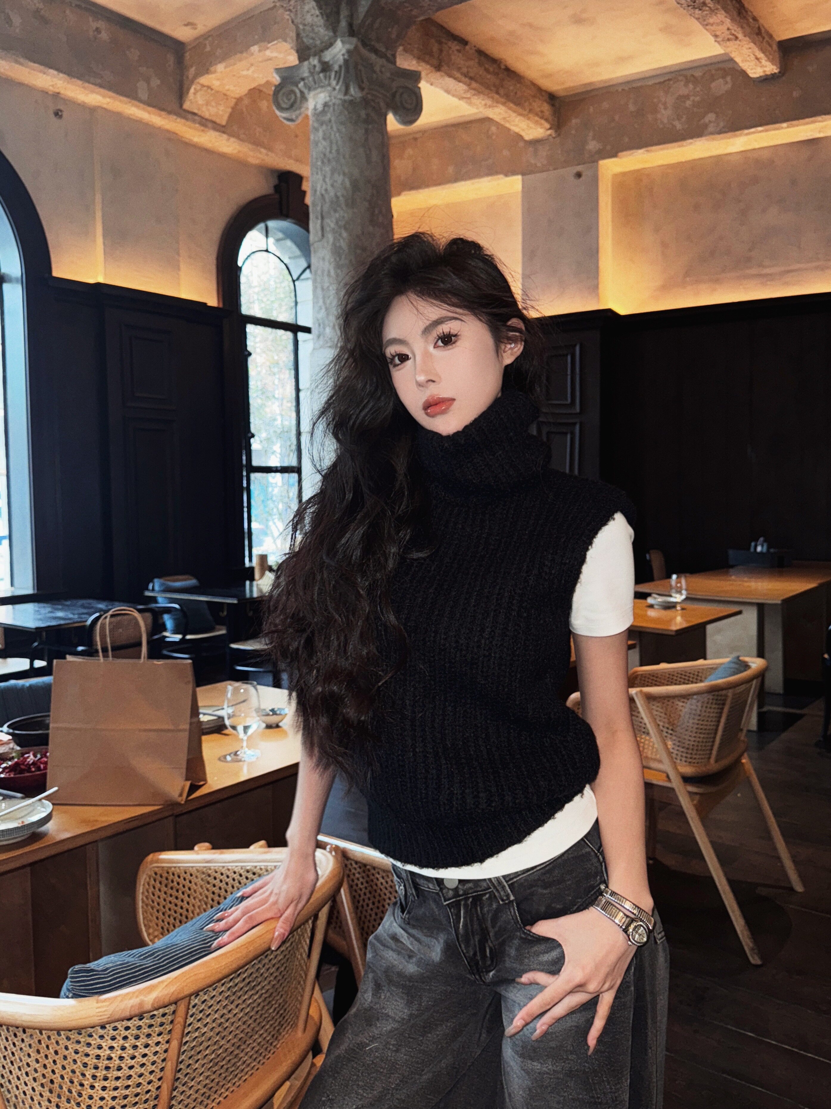 Old Money Style Black Turtleneck Knitted Vest for Women, Autumn and Winter Layered Design Sweater, Sleeveless Lazy Style Top