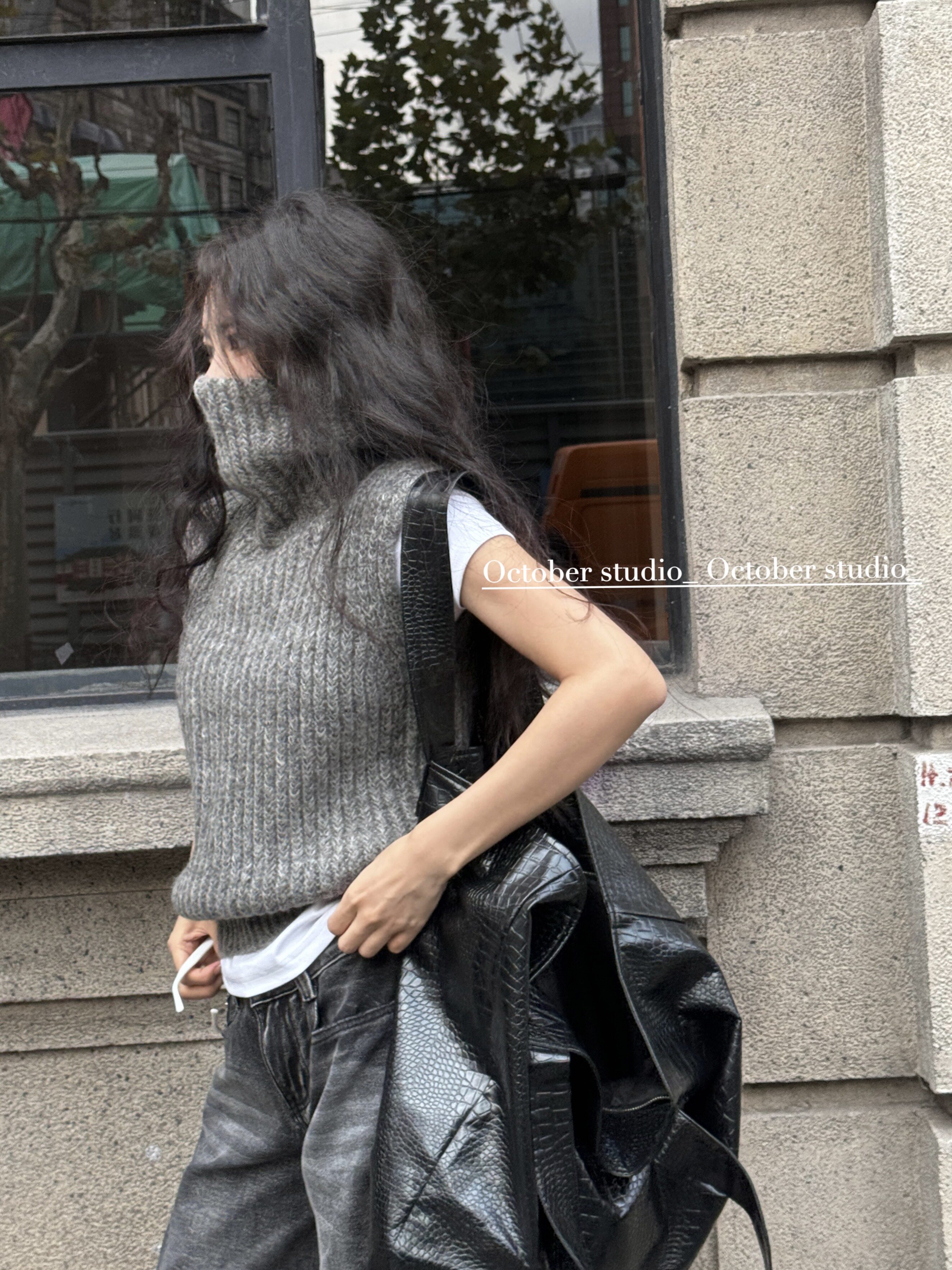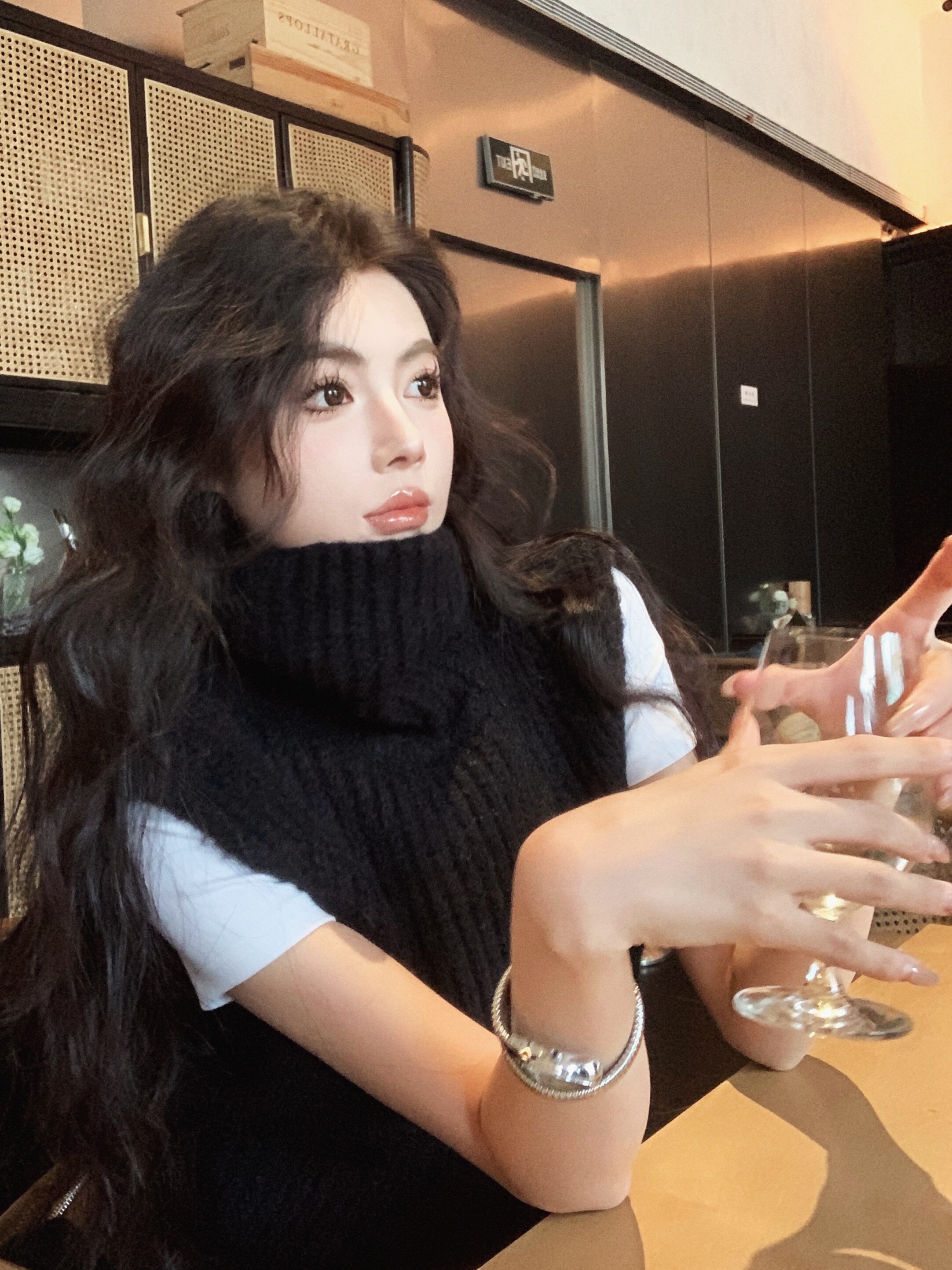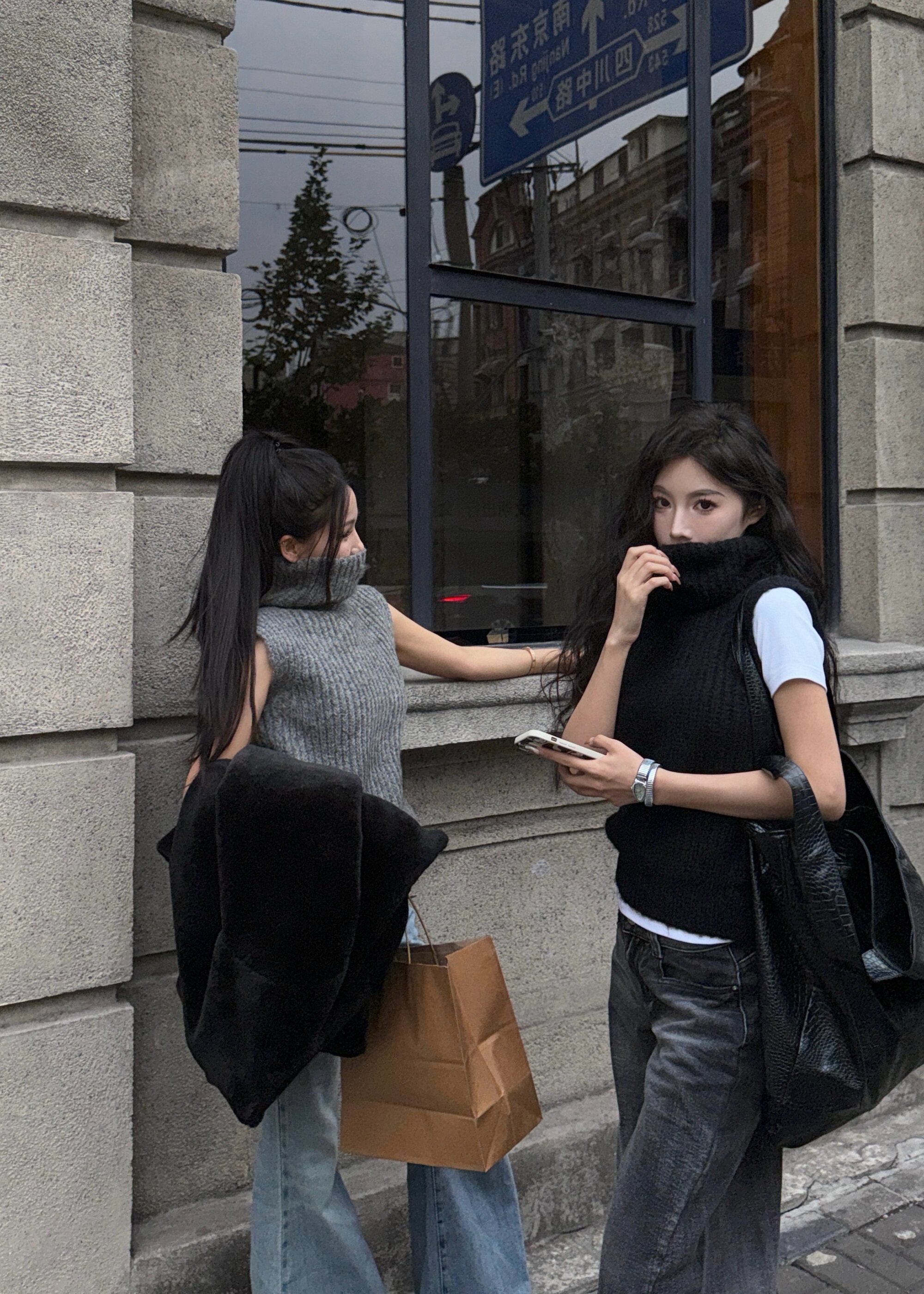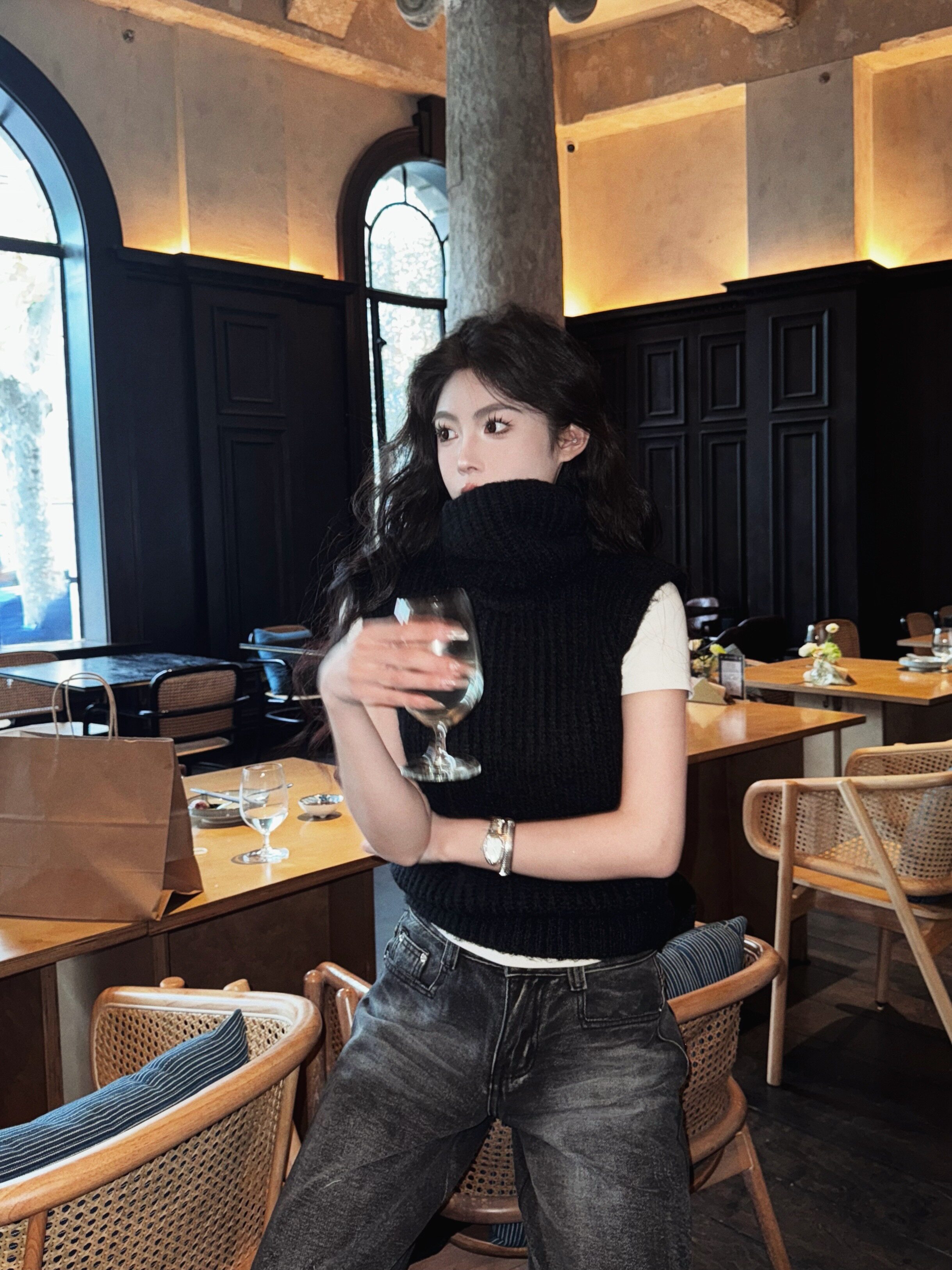 Old Money Style Black Turtleneck Knitted Vest for Women, Autumn and Winter Layered Design Sweater, Sleeveless Lazy Style Top