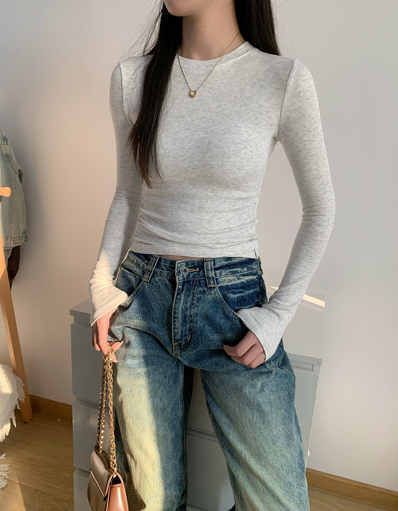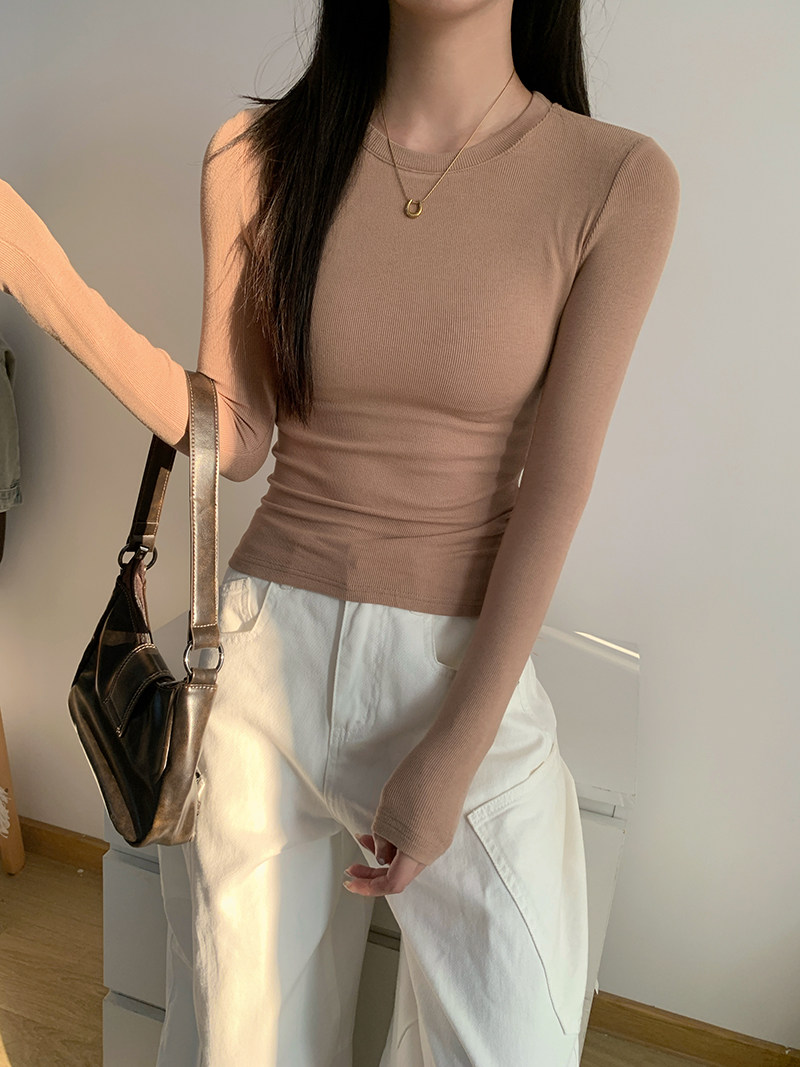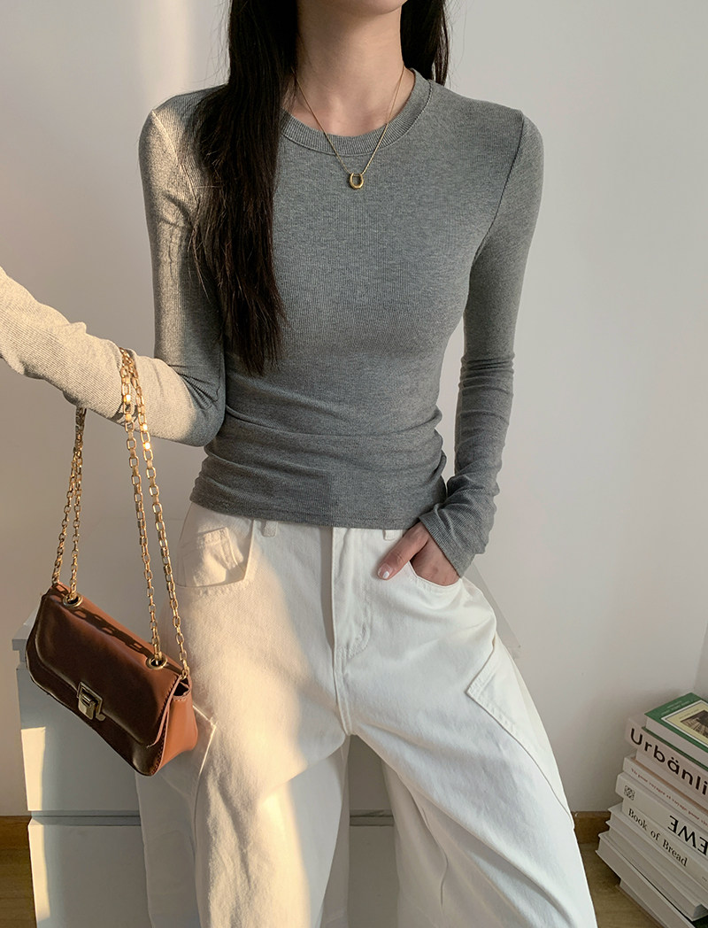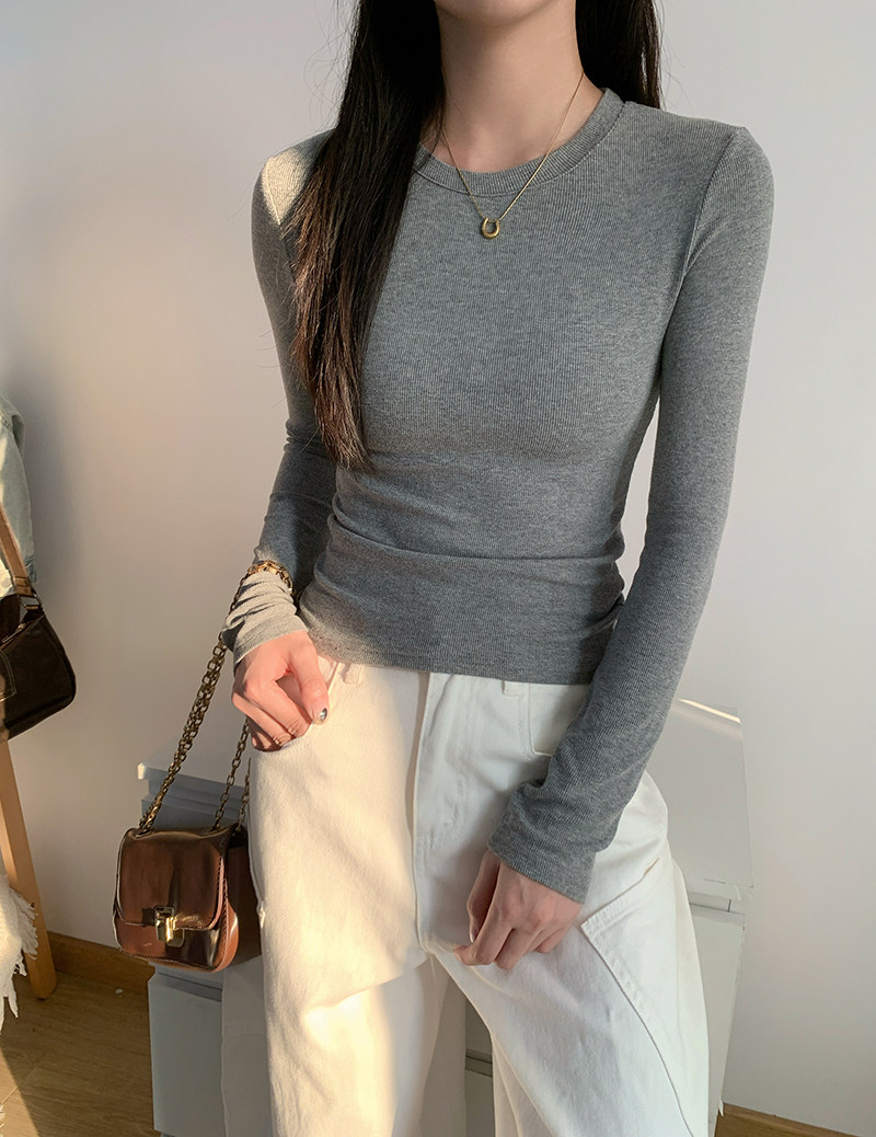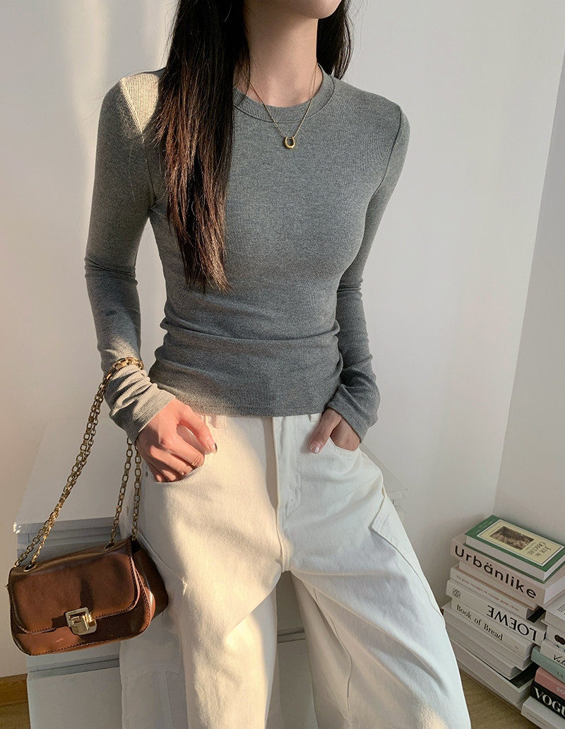 American-Style Gray Regular Shoulder Base Layer Top for Women, Autumn and Winter Long-Sleeve T-Shirt, Slim Fit Brushed Inner Wear Top
