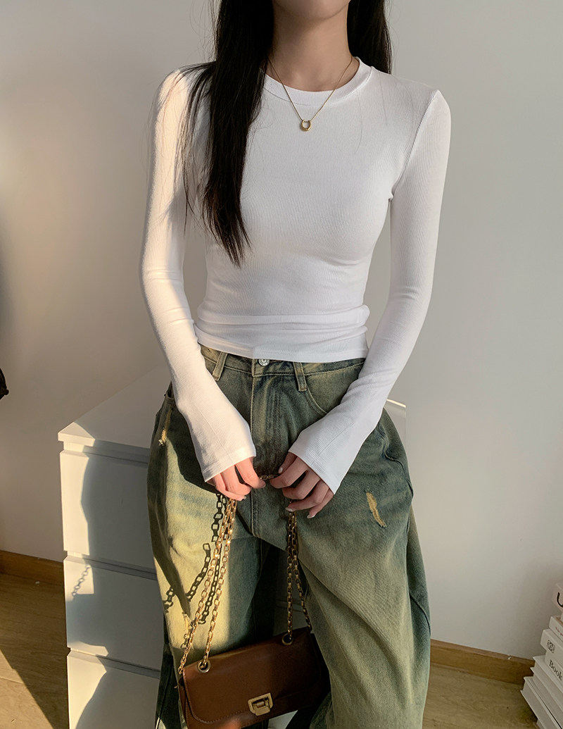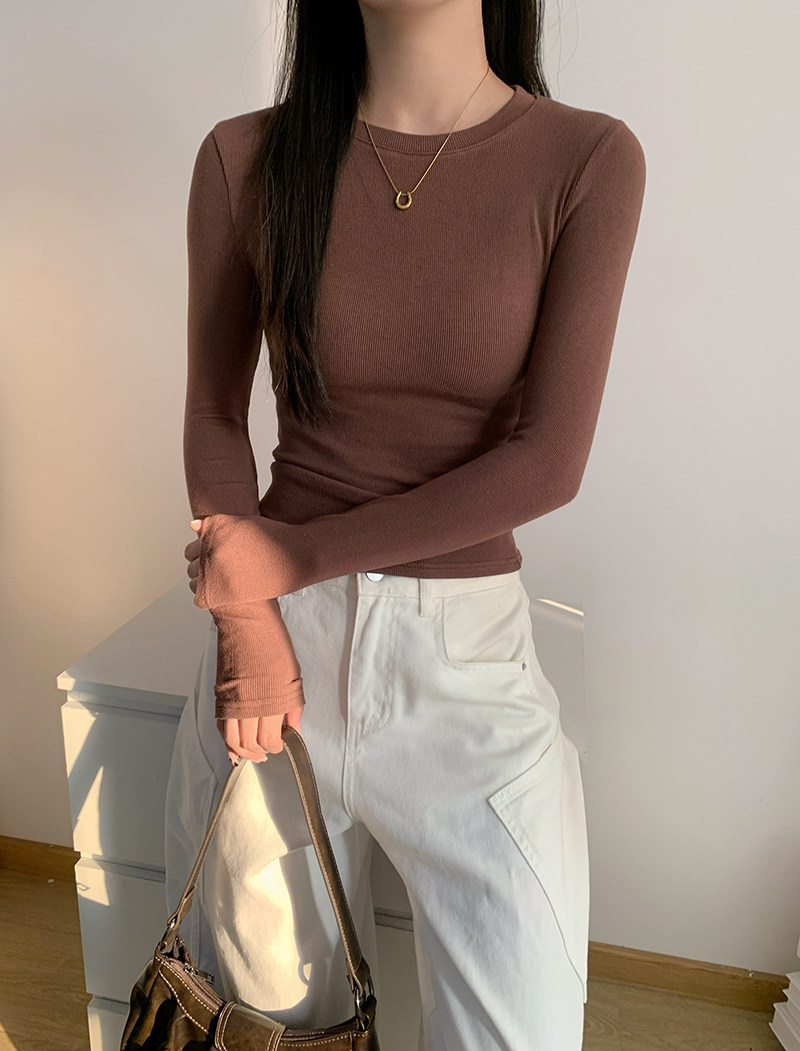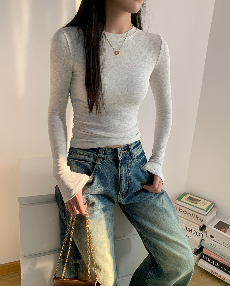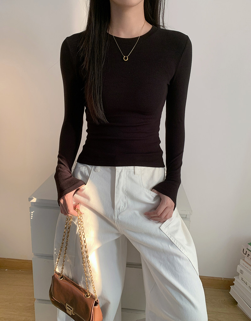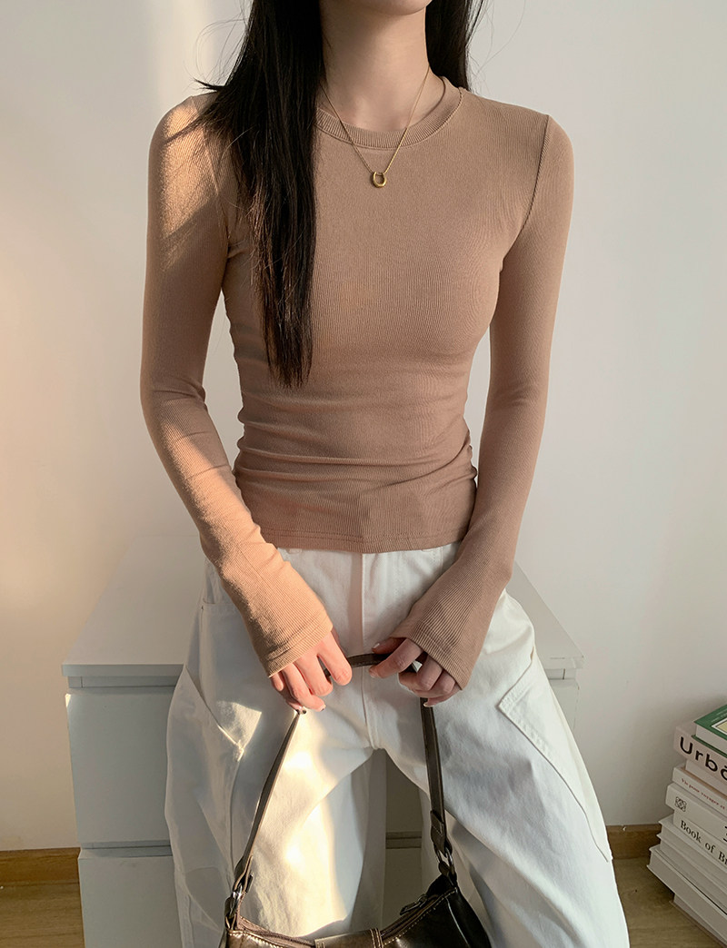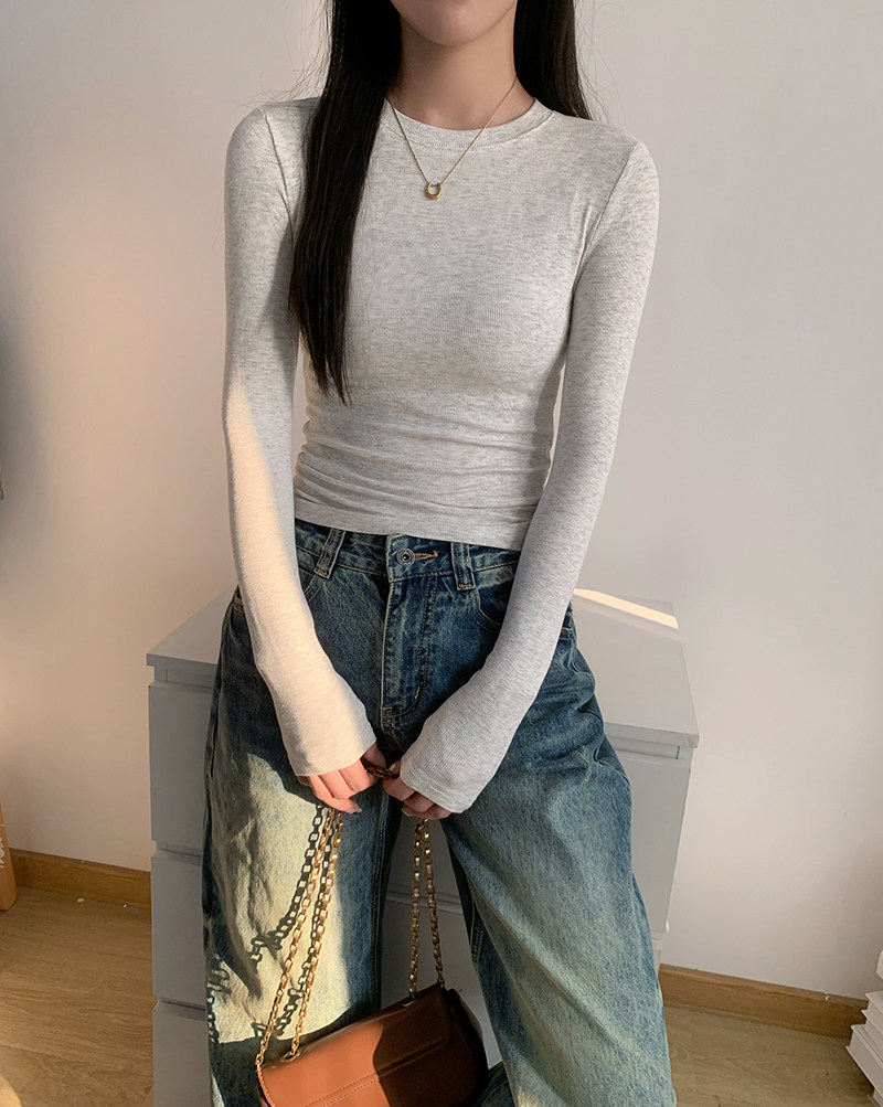American-Style Gray Regular Shoulder Base Layer Top for Women, Autumn and Winter Long-Sleeve T-Shirt, Slim Fit Brushed Inner Wear Top