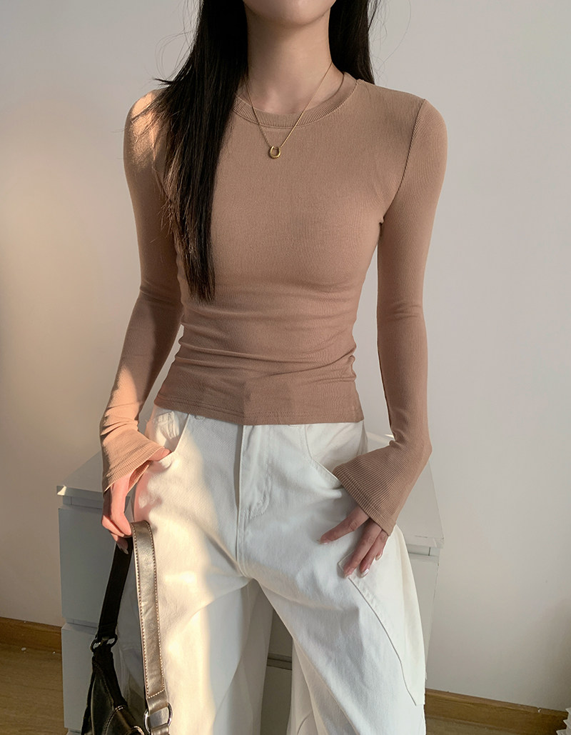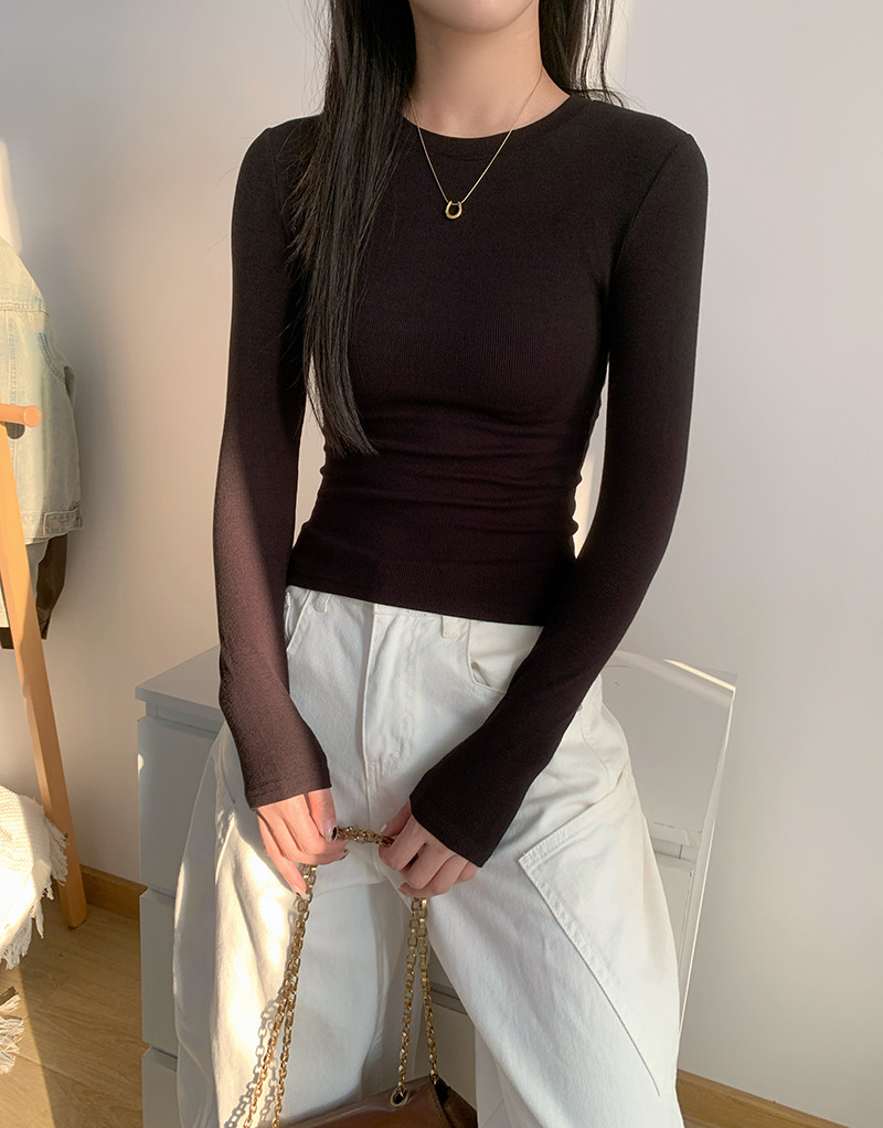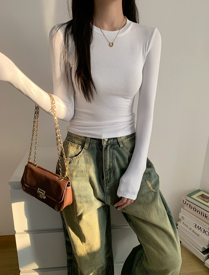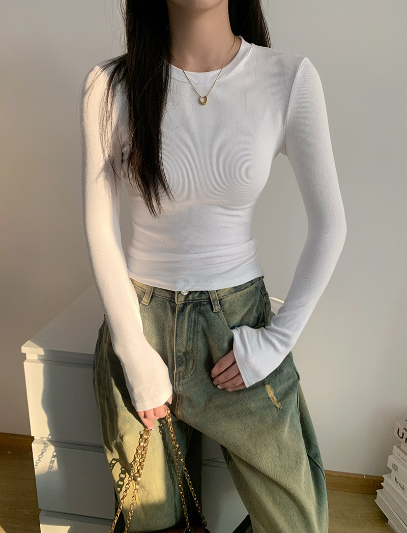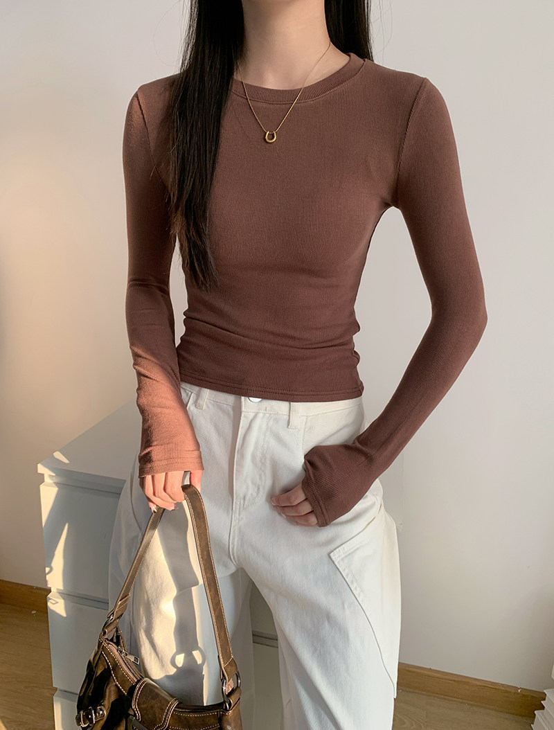 American-Style Gray Regular Shoulder Base Layer Top for Women, Autumn and Winter Long-Sleeve T-Shirt, Slim Fit Brushed Inner Wear Top