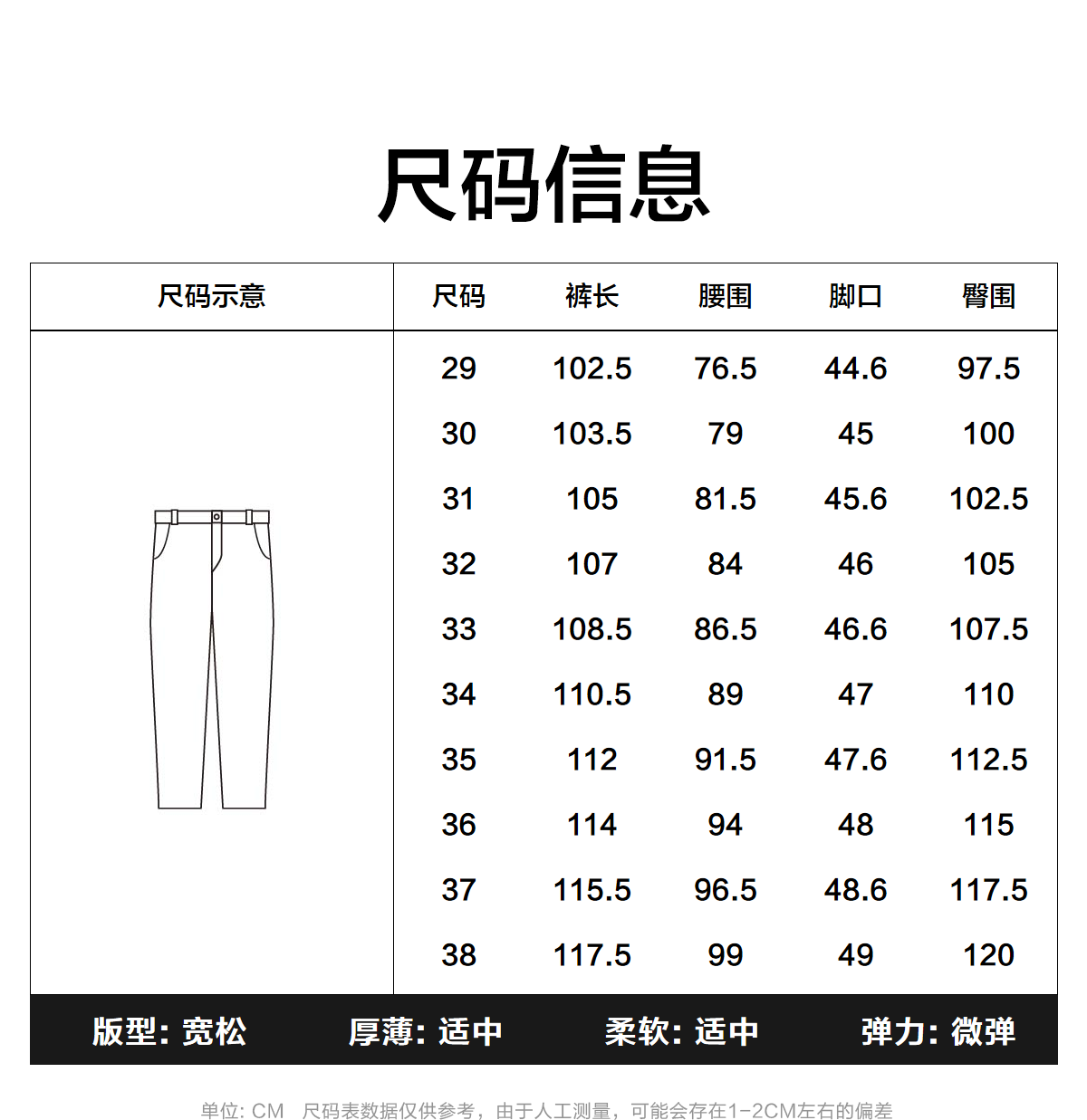 Outseam (cm) 99 cm 101.5 cm 104 cm 106.5 cm 109 cm