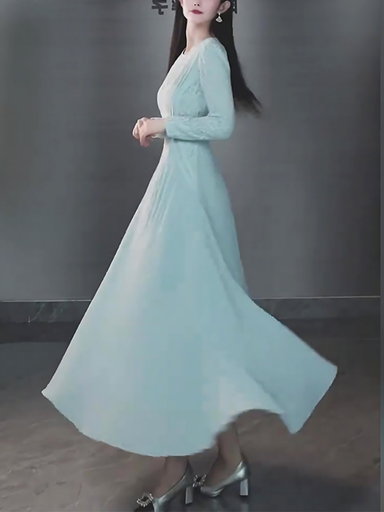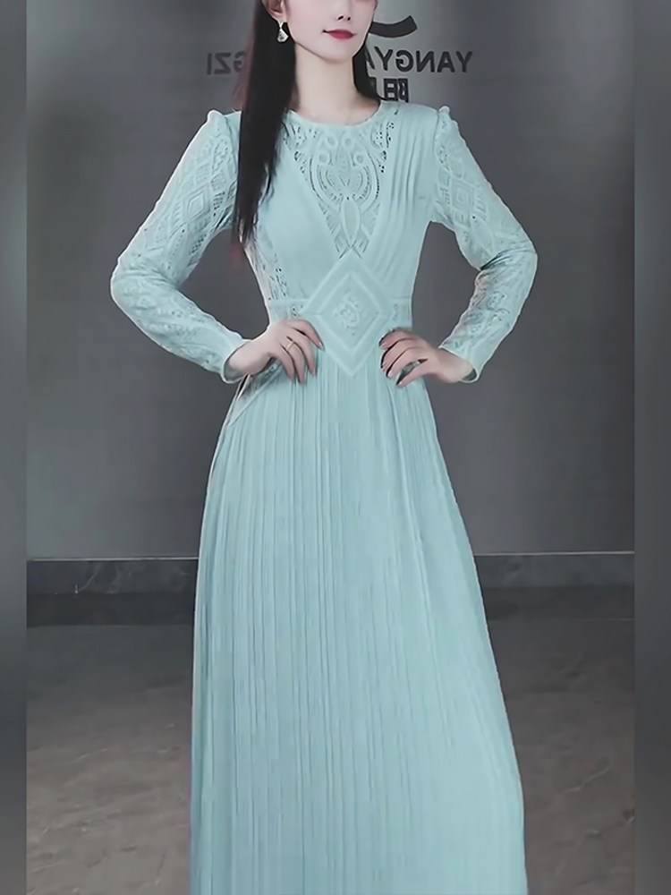 Mijie's 2025 Autumn New Stylish Blue Hollow-Out Round-Neck Dress for Women, Elegant and Slimming Mid-Length Dress
