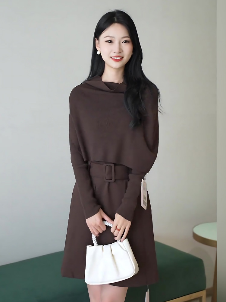 Mijie 2025 Autumn New Fashionable Coffee-Colored Fake Two-Piece Pleated Dress for Women, Elegant and Slimming Mid-Length Dress