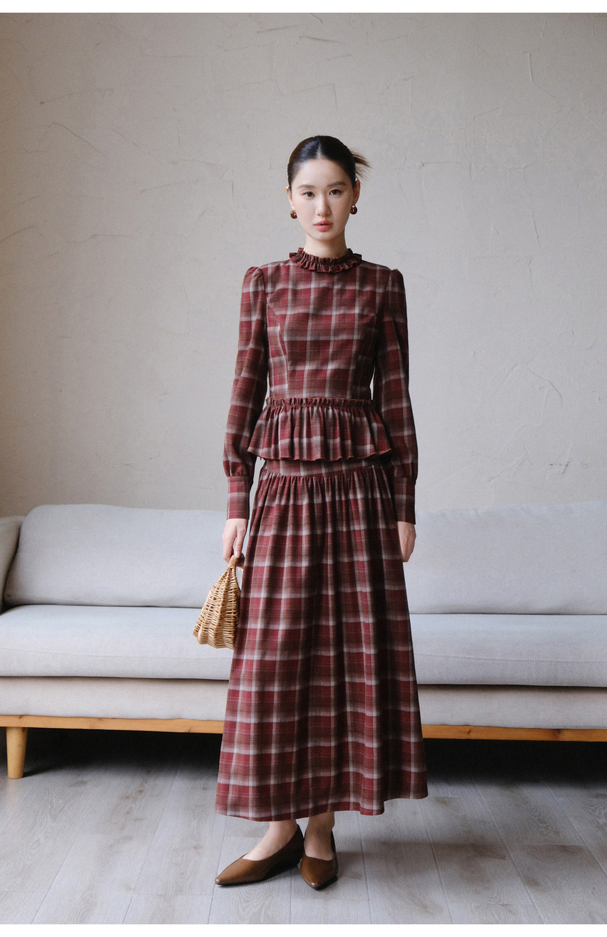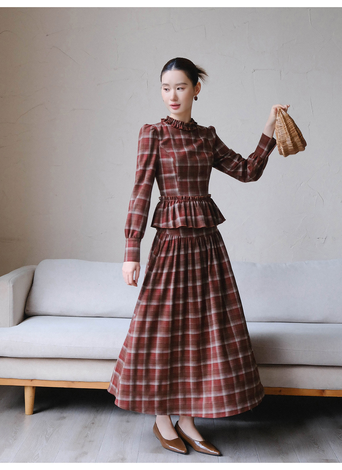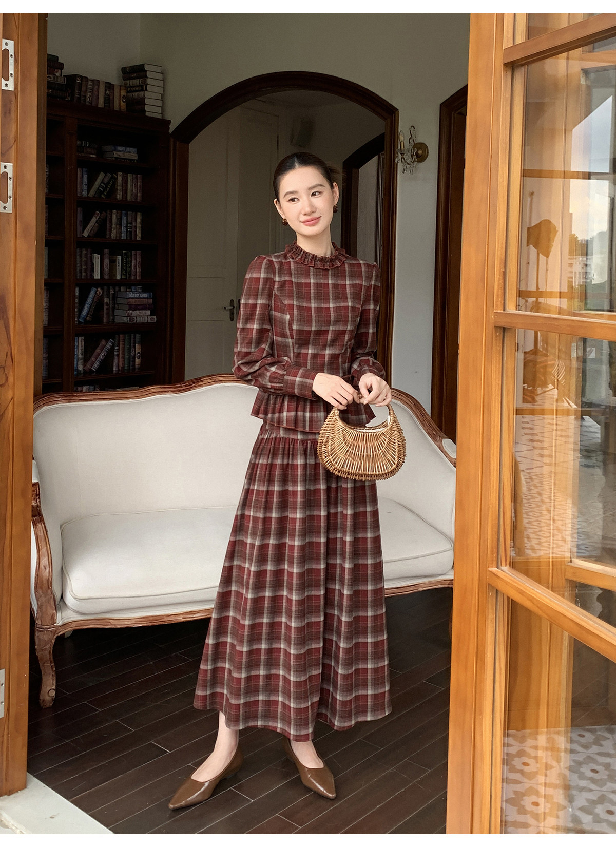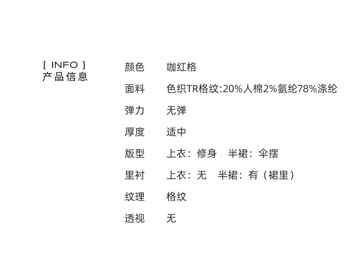 Sort by color Coffee red plaid-tops,Coffee red grid-skirt,Coffee red grid-suit