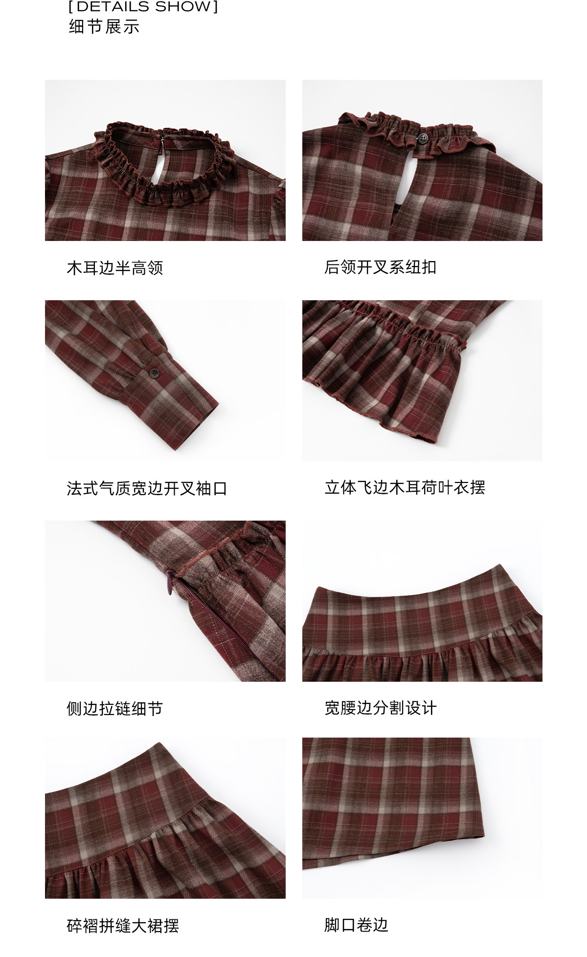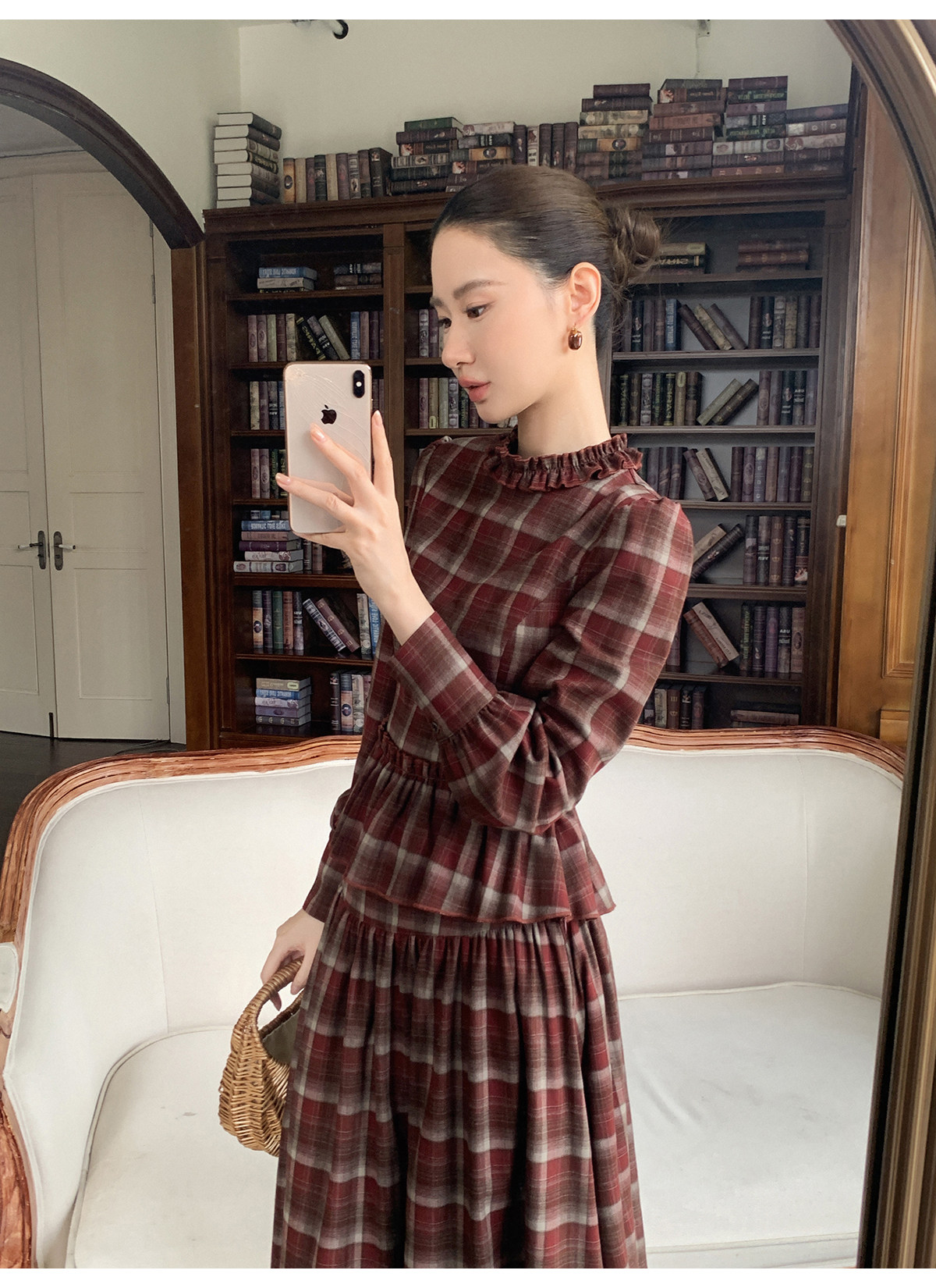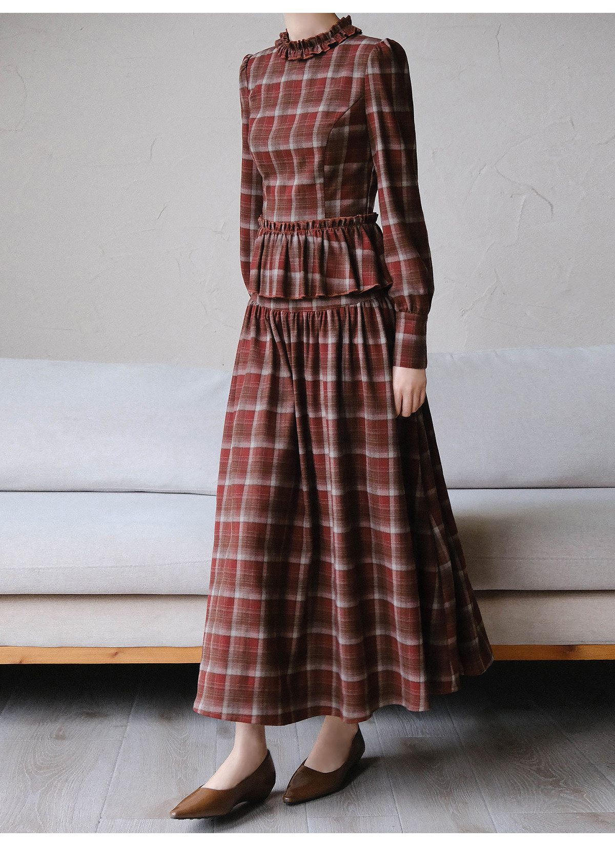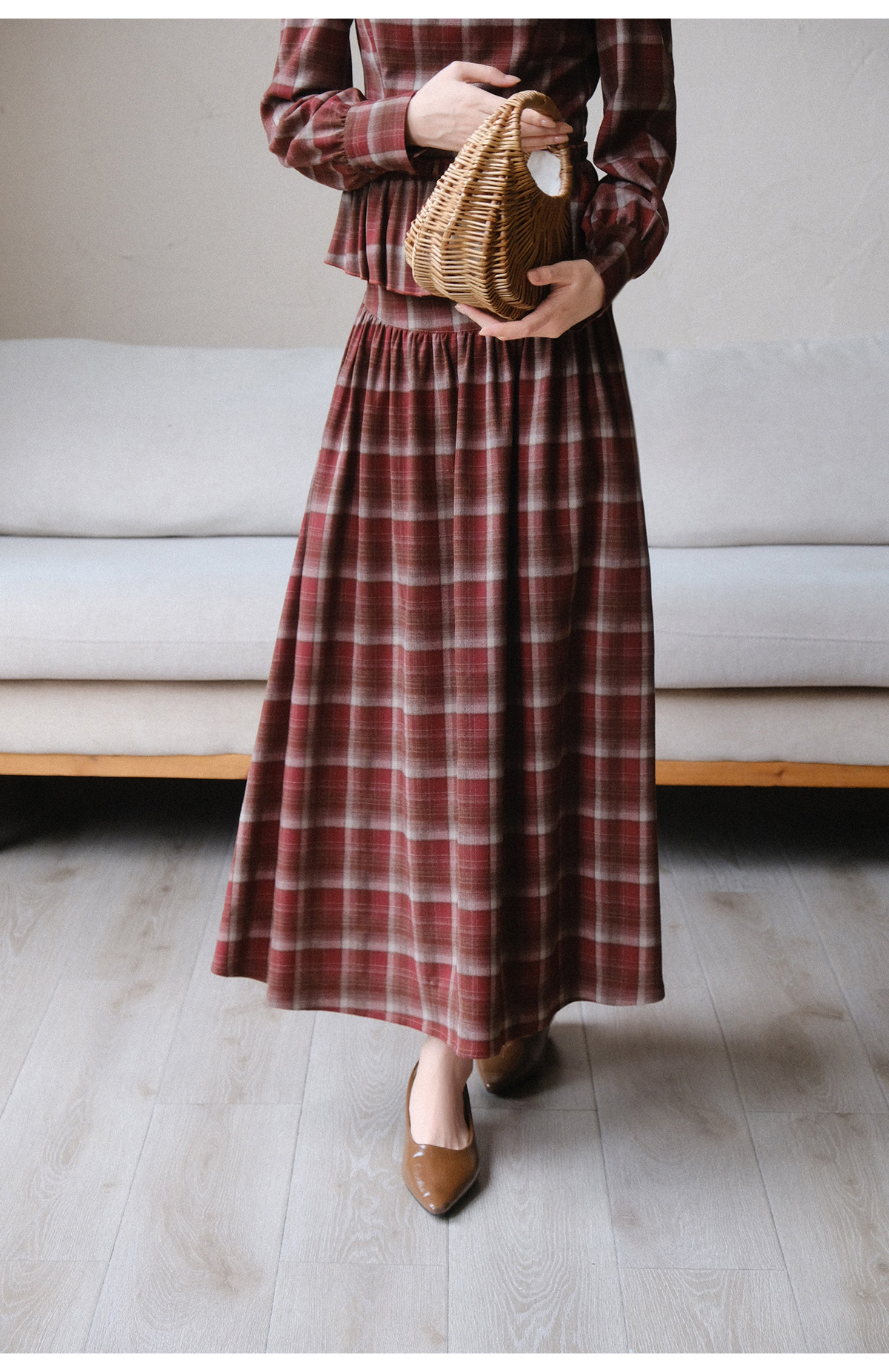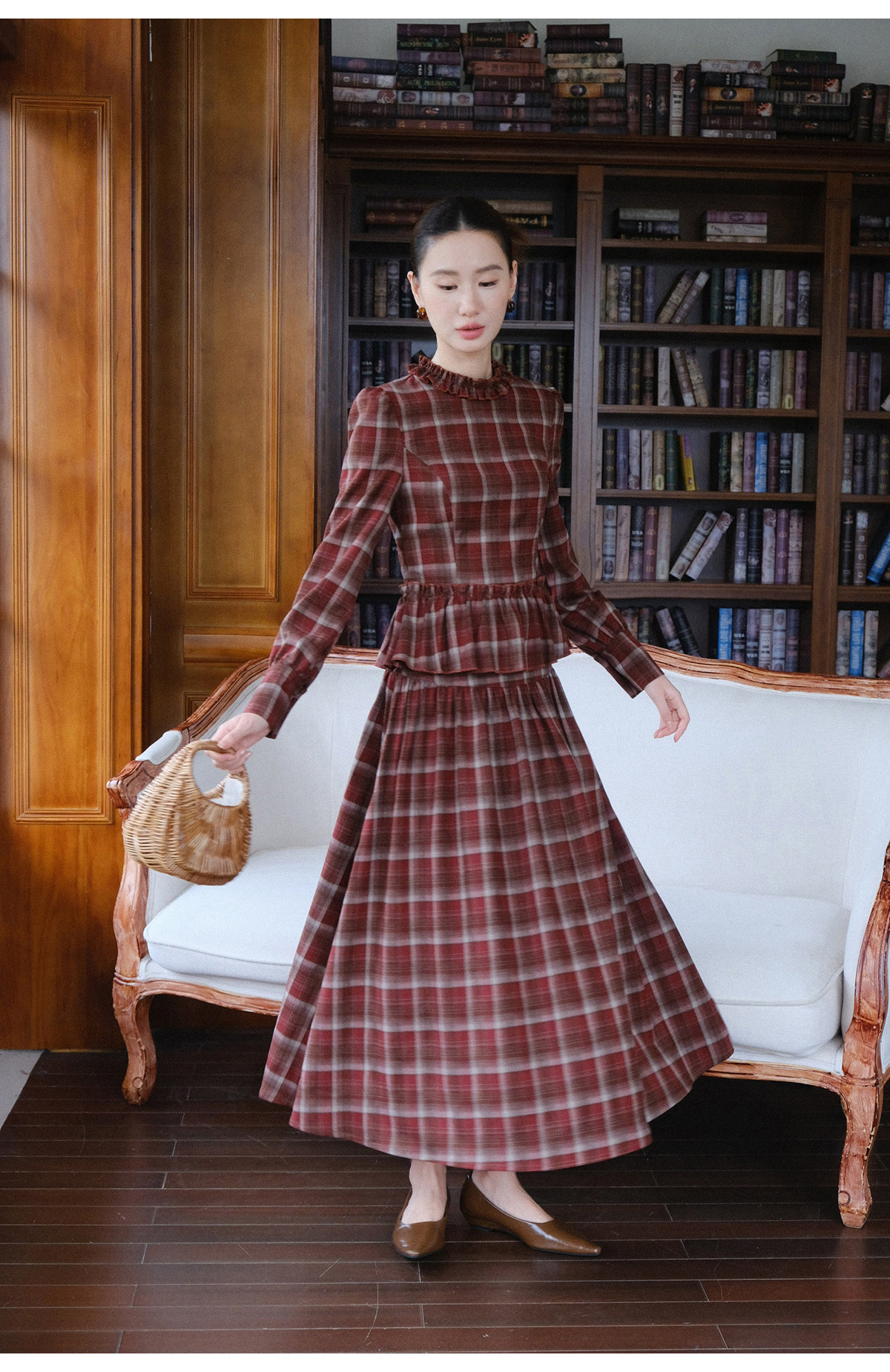 Sort by color Coffee red plaid-tops,Coffee red grid-skirt,Coffee red grid-suit