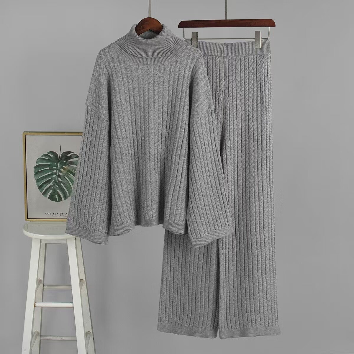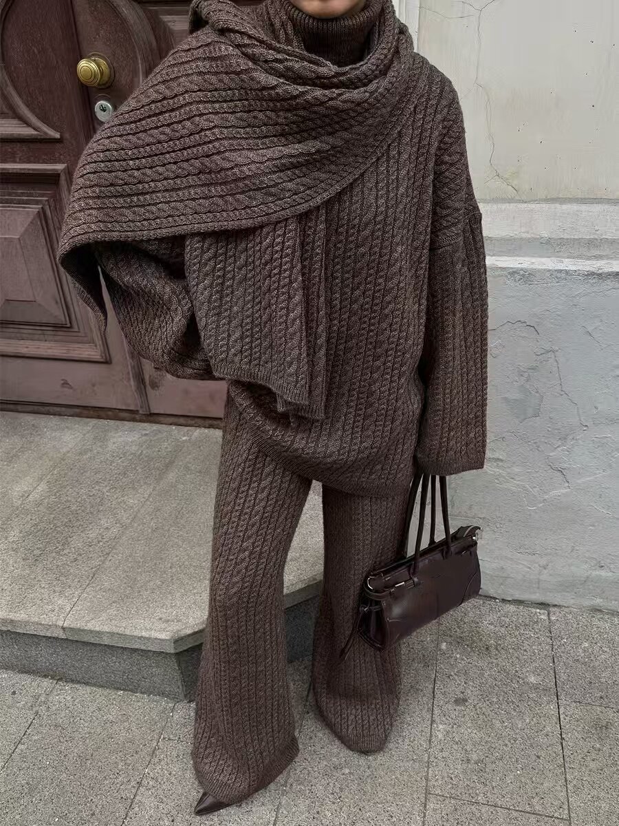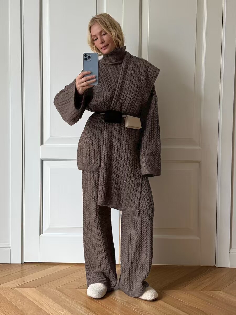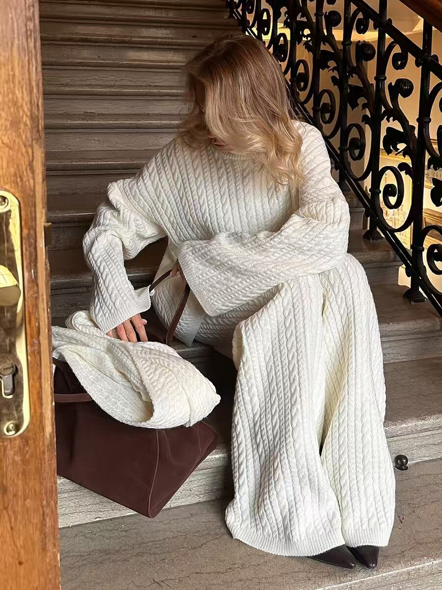 European and American New Fashion Casual Loose Knit Sweater + Wide-Leg Pants Set