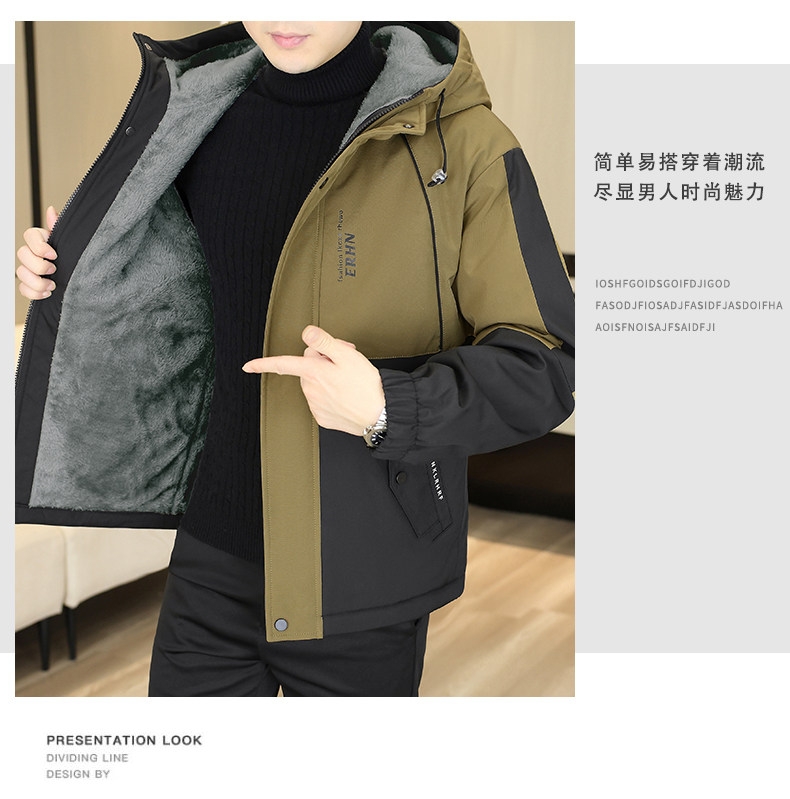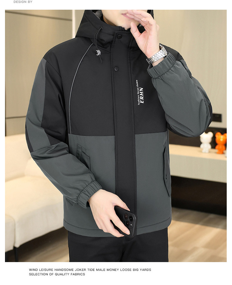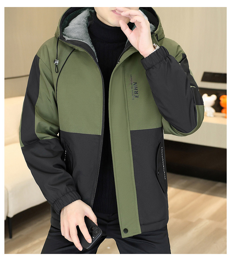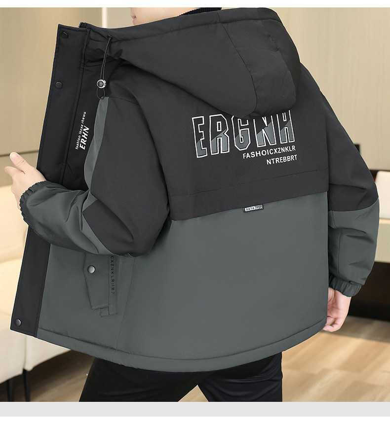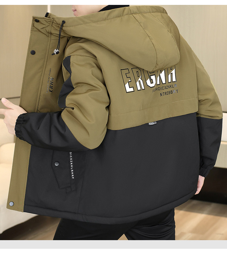 Fleece-Lined Thick Hooded Jacket for Men, Autumn and Winter, Trendy Color-Blocked Casual Warm and Cold-Proof Jacket for Teenagers