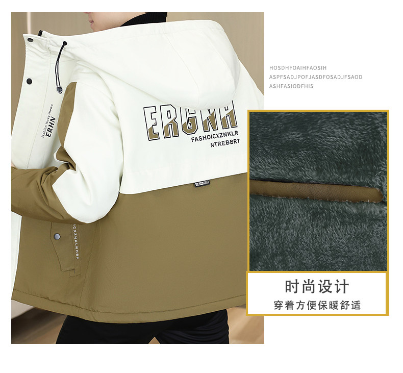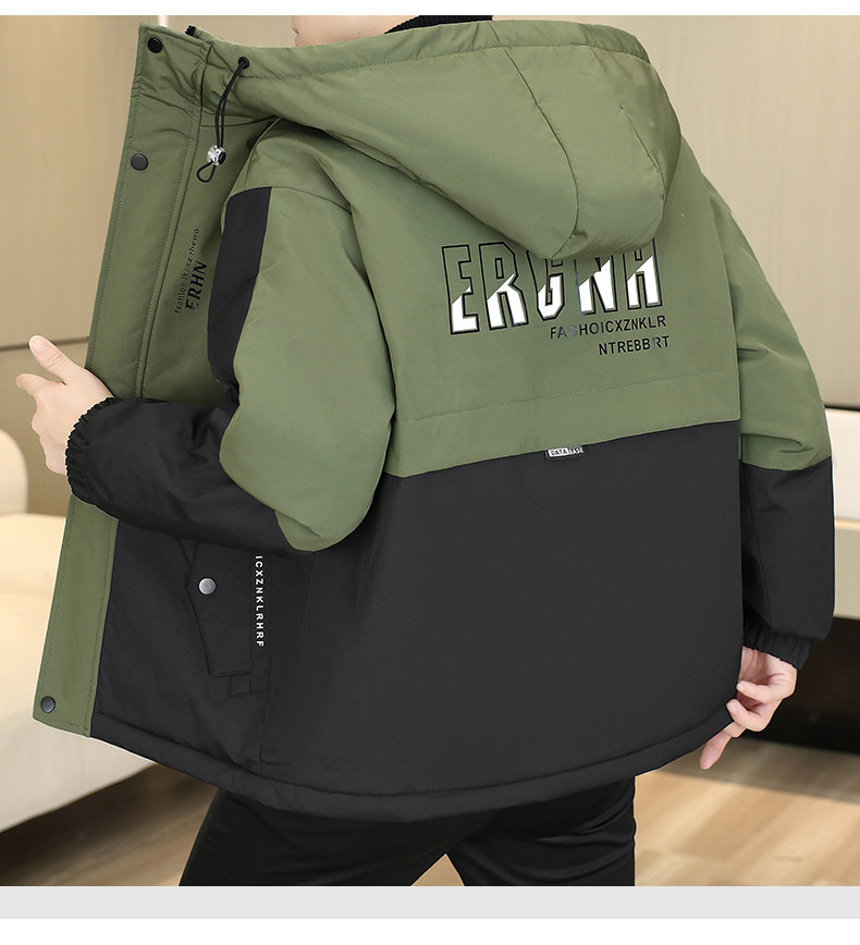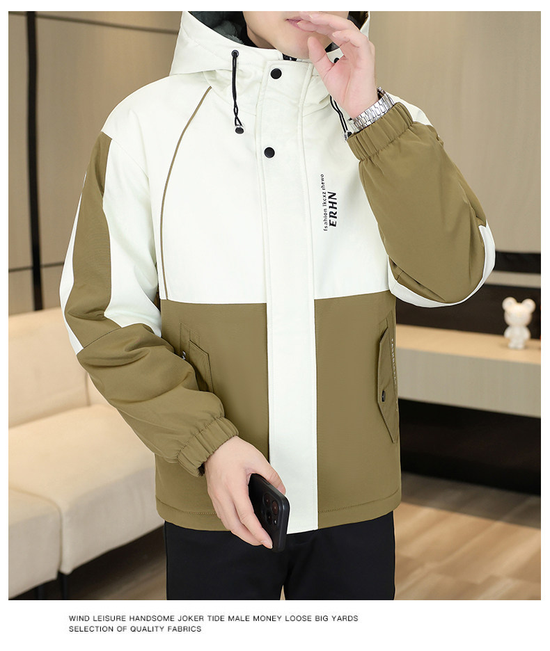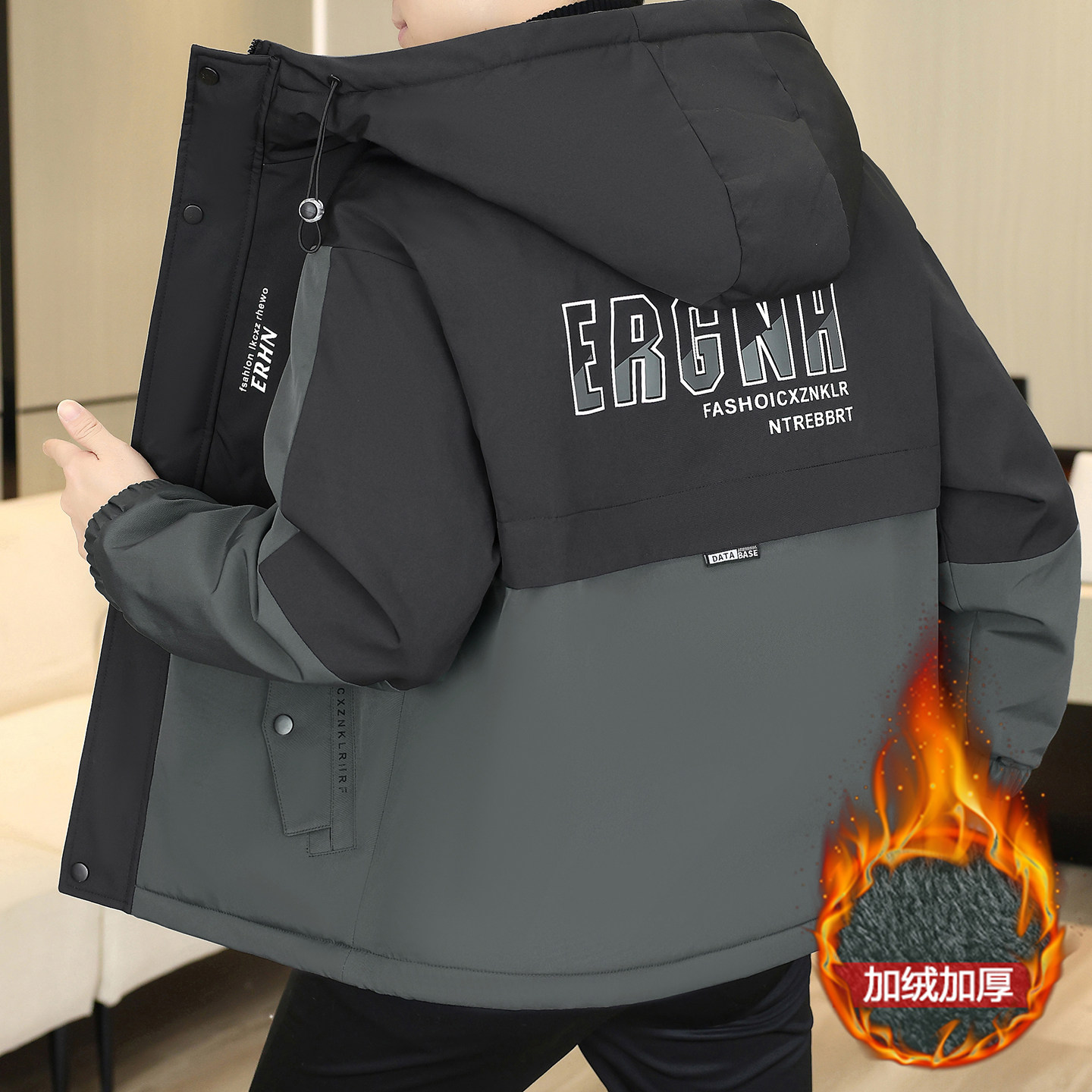 Fleece-Lined Thick Hooded Jacket for Men, Autumn and Winter, Trendy Color-Blocked Casual Warm and Cold-Proof Jacket for Teenagers