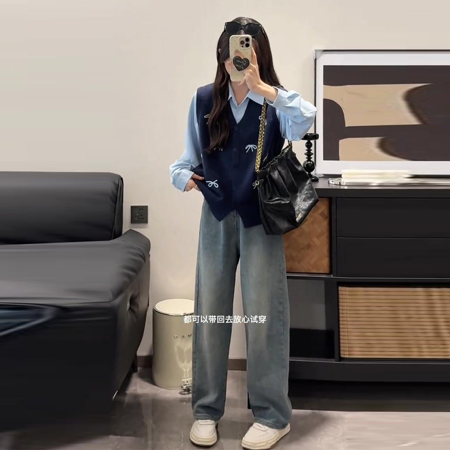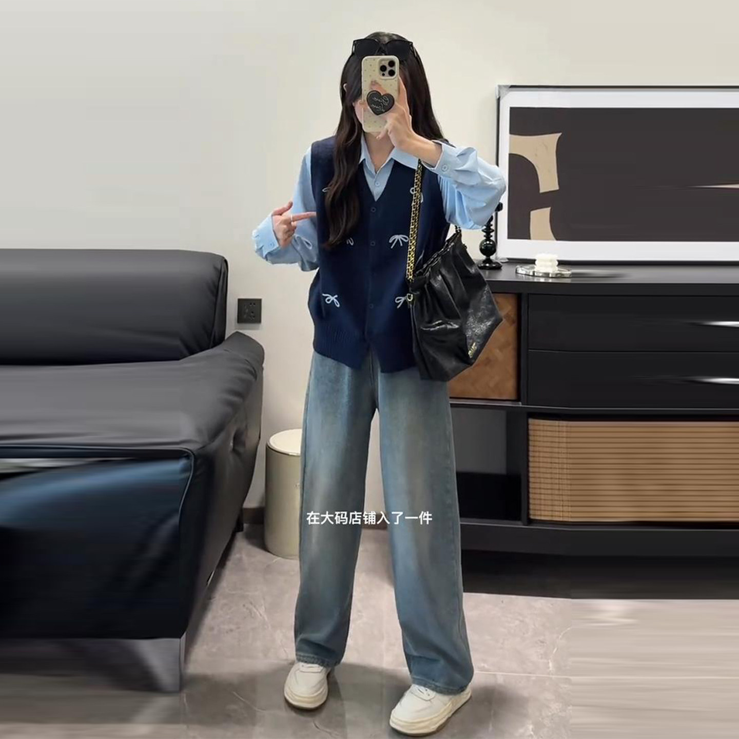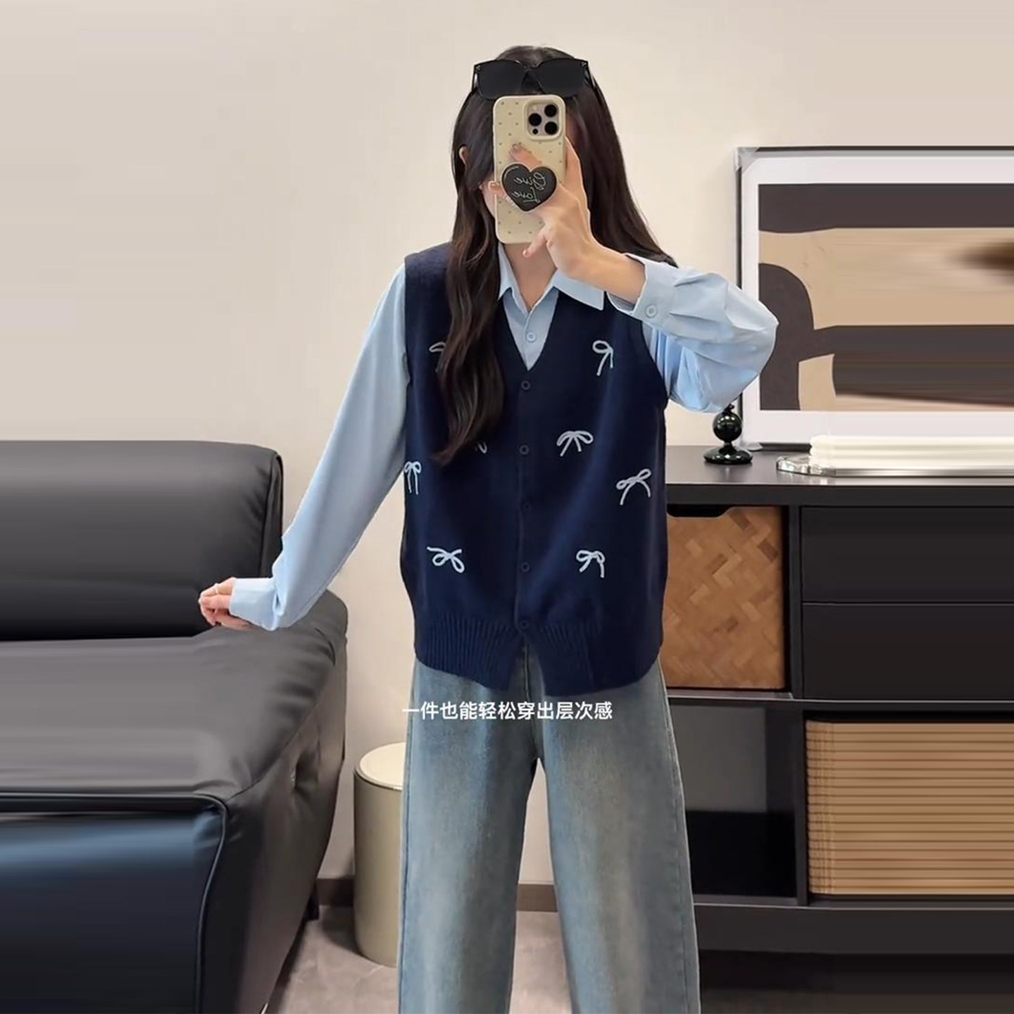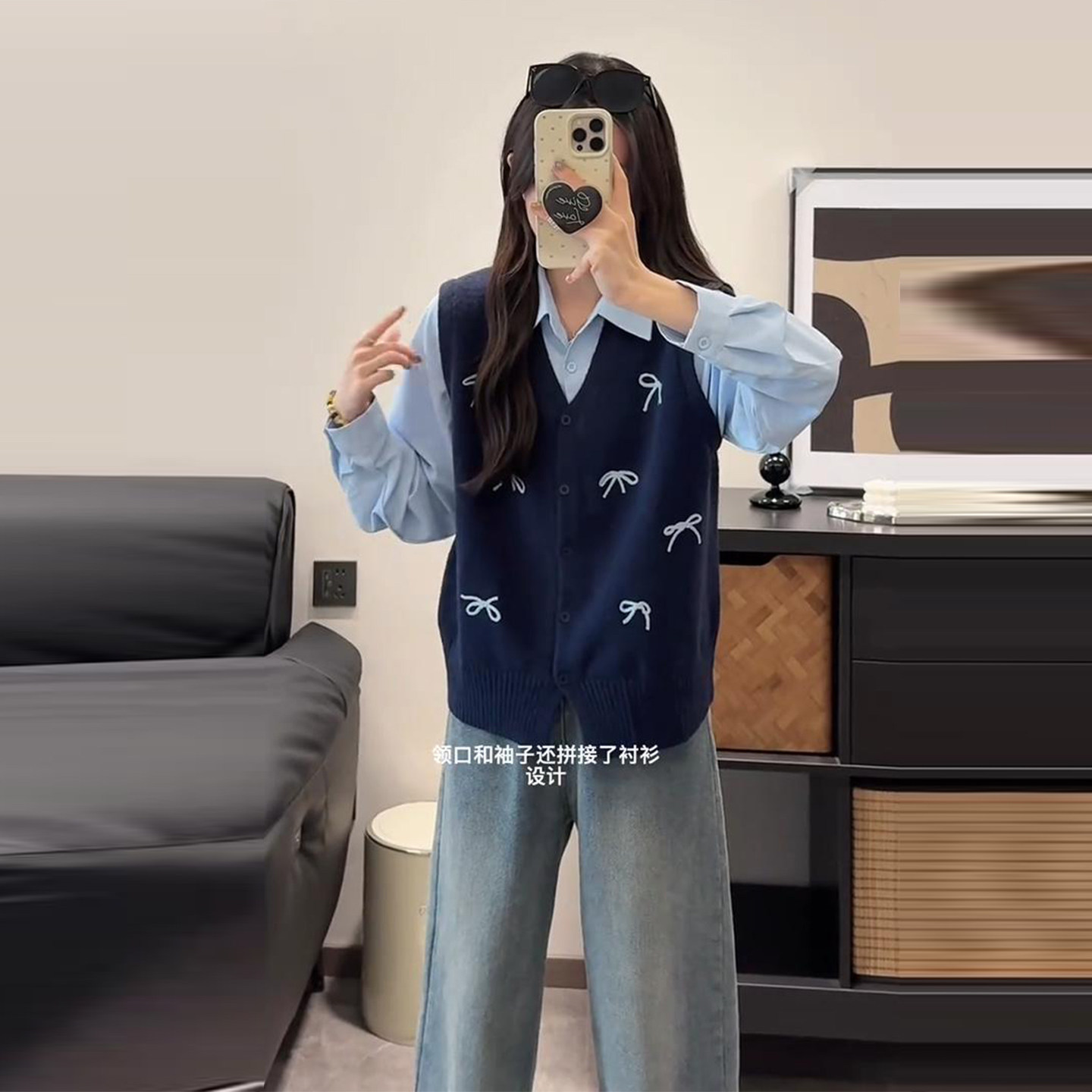 Plus-Size Preppy Style Vest with Fake Two-Piece Long-Sleeve Shirt for Women, Autumn and Winter, Slimming Loose Design, Niche Top for Chubby Girls