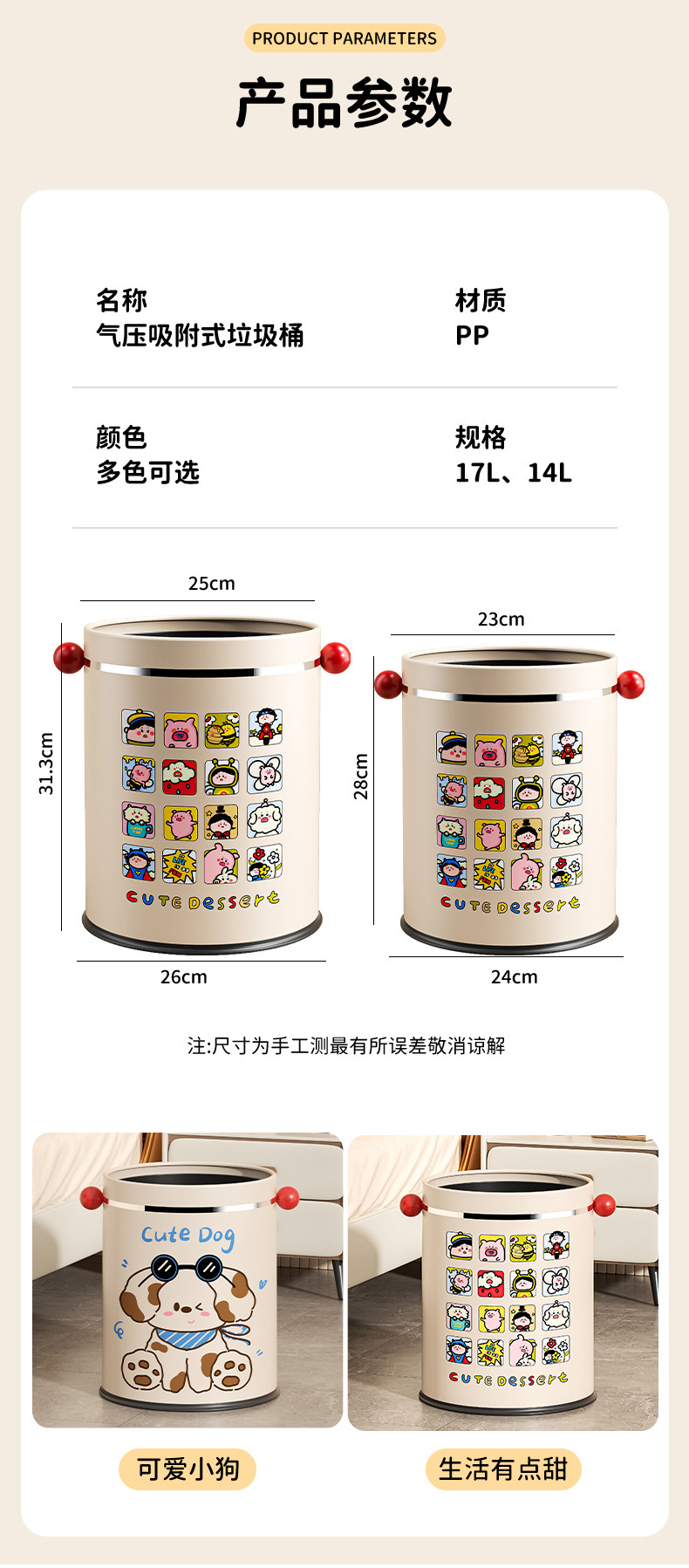Sort by color Medium size 14L cream white cute puppy inner and outer double barrels,Medium size 14L cream white, life is a little sweet, double barrel inside and outside,Large 17L Cream White Cute Puppy Adsorption Bag,Large size 17L cream white life is a little sweet adsorption bag,Medium size 14L cream white cute puppy + ear handles double barrels inside and outside,Medium 14L cream white, life is a little sweet + ear handles, double barrels inside and outside,Large size 17L cream white cute puppy + ear handles air pressure adsorption,Large size 17L cream white, life is a little sweet + ear handles, air pressure adsorption
