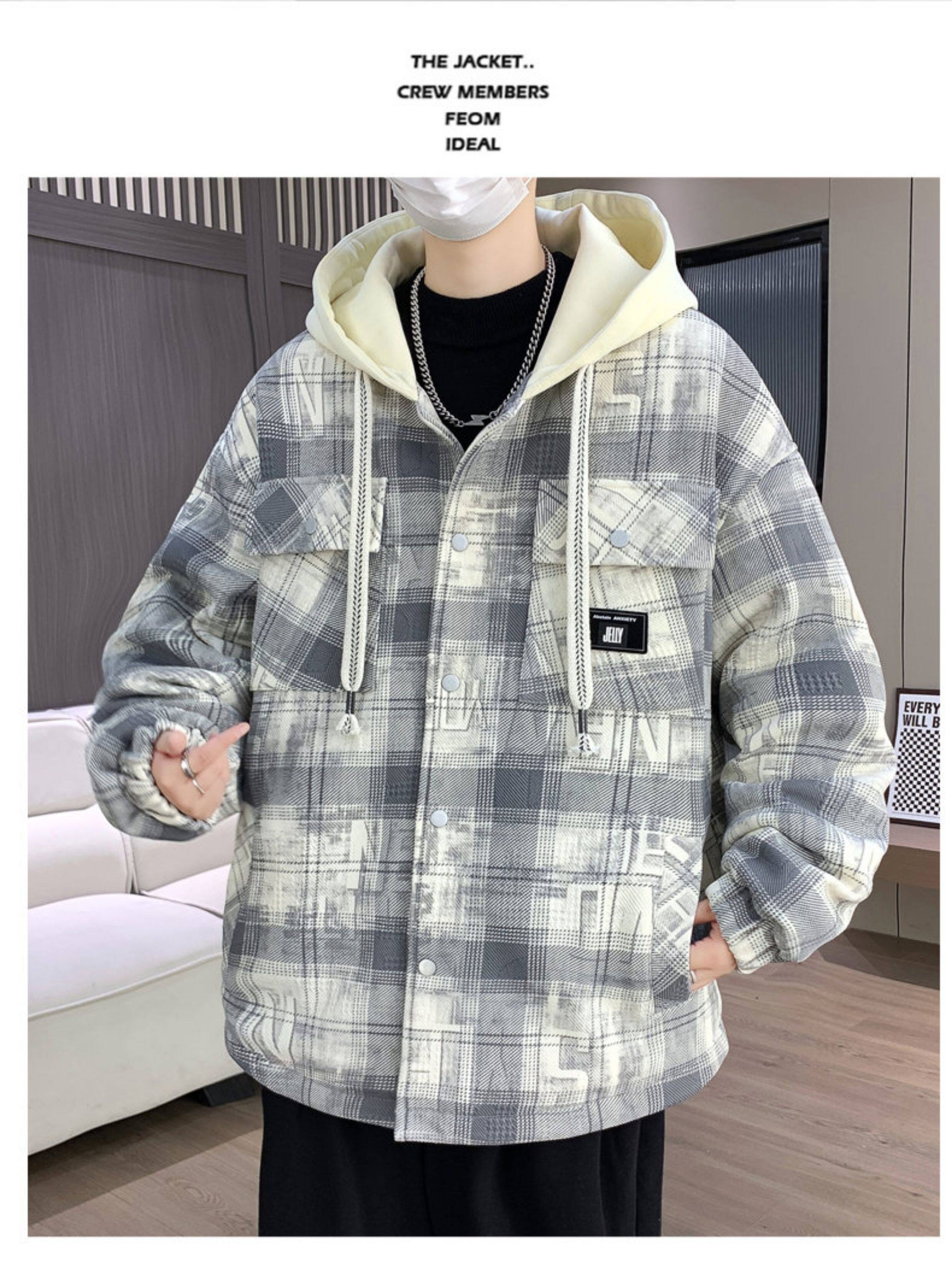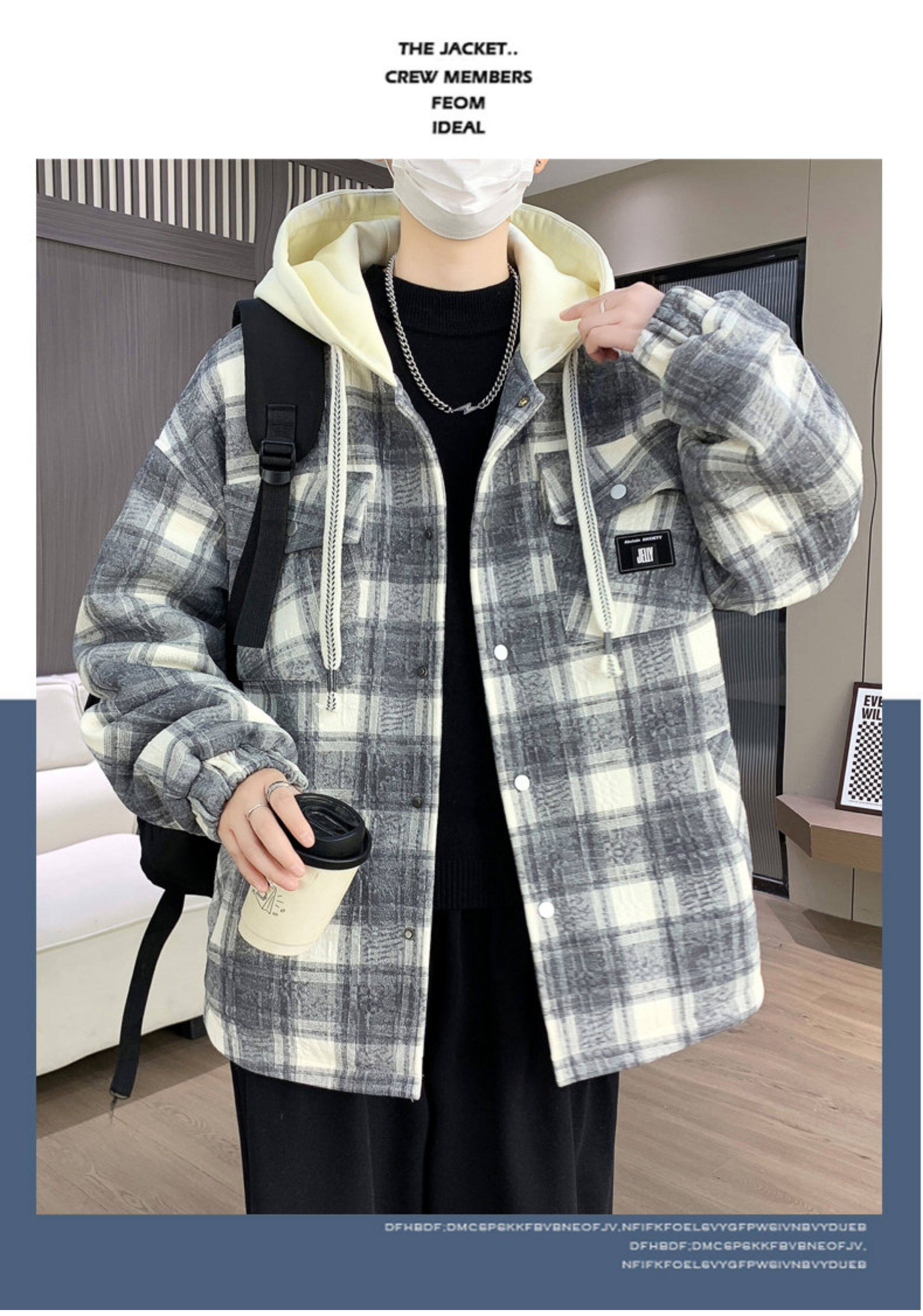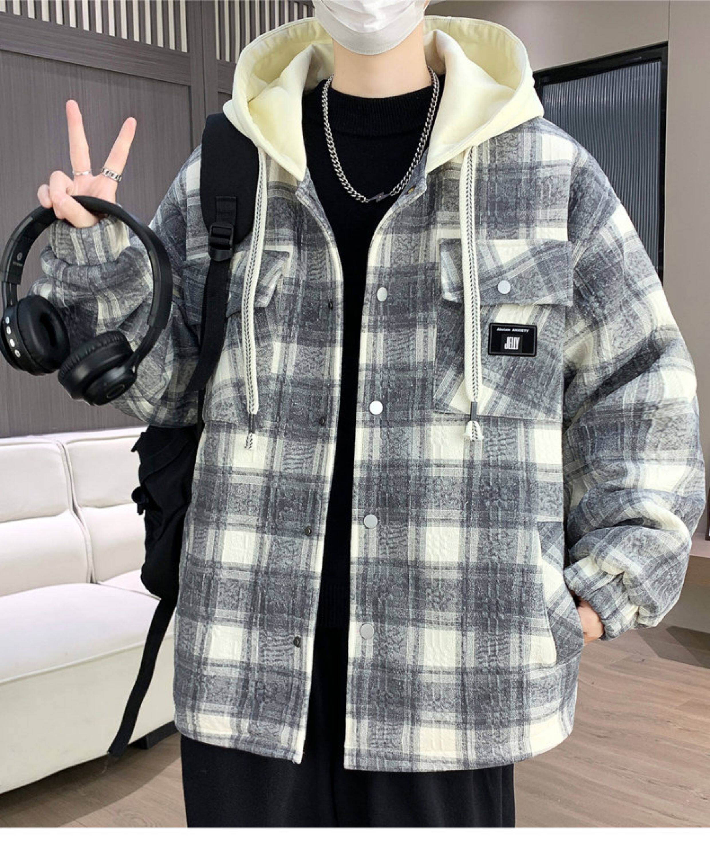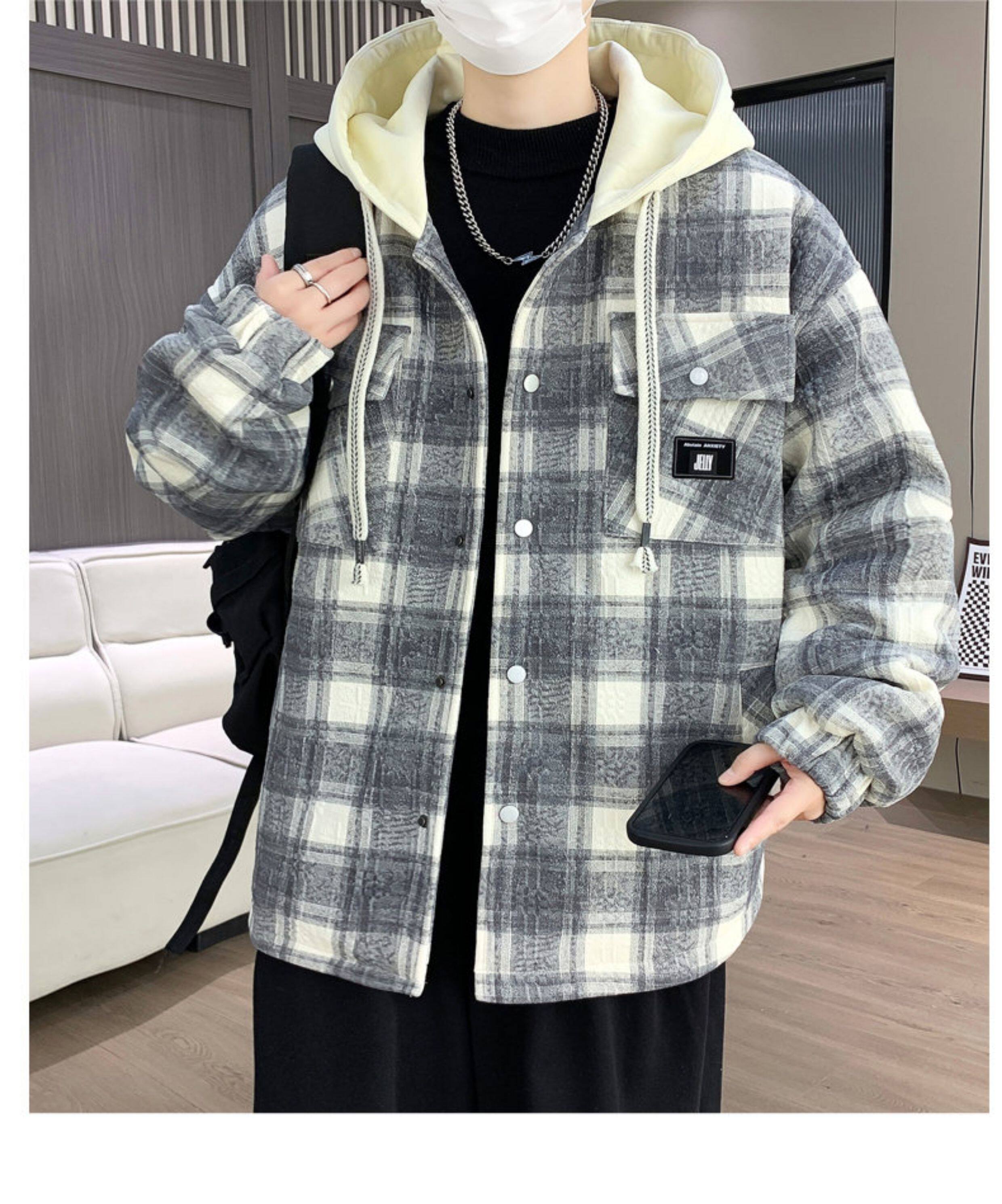 Winter New Hooded Plaid Fleece-Lined Thickened Jacket for Men, Teenagers, and Middle School Students, Warm and Stylish Parka