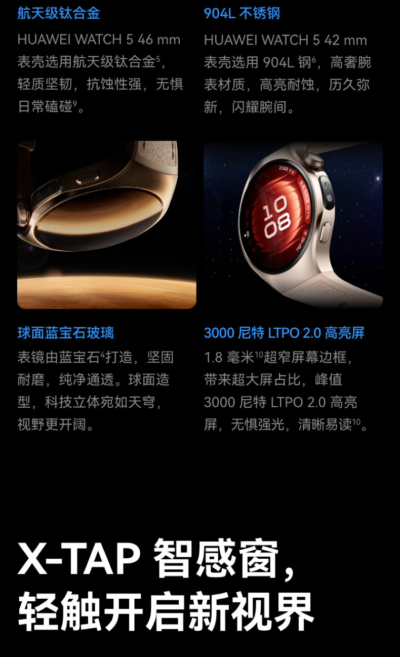 Appearance Color Huawei Watch 5 42mm Phantom Black,Huawei Watch 5 42mm Aurora Green,Huawei Huawei Watch 5 42mm Venus White,Huawei Watch 5 42mm Nebula Apricot,Huawei Watch 5 42mm Dawn Gold,Huawei Watch 5 46mm Sky Black,Huawei Watch 5 46mm Galaxy Blue,Huawei Watch 5 46mm Jupiter Brown,Huawei Watch 5 46mm Galaxy Purple,Huawei Huawei Watch 5 46mm Titanium Silver