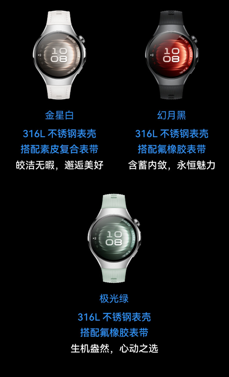 Strap Material Phantom Black, Aurora Green: Fluoroelastomer Venus White, Nebula Apricot: Tech Composite Leather Dawn Gold: Titanium