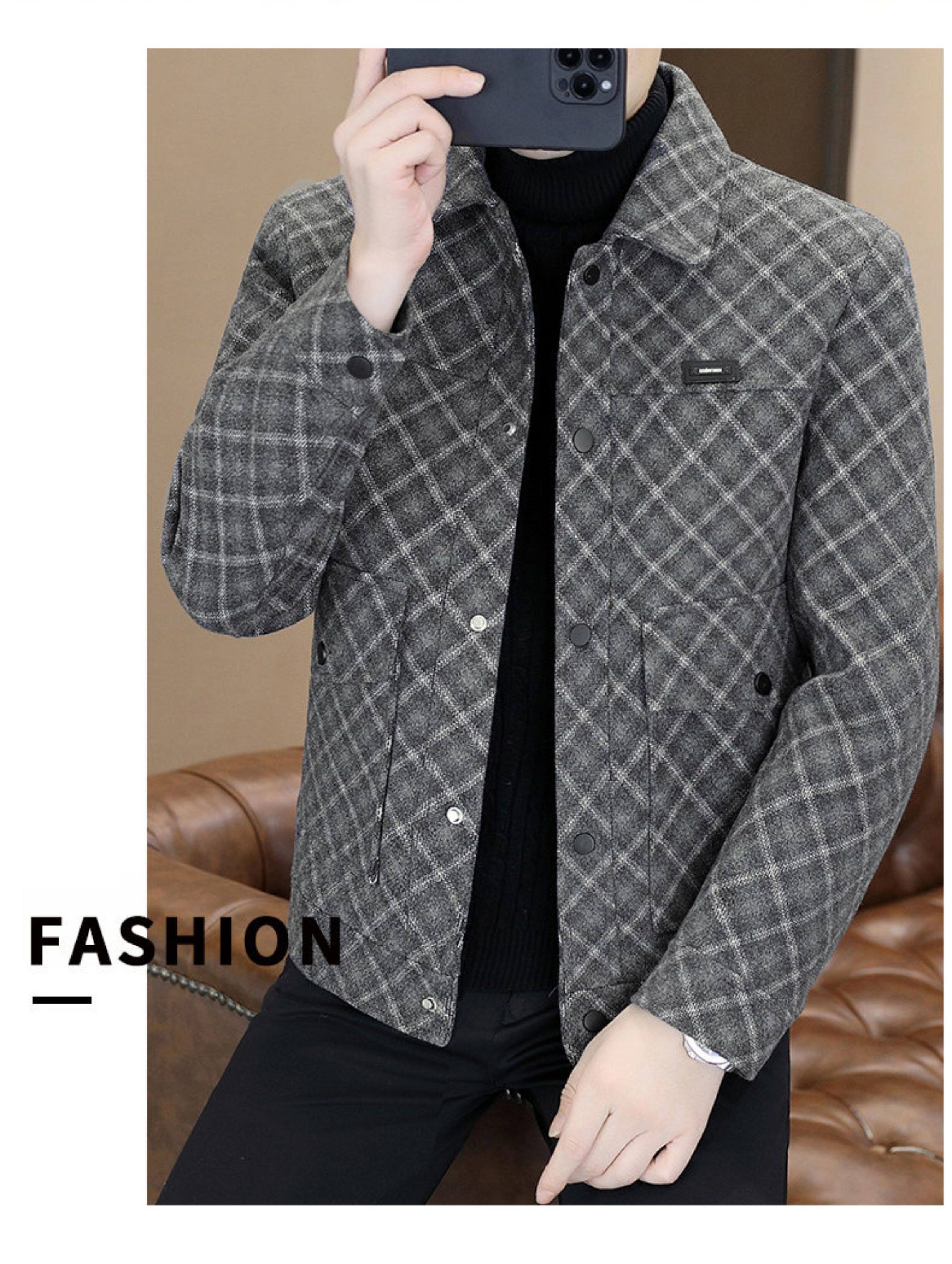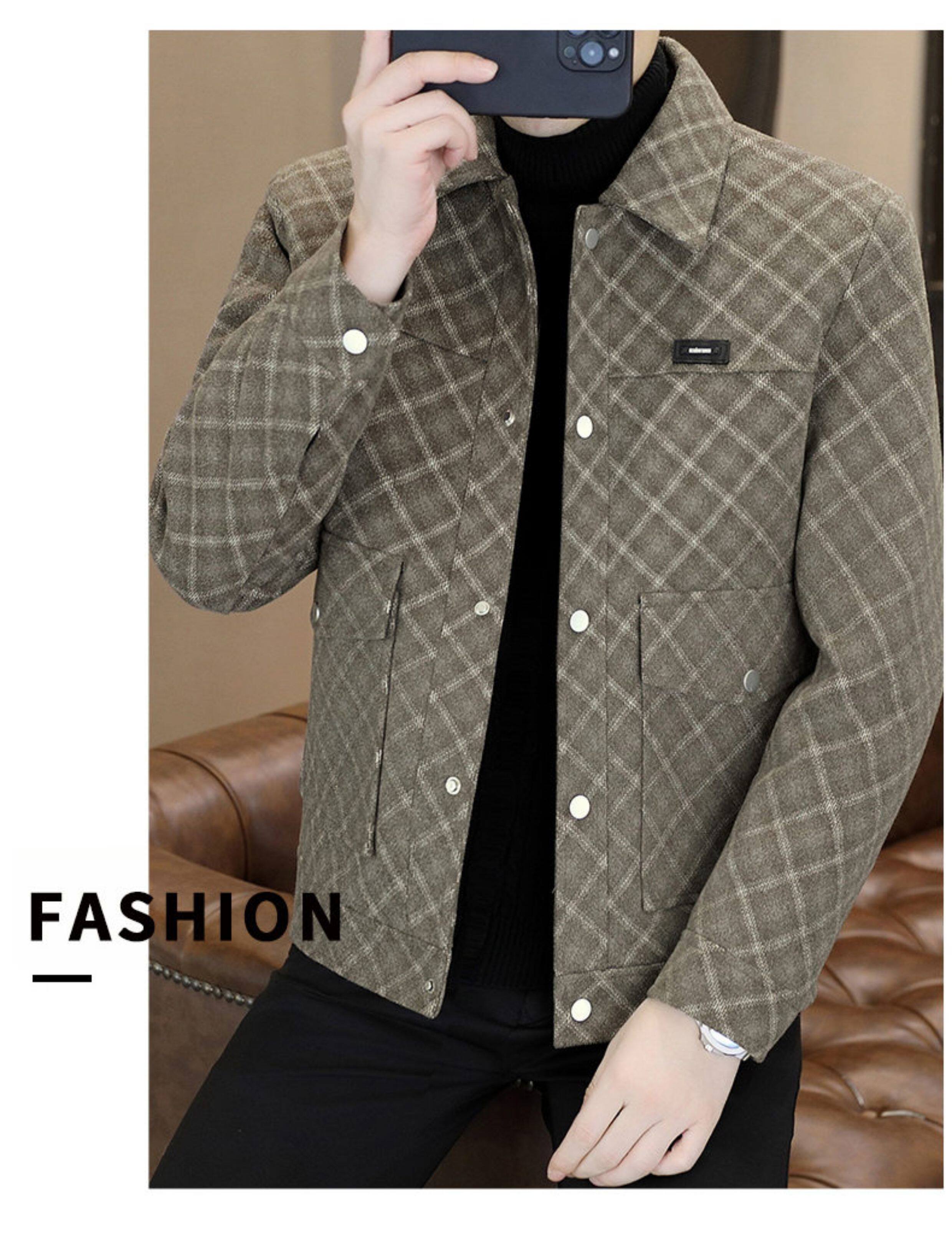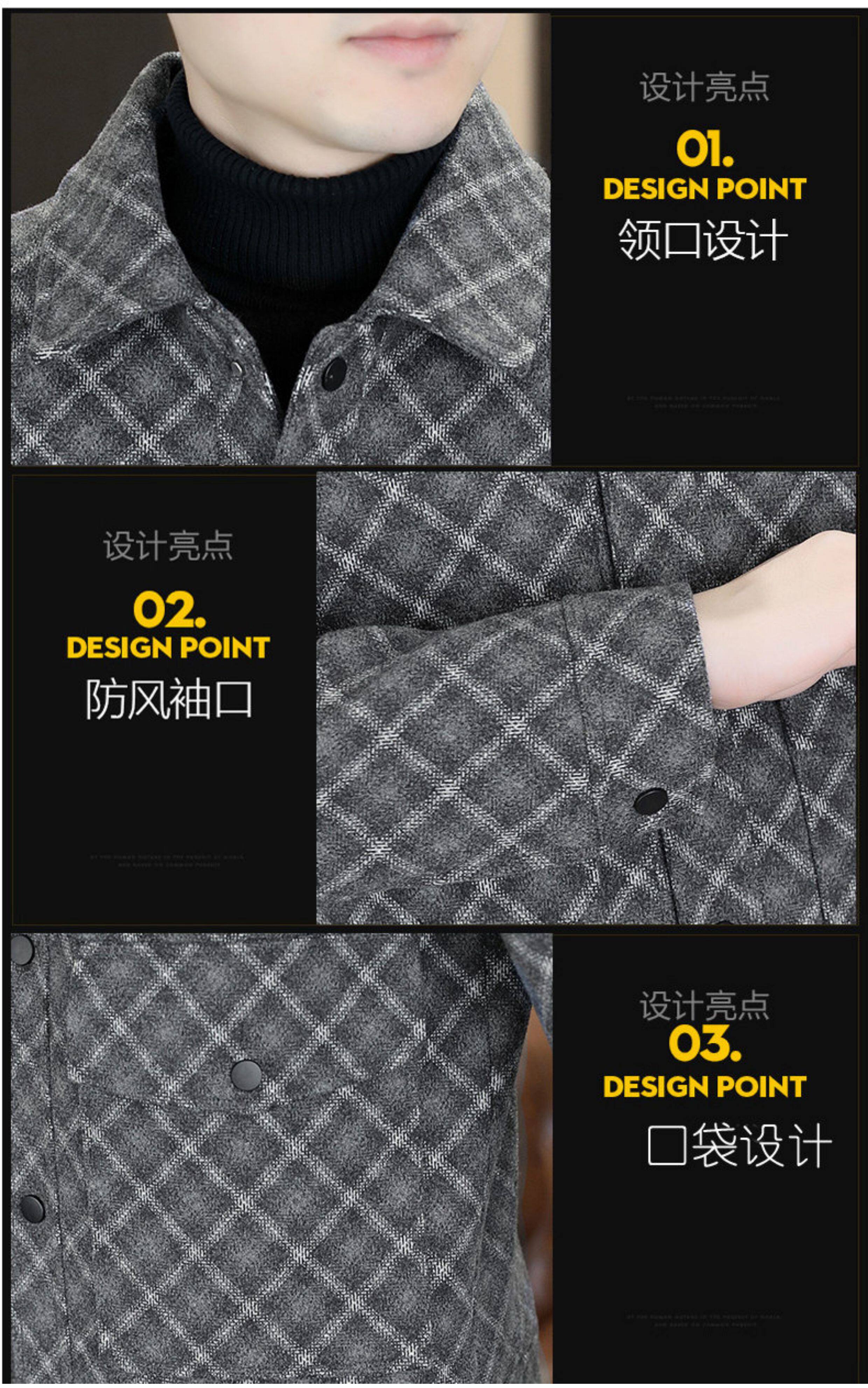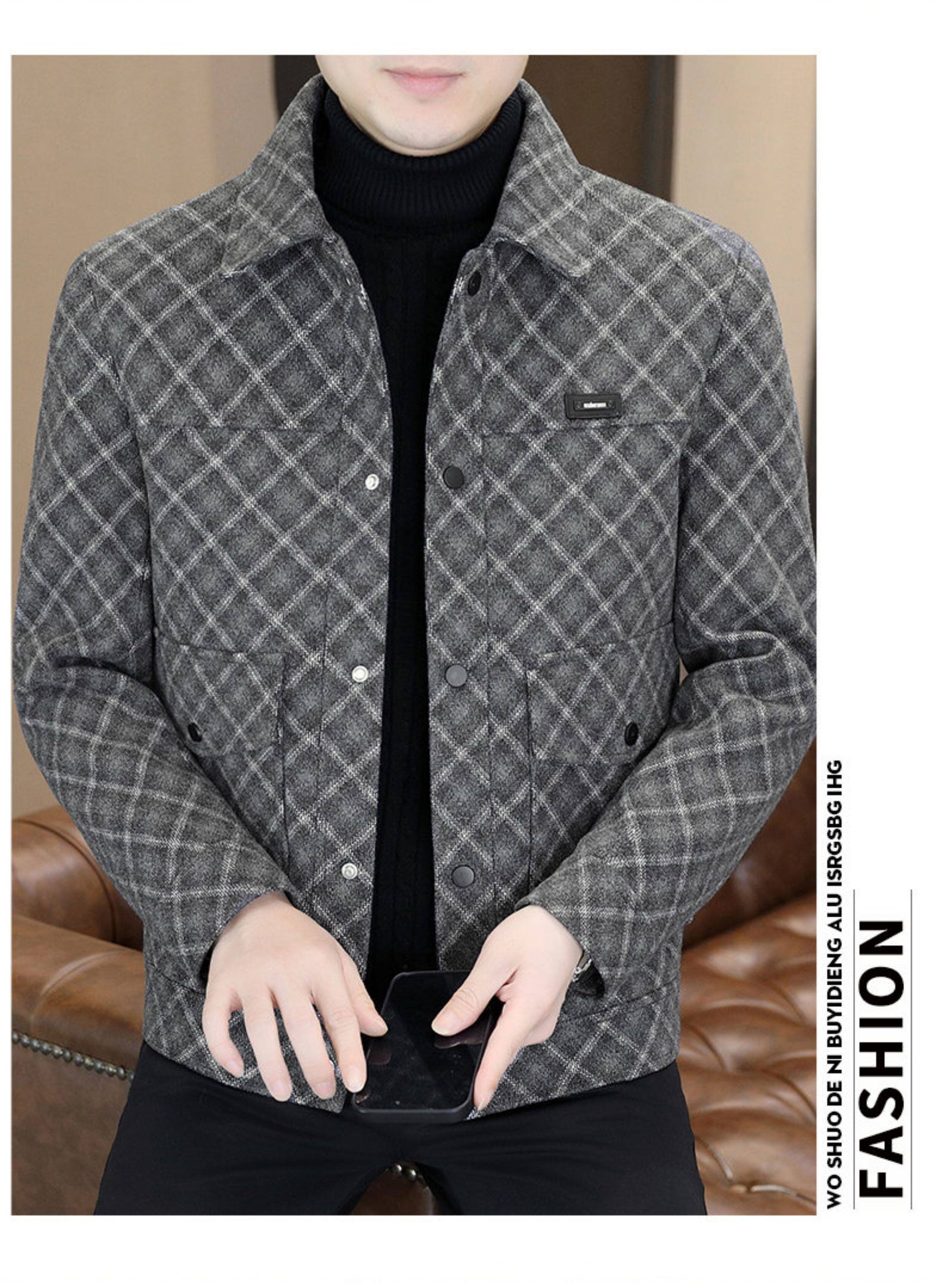 2025 Winter New Plaid Lapel Fleece-Lined Thickened Woolen Coat for Men, Slim Fit and Warm Overcoat for Young and Middle-Aged Men