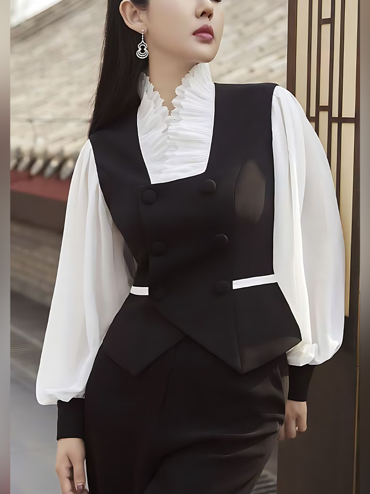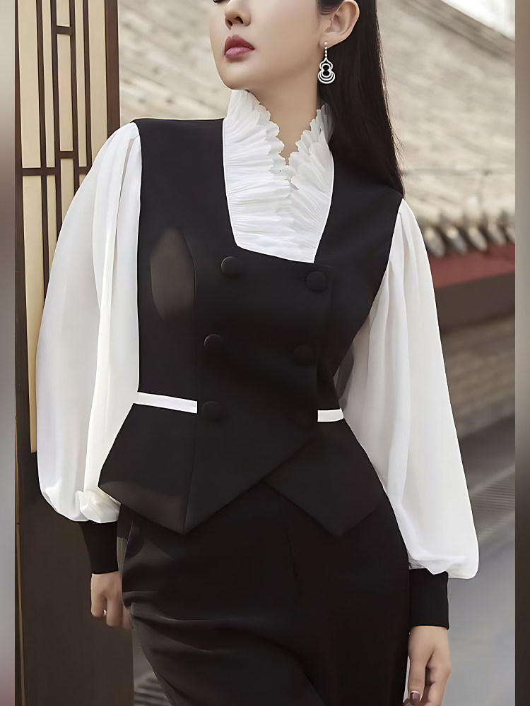 Mijie 2025 autumn new style black fake two-piece stand-up collar vest shirt female temperament high-end slim top