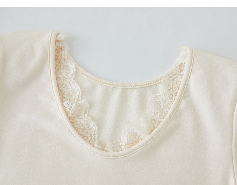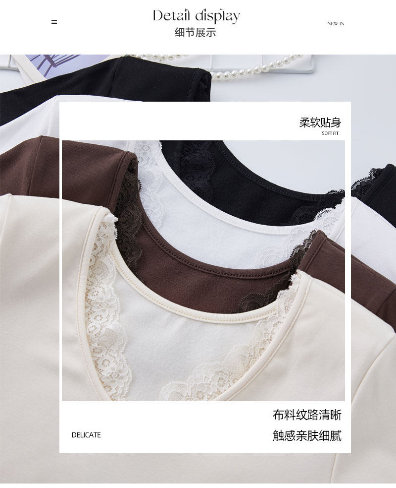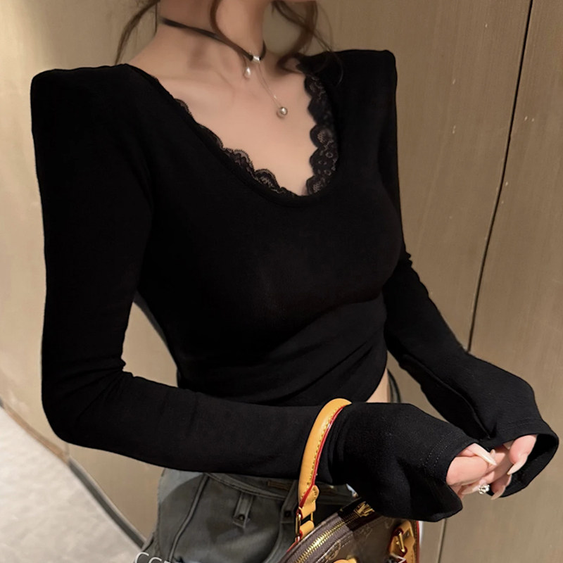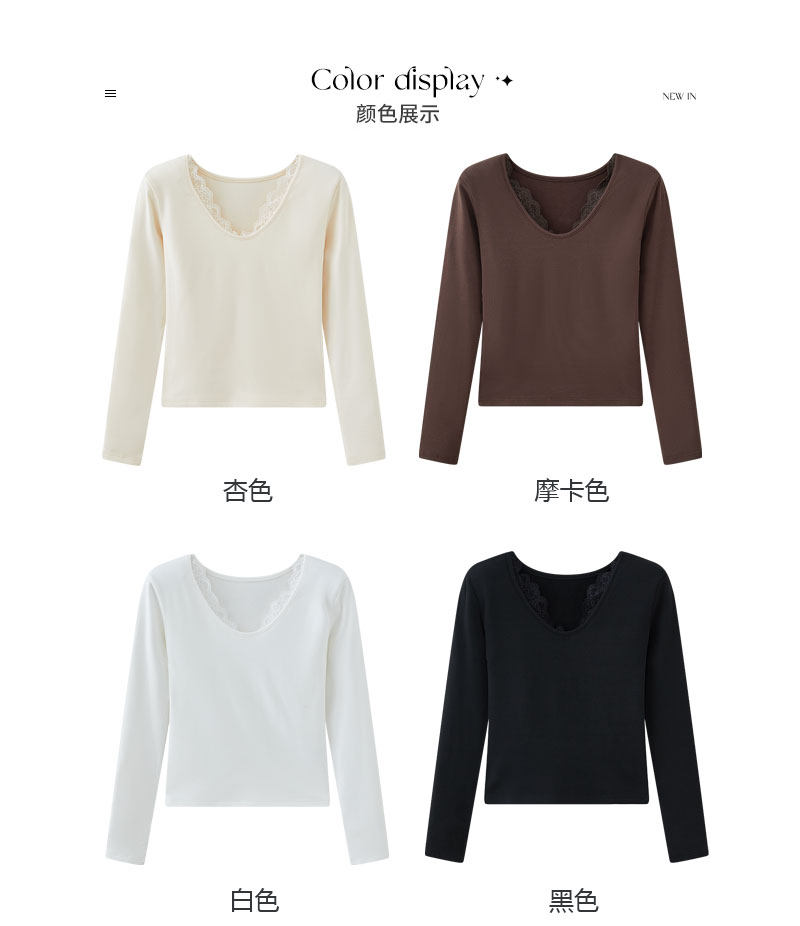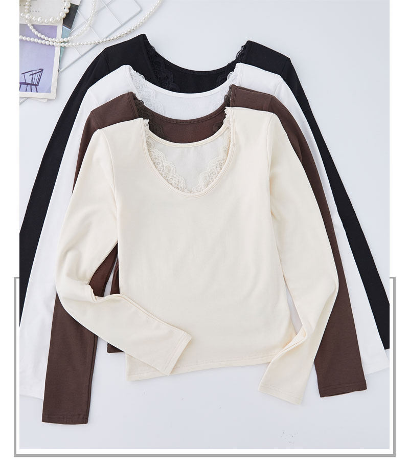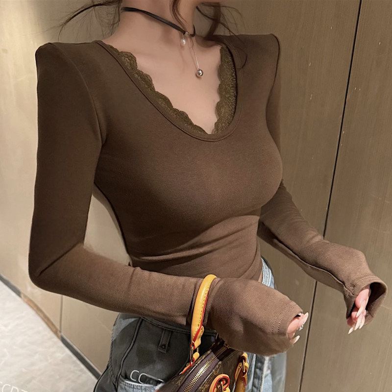 Spicy Girl Lace Patchwork V-Neck Melard Mocha Color Long-Sleeve T-Shirt for Women, New Winter Style with Fleece and Shoulder Pads, Base Layer Top for Women