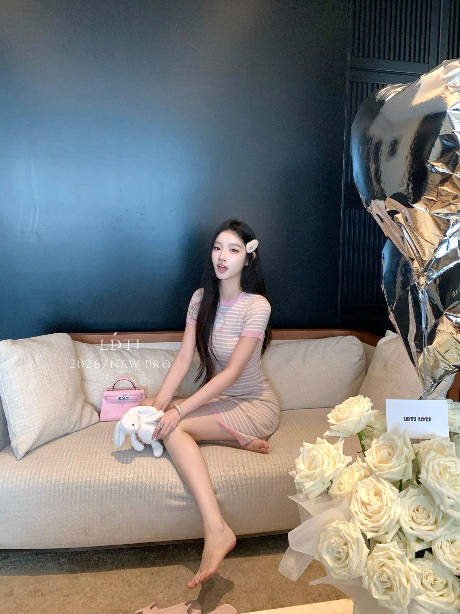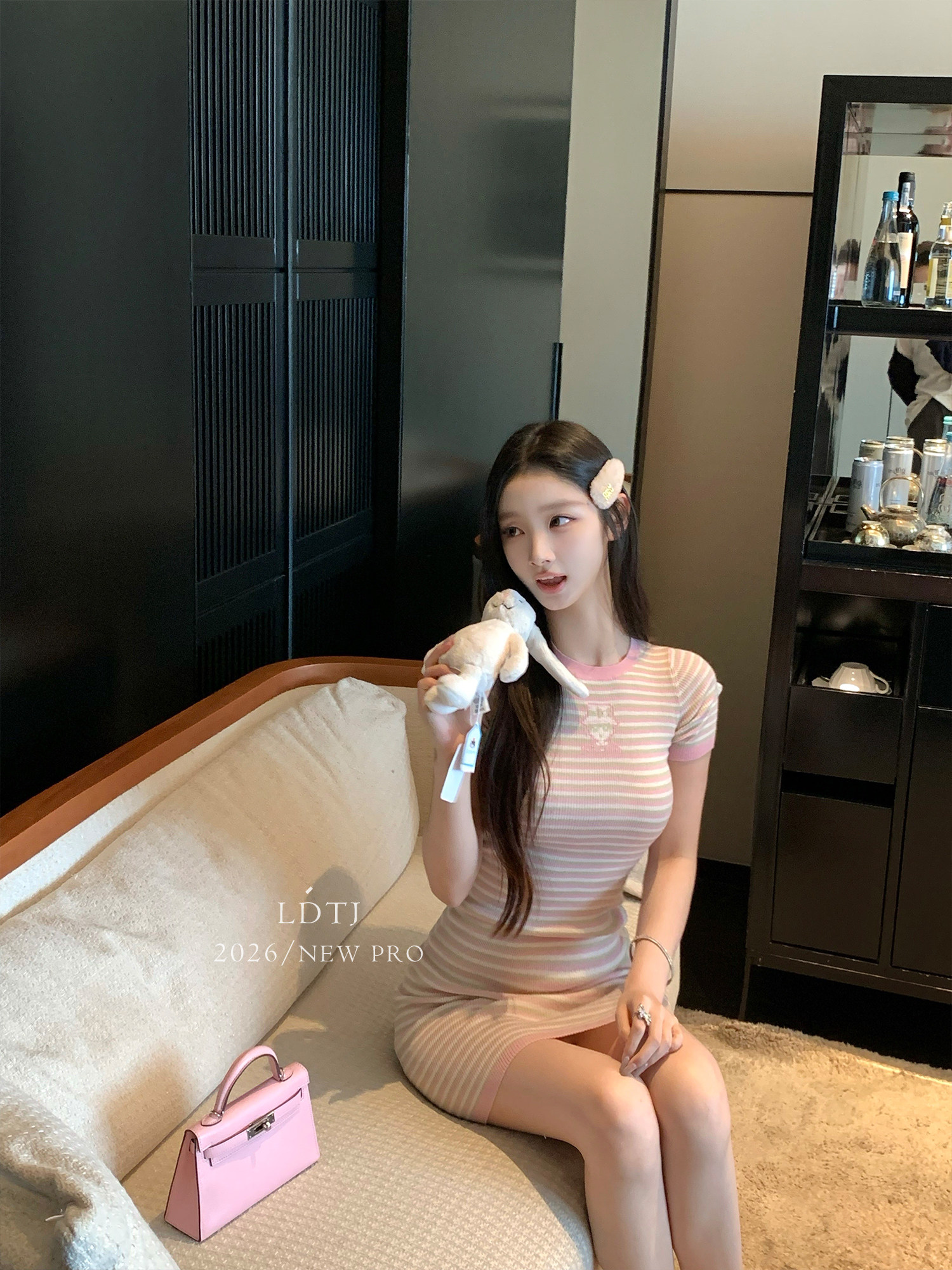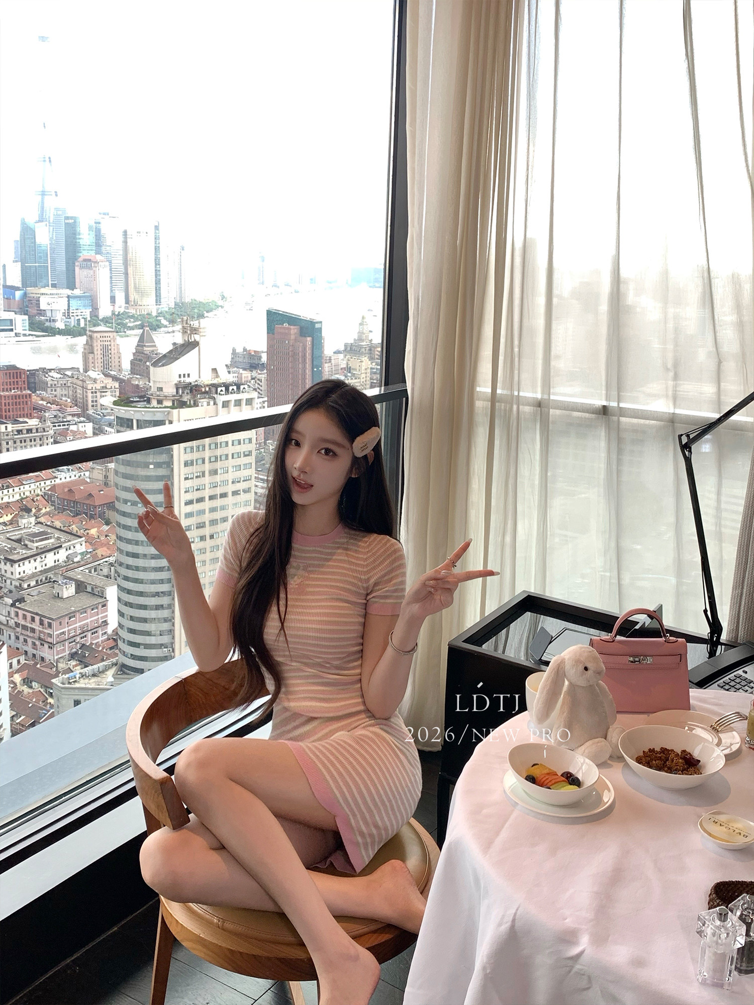 Ldtj Haute Couture "Jenny Candy House" Pink Striped Pure and Girly Chanel-Style Wool Knit Dress