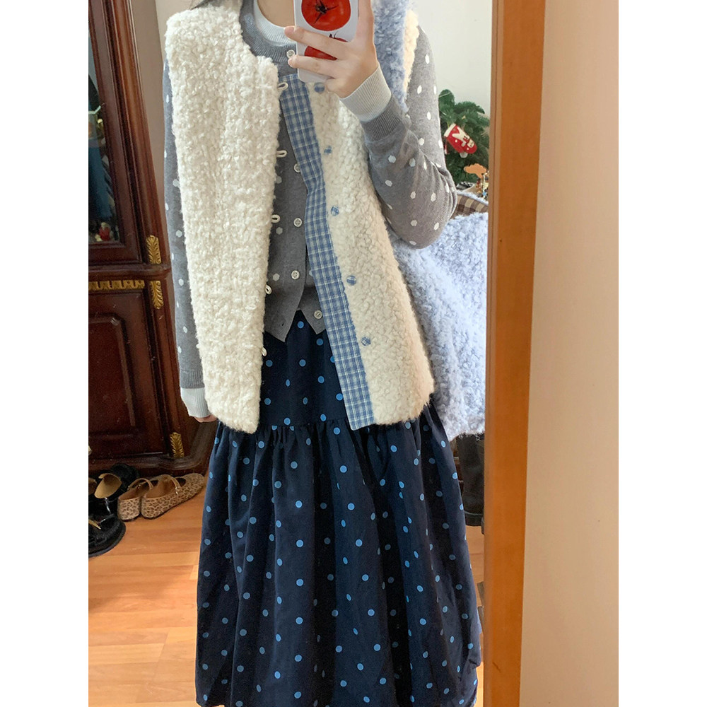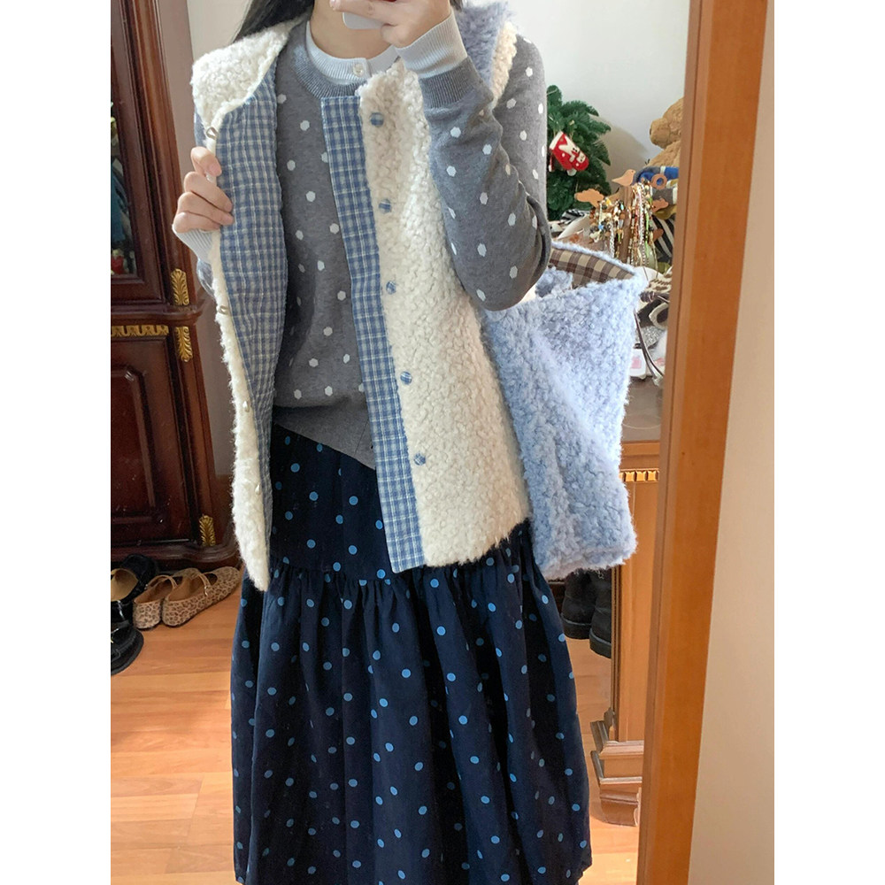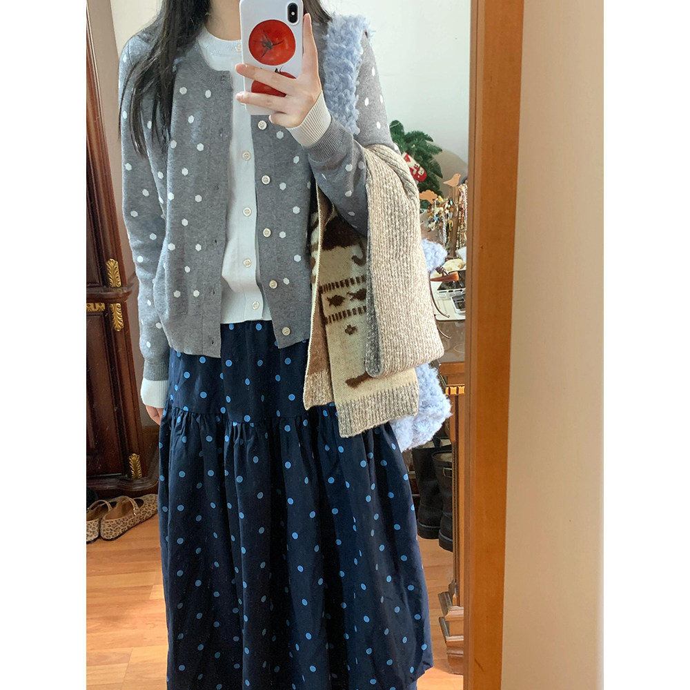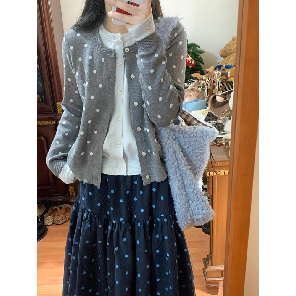 French Retro Polka Dot Color-Block Knit Faux Two-Piece Cardigan for Women, Spring and Autumn Sweater Jacket, Gray Slimming Top for Layering