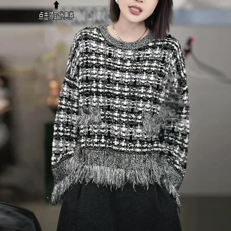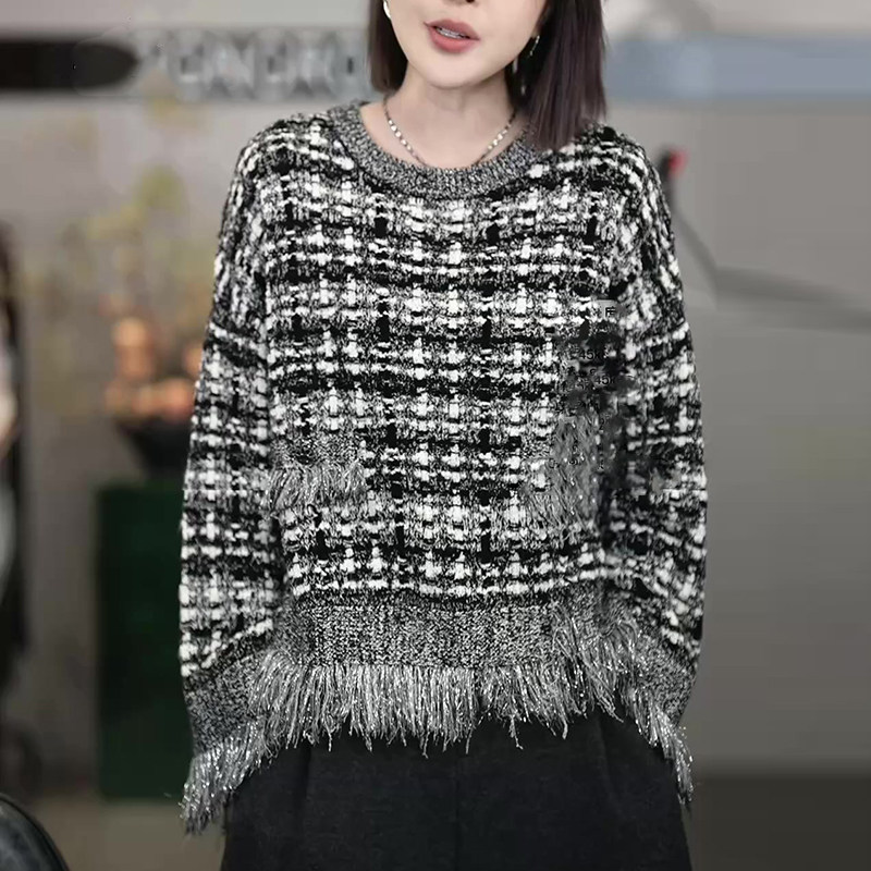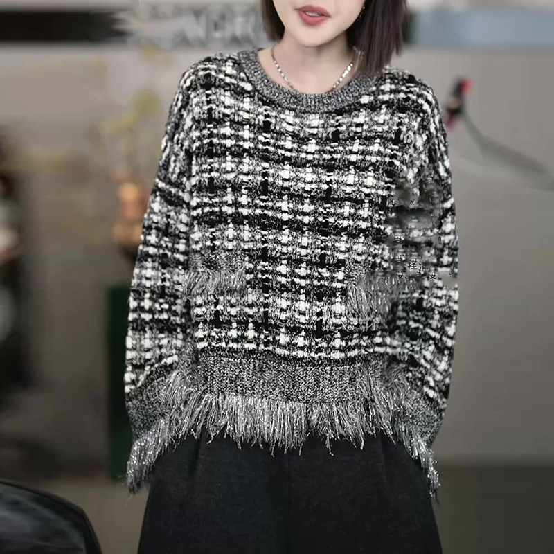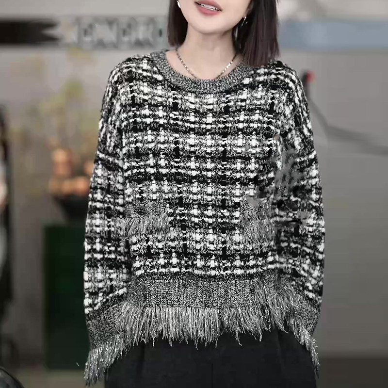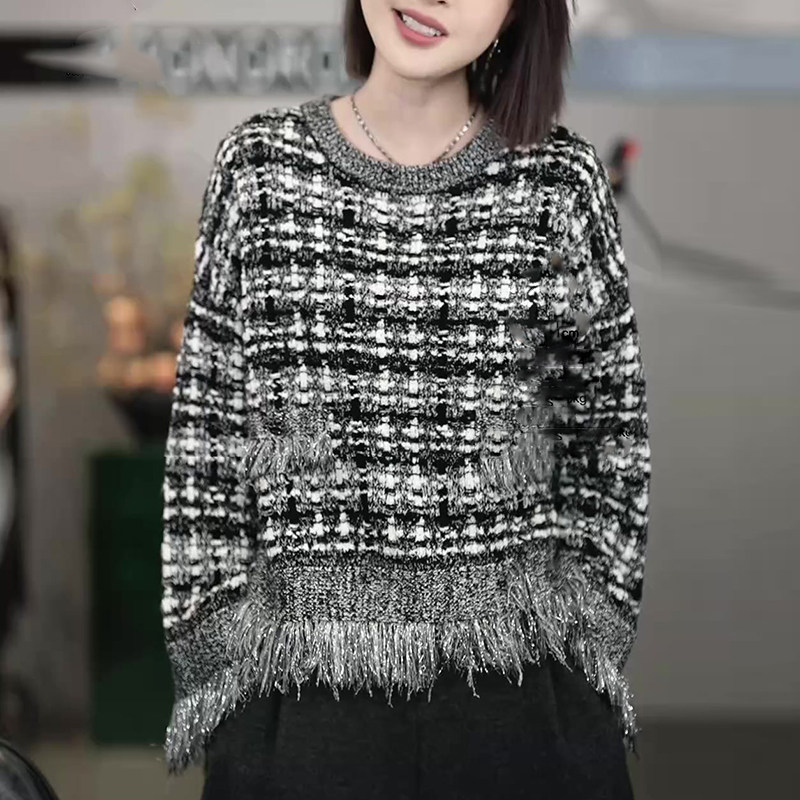 European high-end light luxury houndstooth fringed long-sleeved sweater for women 2025 autumn and winter new style fashionable top