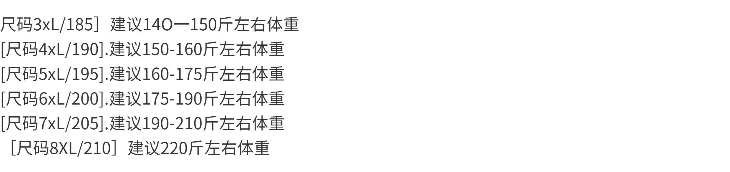 Size 190 (4XL),195(5XL),200 (6XL),205 (Size 7XL),210 (8XL)