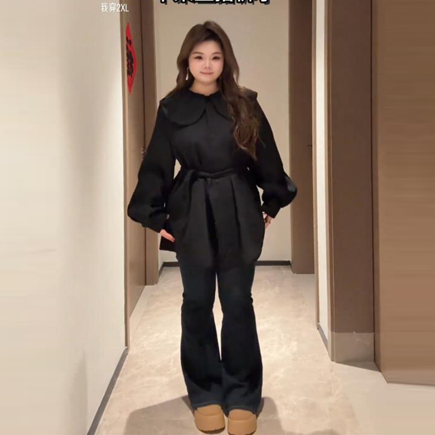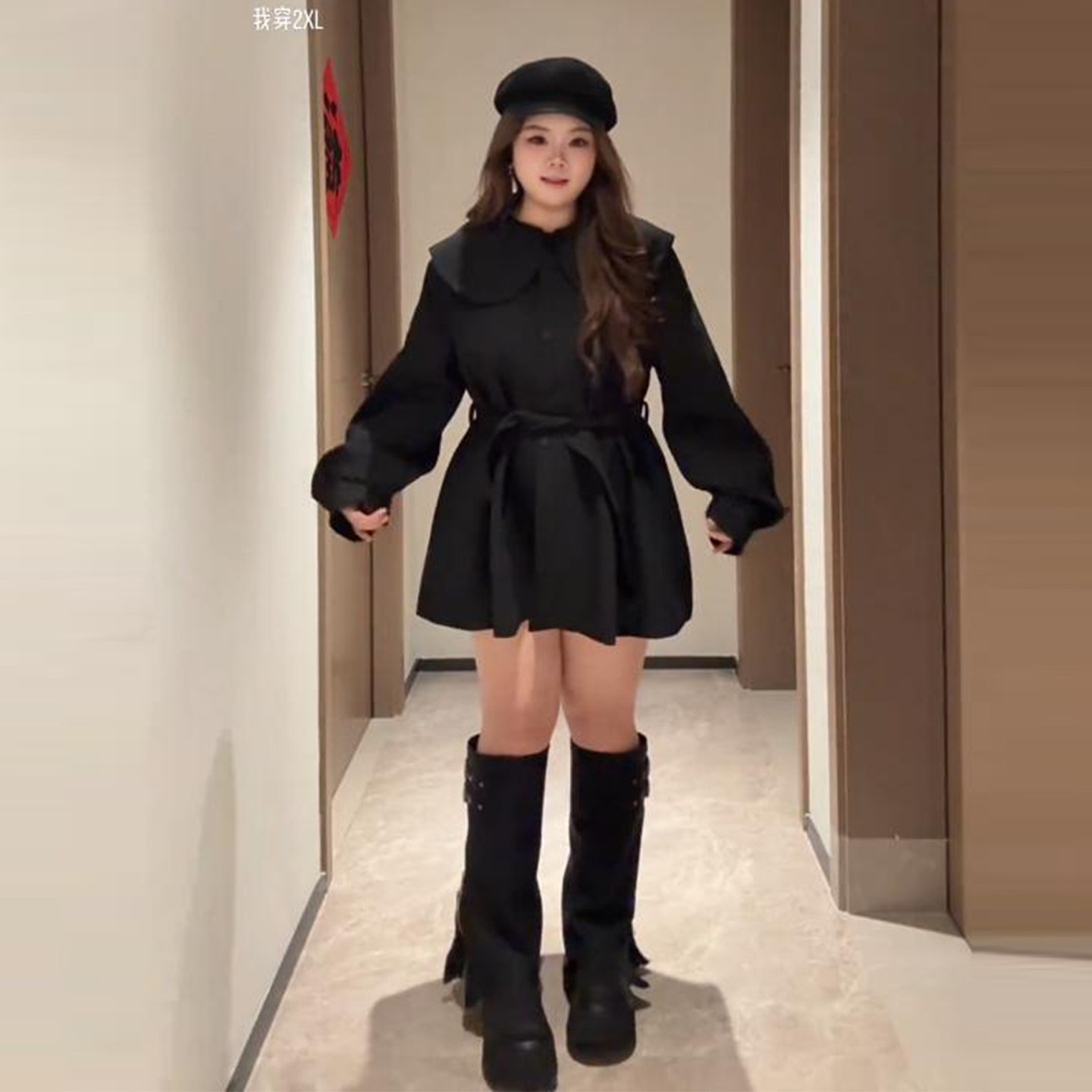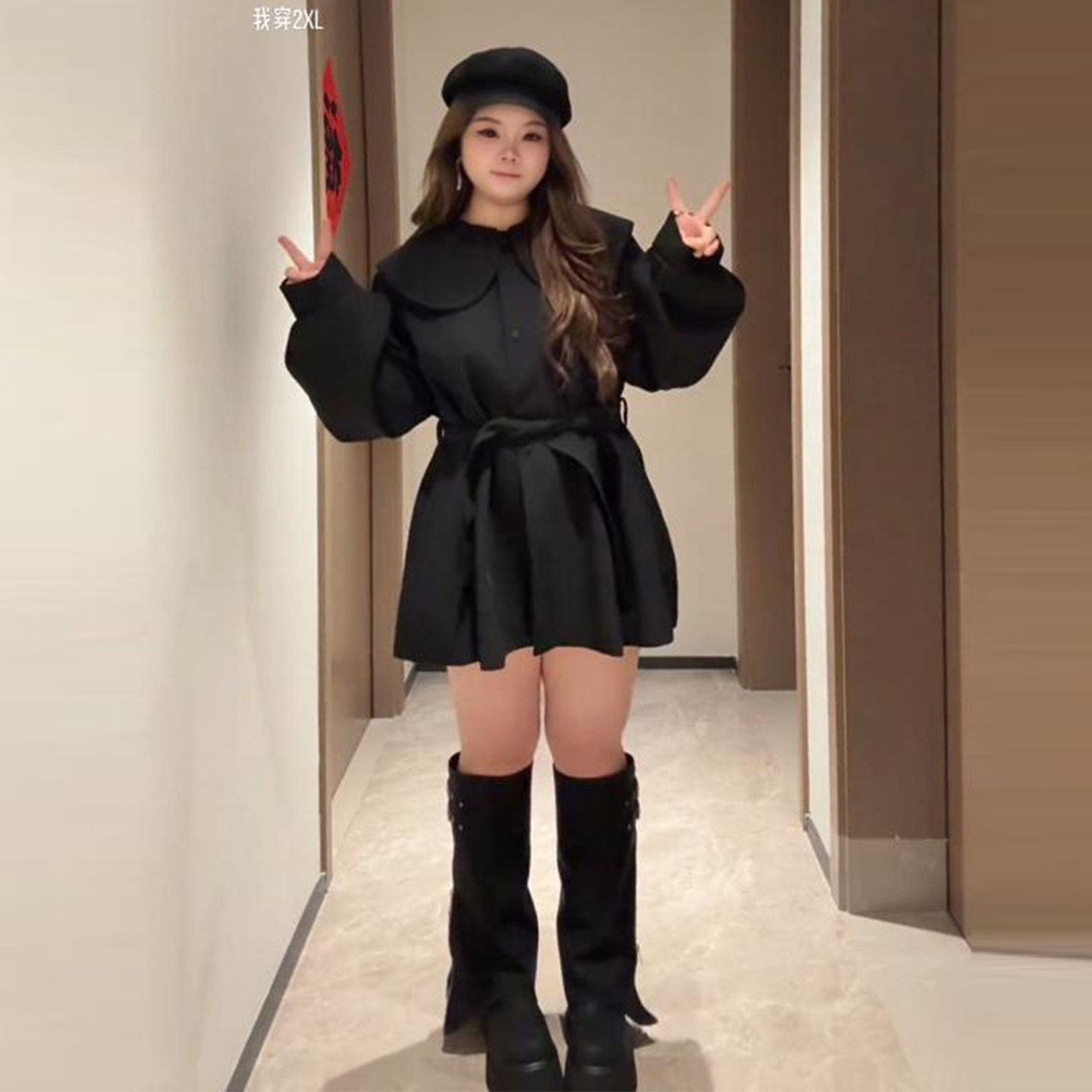 Plus-Size Lace-Up Waist-Cinching Trench Coat for Women, Autumn and Winter, Slimming, Loose, Doll Collar, Sweet, Versatile, Short Coat