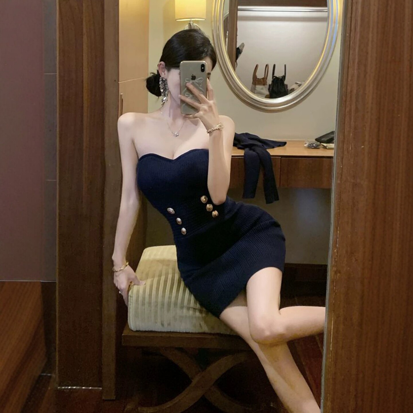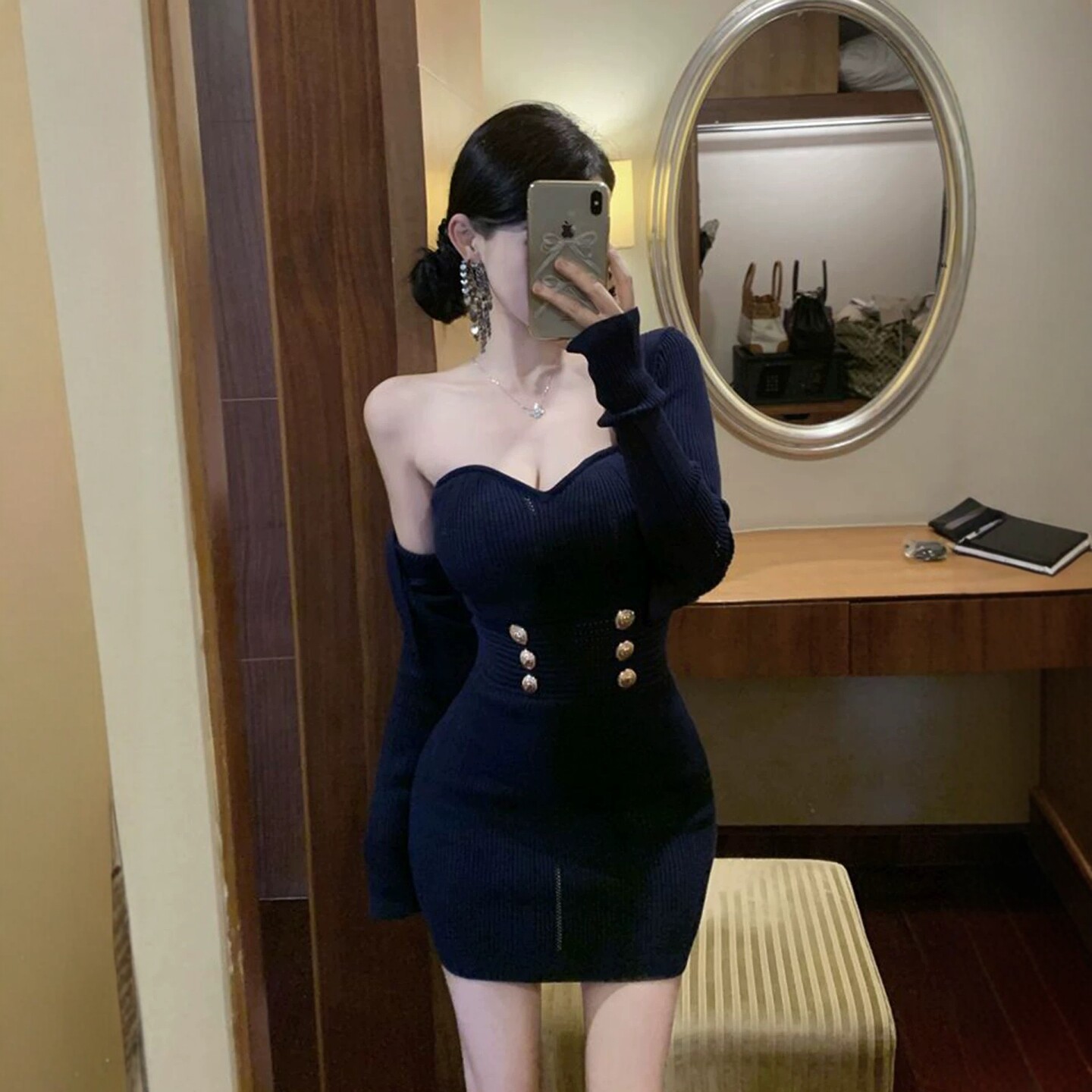 Elegant and Mature Style Black Strapless Knitted Dress with Shawl Cardigan, Waist-Cinching Bodycon Skirt Two-Piece Set