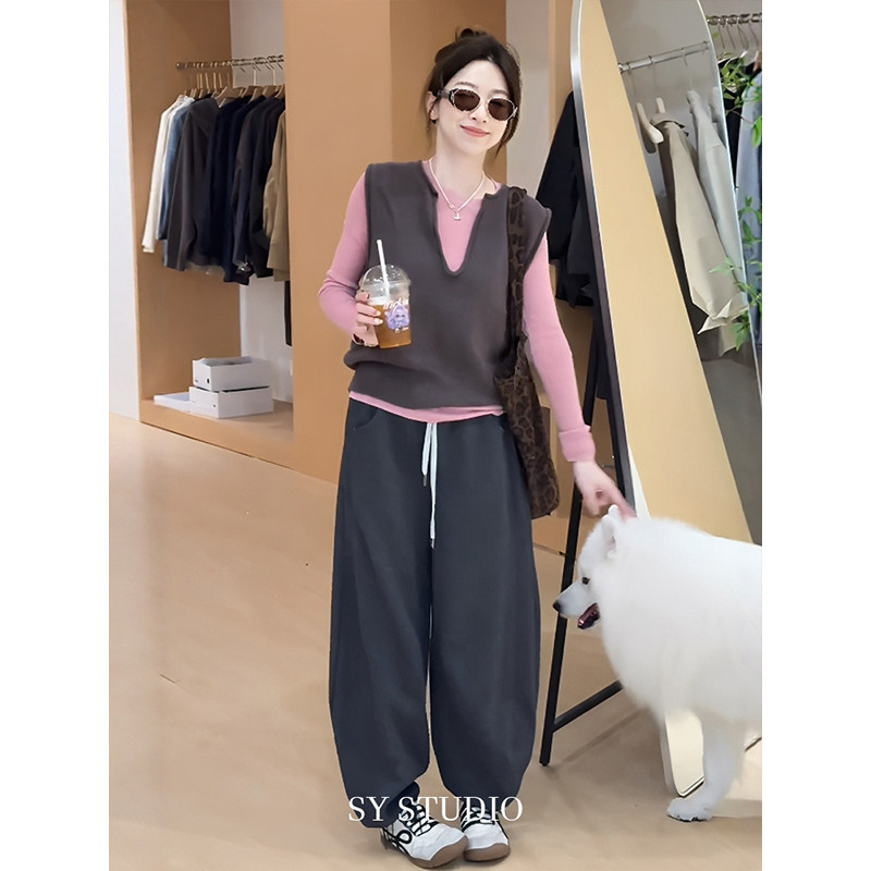 Huge-looking two-piece early autumn Korean-style versatile long-sleeved inner layering shirt and wide-leg casual pants three-piece age-reducing set