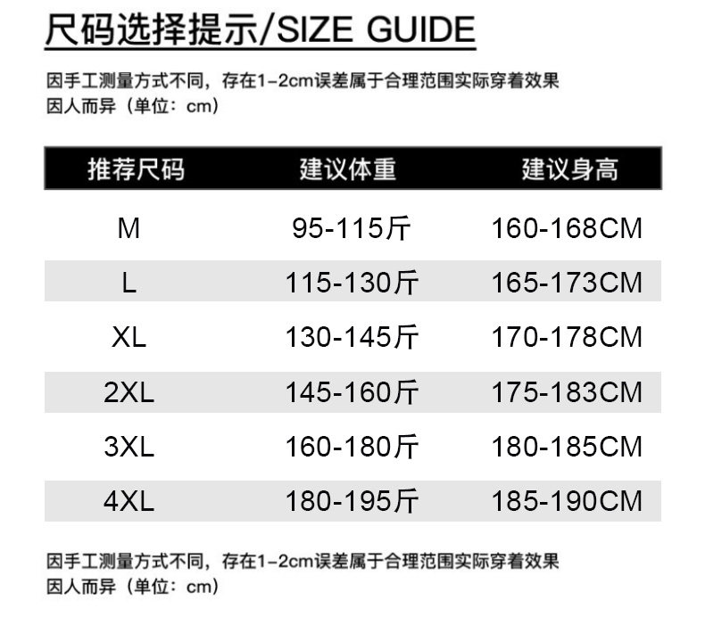 China (cm) 165 / 88-90 170 / 96-98 175 / 108-110 180 / 118-122 185 / 126-130