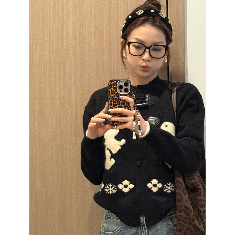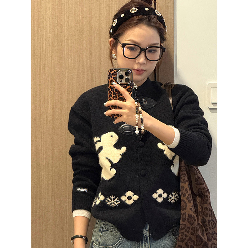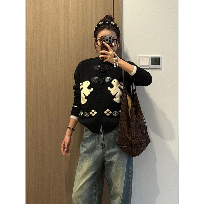 American-Style Sweet and Cute Rabbit Round-Neck Sweater for Women, New Spring and Autumn Style, Lazy Style, Loose Zipper Cardigan Top, Trendy
